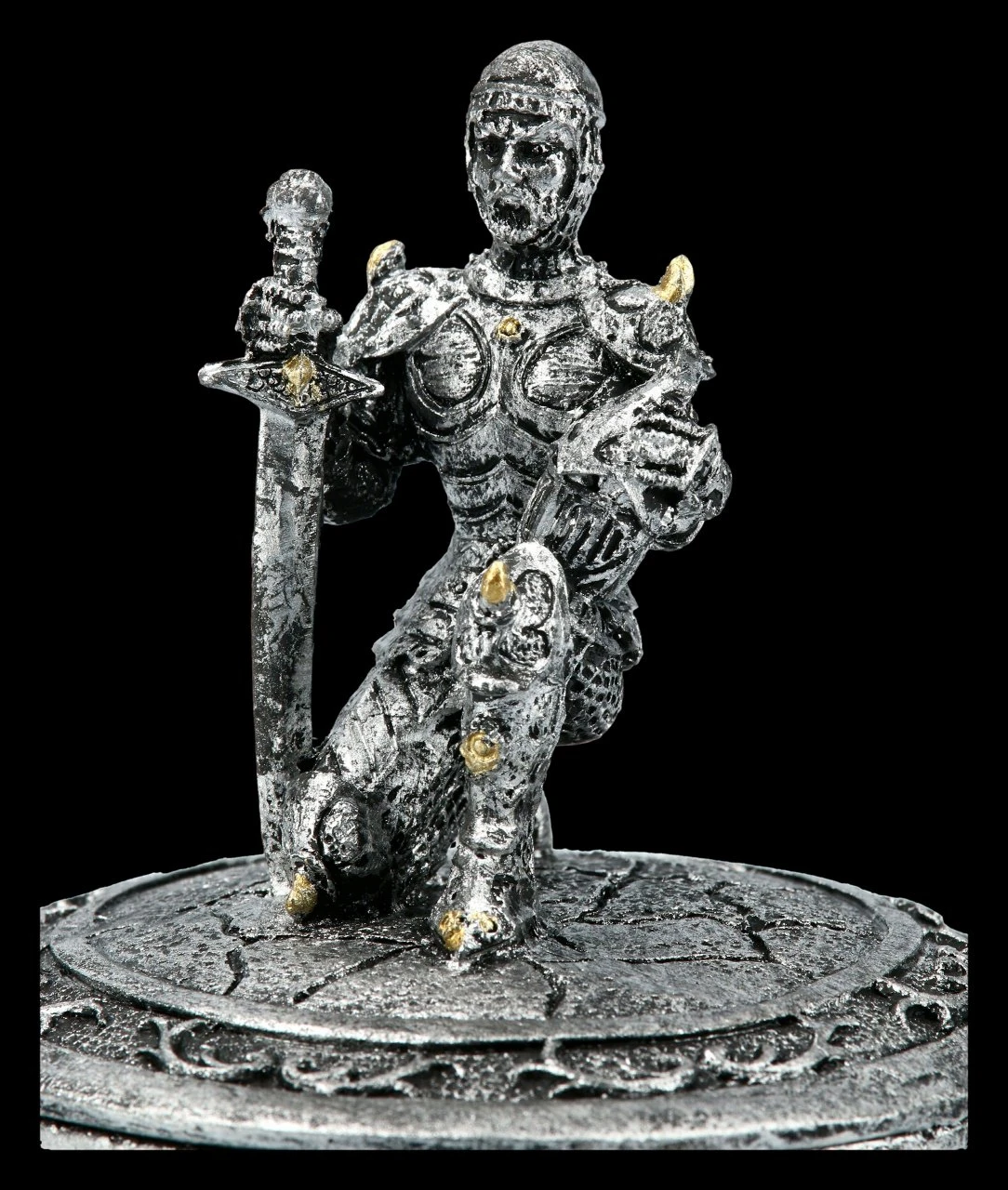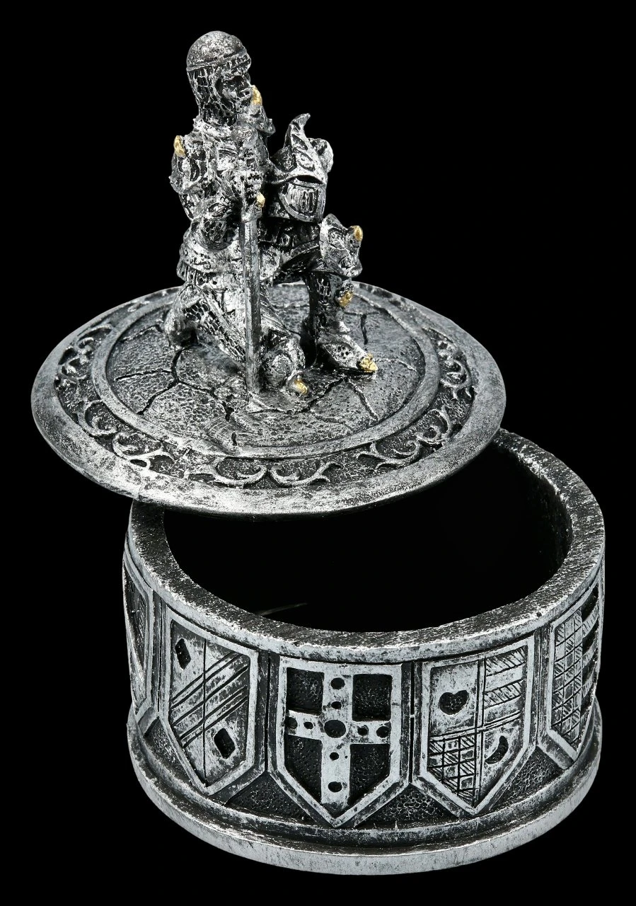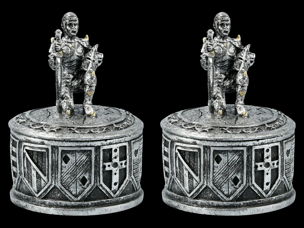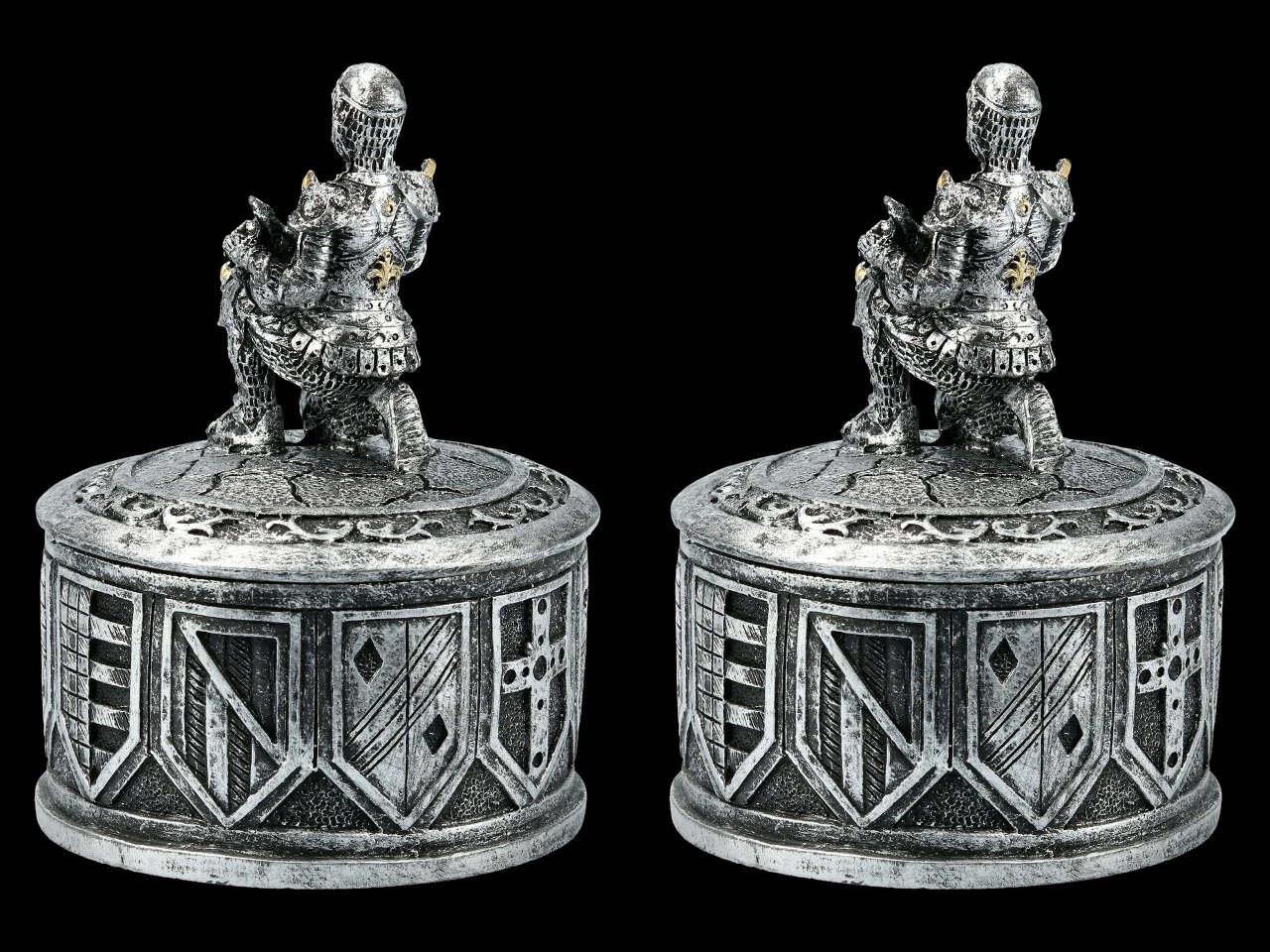 Sie möchten sich mit Ihrem Ritter ein Geheimnis teilen – diese tolle Ritter Schatulle im 2er Set ist dazu perfekt geeignet. Die beiden Schatullen aus Kunststein (Polyresin) sind detailreich gearbeitet und edel silberfarben handbemalt. Jede der beiden Schatullen hat eine Höhe von 10,5 cm, wobei der Ritter 5,5 cm groß ist. Die Breite und die Tiefe der Schatullen ist jeweils 7 cm und die Innenmaße sind H 3,5 cm / D 6,5 cm und bieten auch Platz z.B. für ein besonderes Schmuckgeschenk.