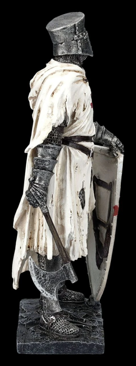 Eine wunderbare Ergänzung für jede Rittersammlung ist diese 19 cm hohe, 10 cm breite und 6 cm tiefe Figur eines Templers. Breitbeinig sicher steht der Ritter in seinem weißen Umhang mit dem roten Kreuz auf der Brust auf seinem Standplatz. In der rechten Hand hält er eine Axt und mit der linken das weiße Schild mit rotem Kreuz, das vor seinen Knien noch fest am Boden steht. Der Kopf mit dem geschlossenen Ritterhelm ist zur Seite gedreht, so dass es wirkt, als würde er auf seinen Befehl zum Angriff warten. Die Figur des Templers mit der Axt wurde detailreich aus handbemaltem Kunststein (Polyresin) gefertigt und ist ein fantastisches Geschenk für Templer und Ritter passt hervorragend zu den weiteren Templer-Figuren aus unserem Shop.