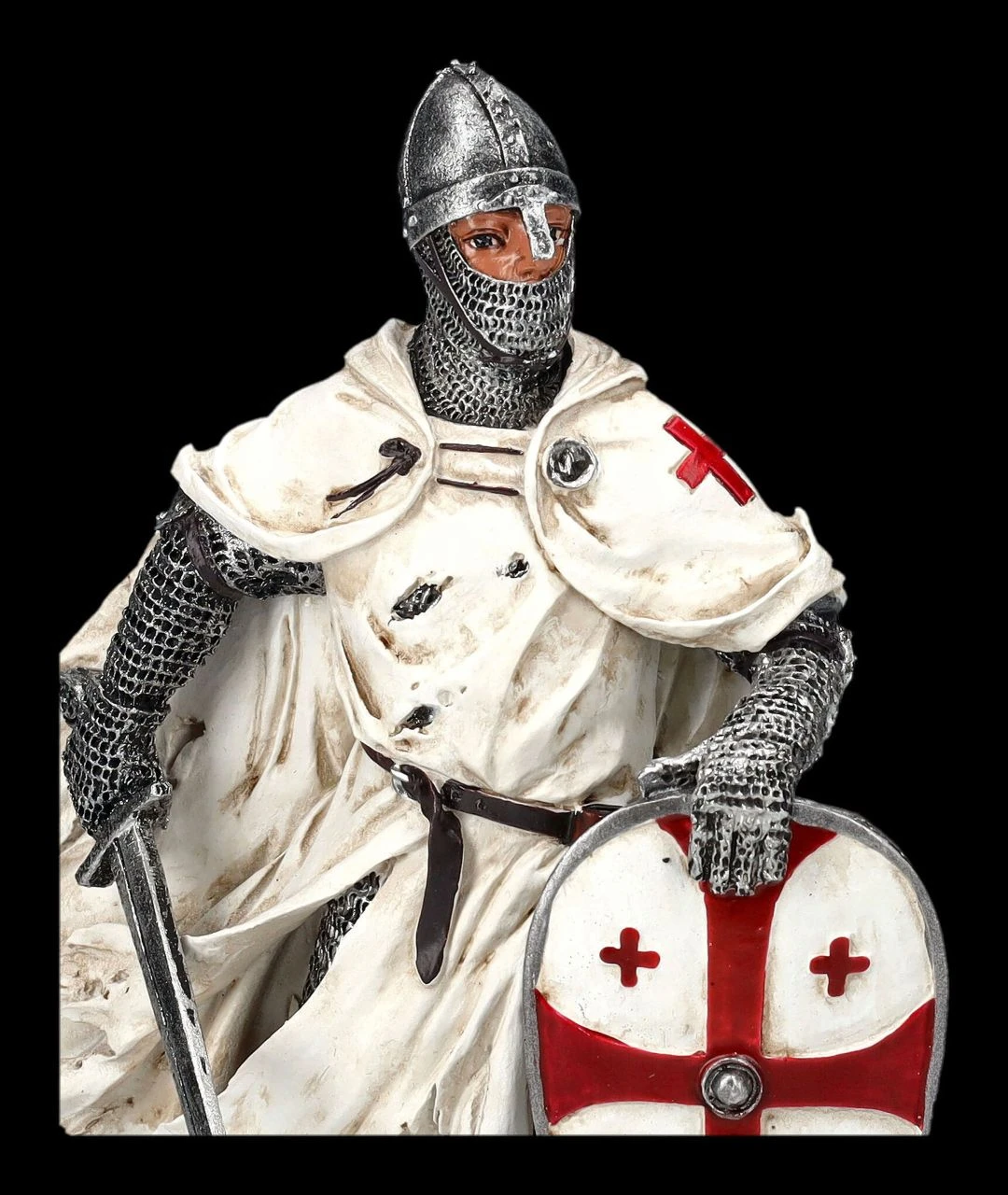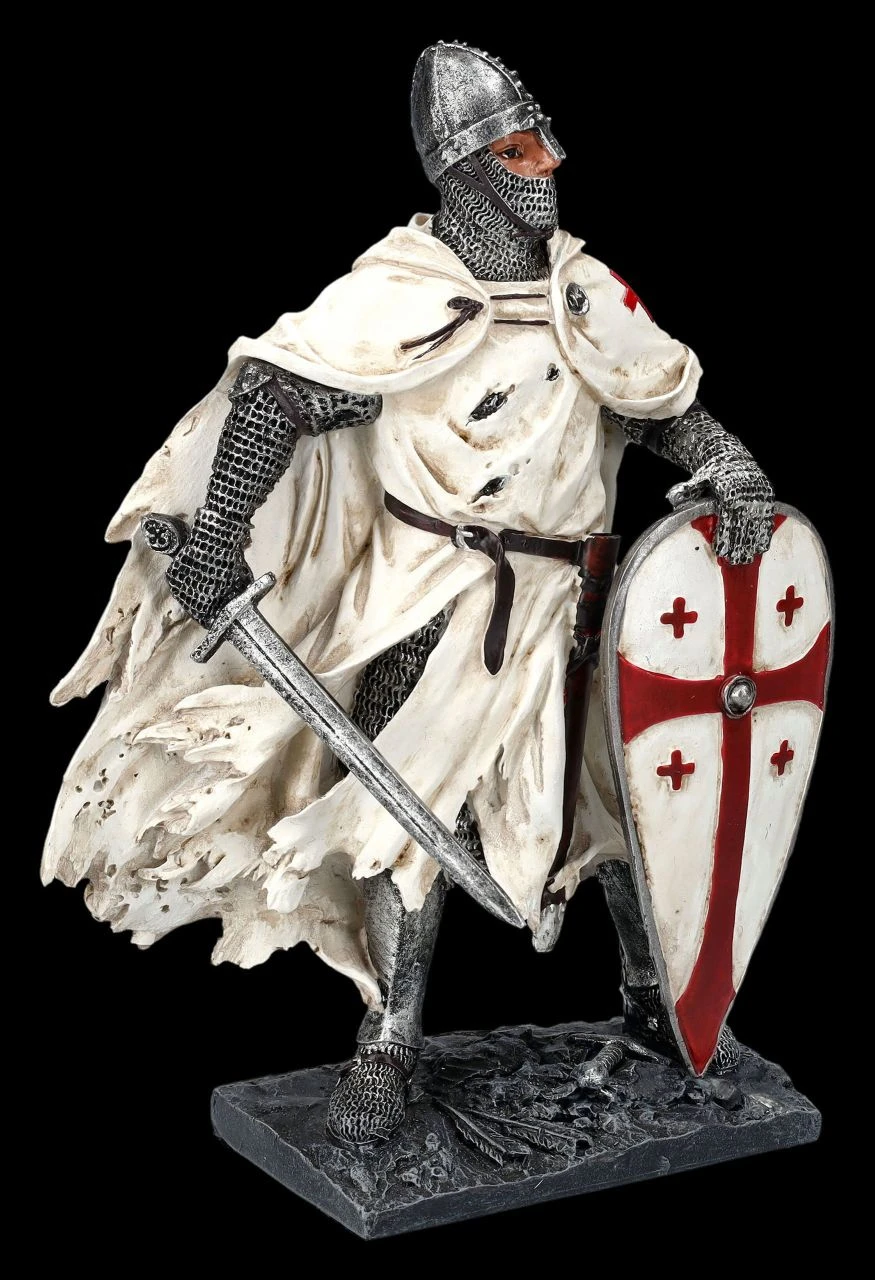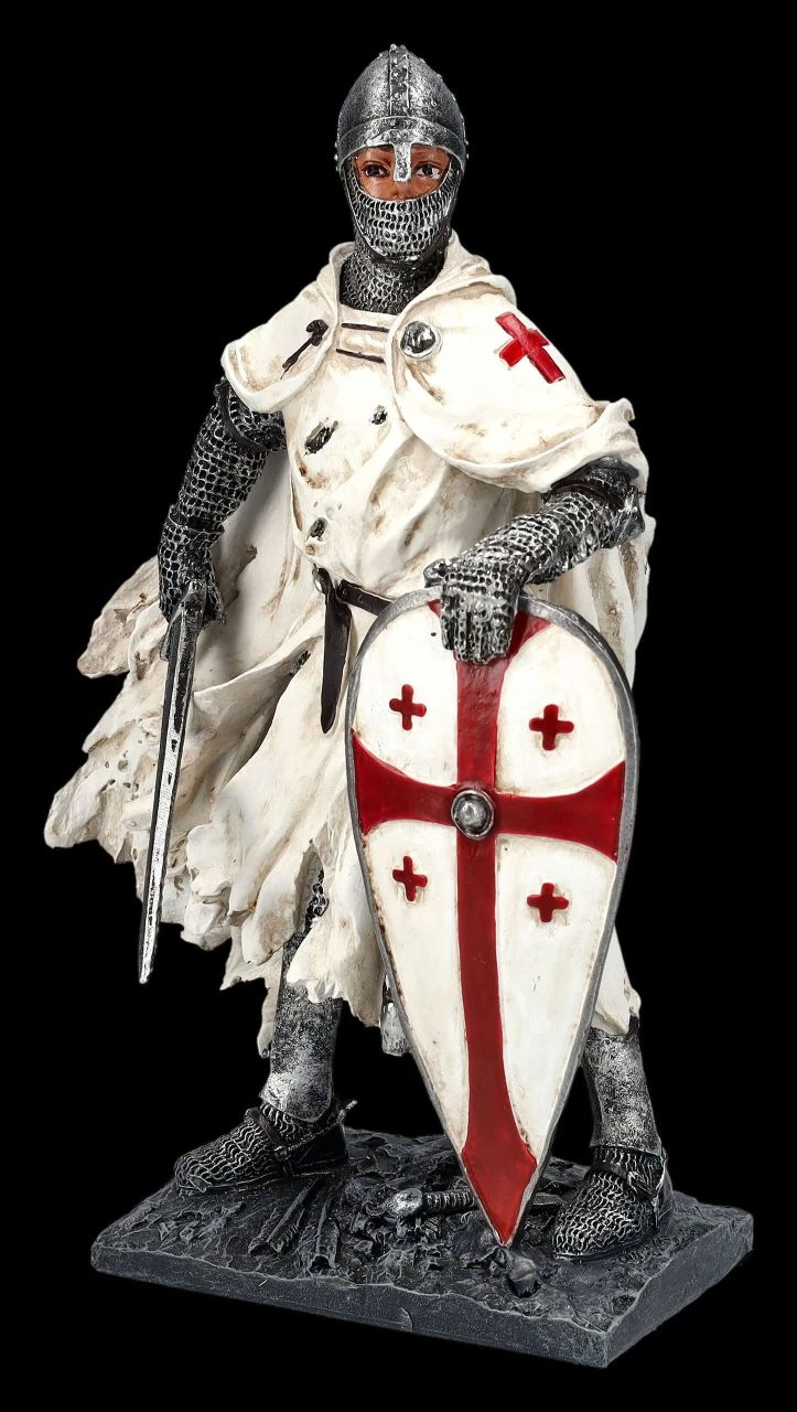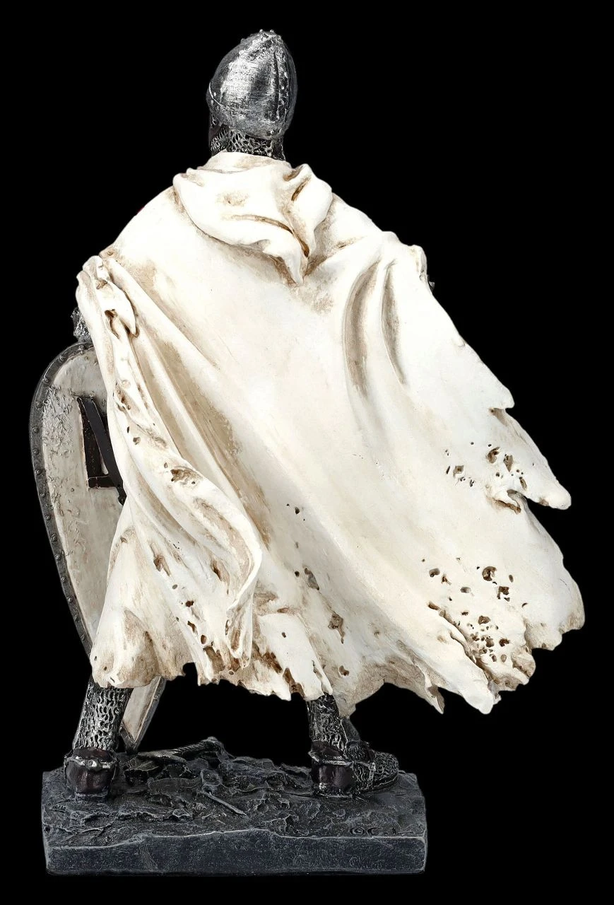 Mit wehendem weißen Umhang mit einem roten Kreuz auf der Schulter scheint der Templer auf einem von starken Stürmen umwirbelten Felsen zu stehen. In der rechten Hand hält er einsatzbereit sein Schwert und mit der linken das weiße Schild mit seinem Hoheitszeichen, einem großen roten Kreuz in der Mitte, das von vier kleinen roten Kreuzen umgeben wird. Der Kopf mit dem Ritterhelm ist zur Seite gedreht, so dass es wirkt, als würde er auf seinen Befehl zum Angriff warten. Die 19 cm hohe, 13 cm breite und 6 cm tiefe Figur des Templers mit dem Schwert wurde detailreich aus handbemaltem Kunststein (Polyresin) gefertigt und ist ein fantastisches Geschenk für Templer und Ritter und eine wunderbare Ergänzung für jede Rittersammlung passt perfekt zu den weiteren Templer-Figuren aus unserem Shop.