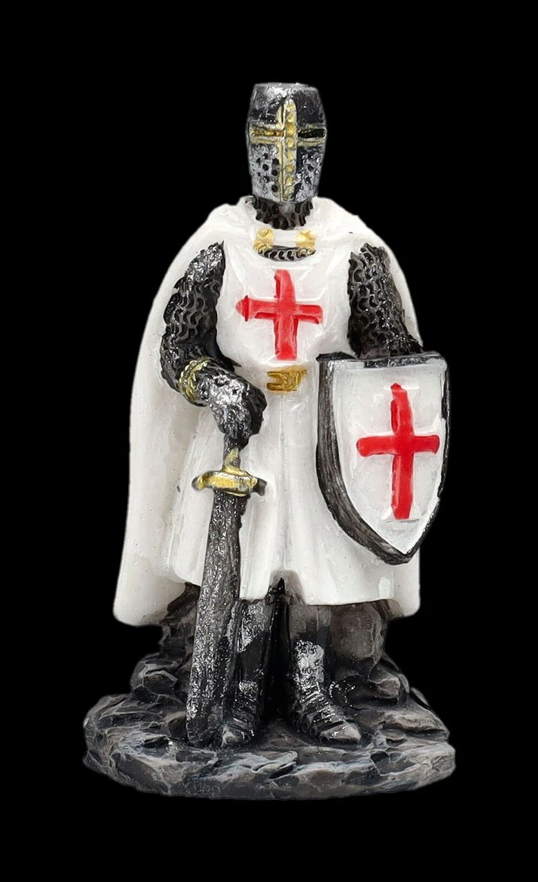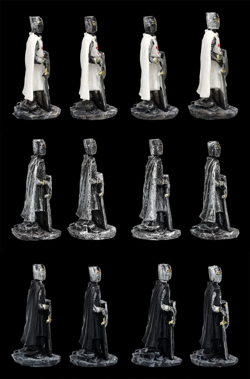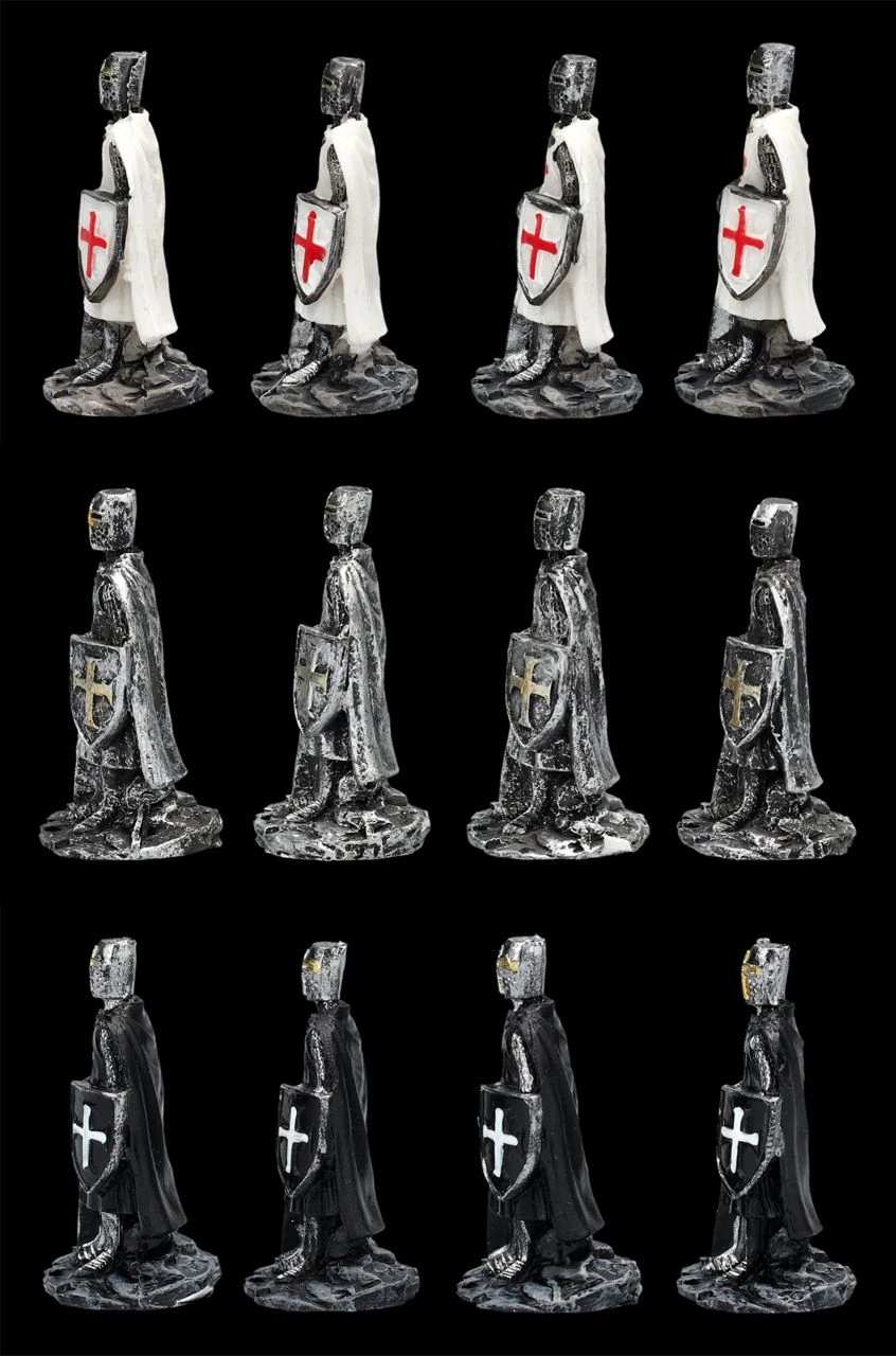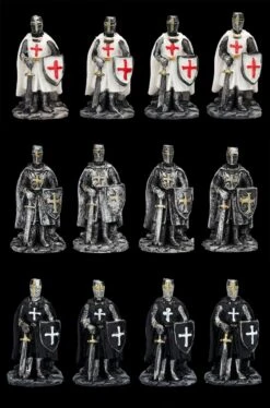 Vier der Kreuzritter mit Schild aus diesem 12er Set tragen eine silberfarbene Rüstung , vier haben weiße,Umhänge mit roten Kreuzen und vier weitere tragen schwarze Umhänge mit weißen Kreuzen. Die Kreuzritter-Figuren wurden aus handbemaltem Kunststein (Polyresin) gefertigt und sind je 4,5 cm hoch, je 2,5 cm breit und je 2,5 cm tief. Große und kleine Ritter-Fans werden sich über die unterschiedlichen und bunten Kreuzritter im 12er Set sicher freuen.