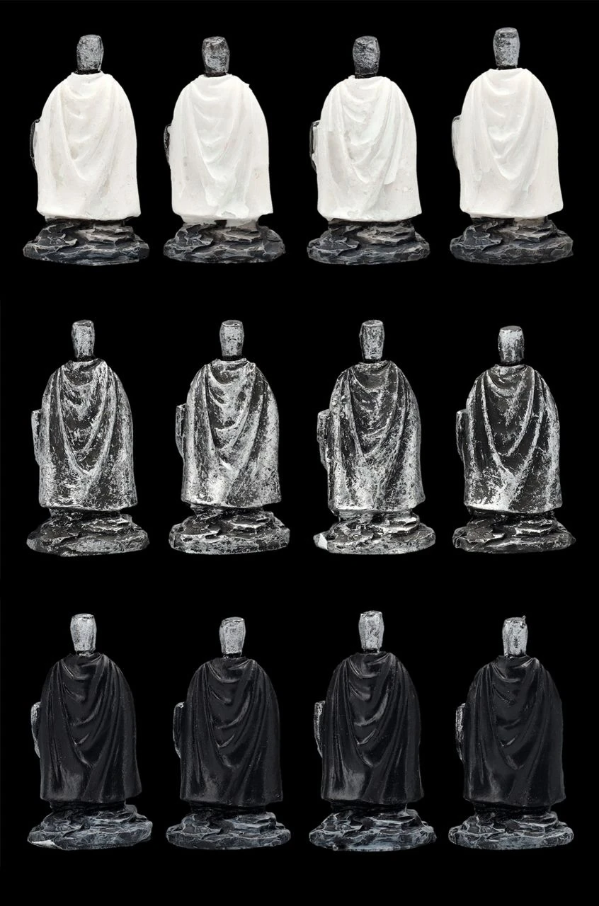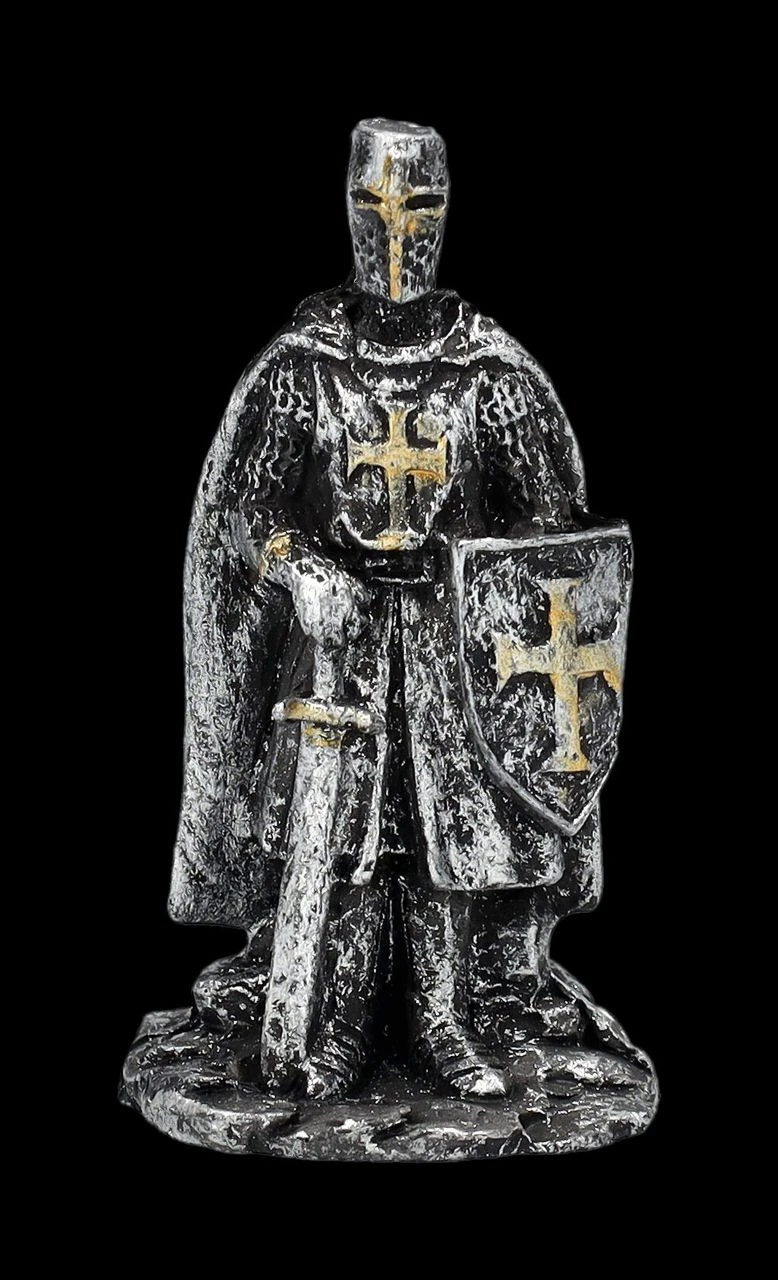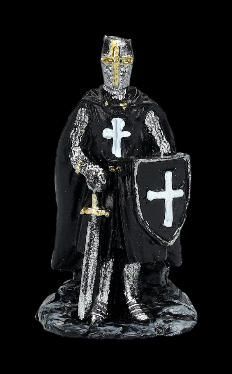 Vier der Kreuzritter mit Schild aus diesem 12er Set tragen eine silberfarbene Rüstung , vier haben weiße,Umhänge mit roten Kreuzen und vier weitere tragen schwarze Umhänge mit weißen Kreuzen. Die Kreuzritter-Figuren wurden aus handbemaltem Kunststein (Polyresin) gefertigt und sind je 4,5 cm hoch, je 2,5 cm breit und je 2,5 cm tief. Große und kleine Ritter-Fans werden sich über die unterschiedlichen und bunten Kreuzritter im 12er Set sicher freuen.