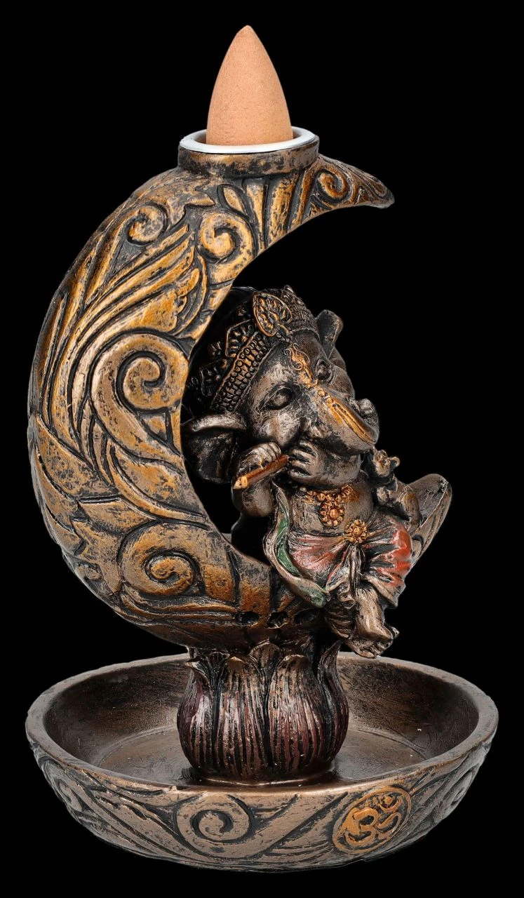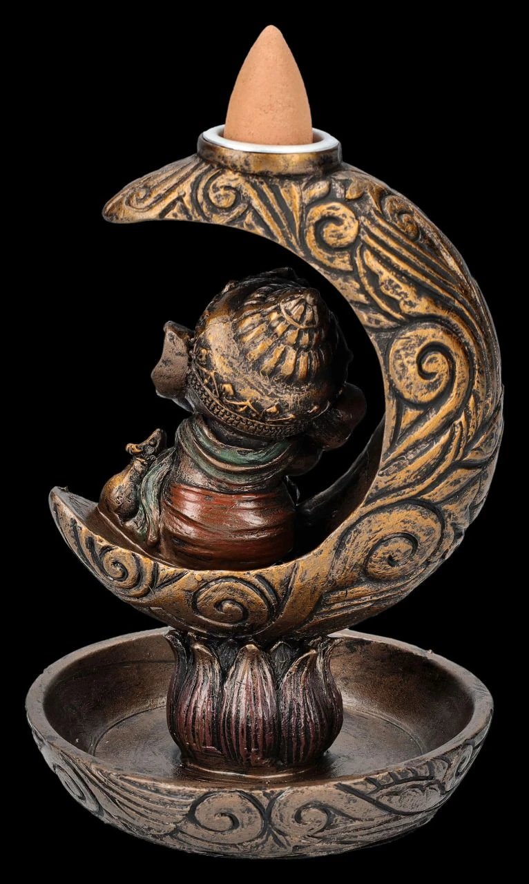 Eine schöne verzierte Mondsichel steht als Räucherkegelhaler auf einer Lotusblüte in einem Becken. Das am Rand verzierte Becken dient als Auffangschale für den Rauch des Räucherkegels. In der Mondsichel sitzt der nicht nur im Hinduismus als Glücksbringer sehr beliebte elefantenköpfige Gott Ganesha und spielt hingebungsvoll auf seiner Bansuri. Sein ständiger Begleittier, die Ratte, sitzt neben ihm und hört hingebungsvoll zu. Wenn der Räucherkegel in der Halterung auf der Mondsichel brennt, fließt der Rauch sanft wie ein Nebel in die wie ein Brunnen wirkende Schale. Der 12,5 cm hohe, 8 cm breite und 8 cm tiefe Rückfluss-Räucherhalter mit dem auf der Bambusflöte spielenden Gott Ganesha ist ein perfektes Accessoire für den privaten Rückzugsraum und natürlich auch für ein Yoga-Studio etc. Drei Backflow Räucherkegel sind in der Lieferung enthalten und weitere finden Sie in unserem Shop. Bei der Benutzung des faszinierenden Rückfluss-Räucherhalters beachten Sie bitte unsere Sicherheitshinweise.
