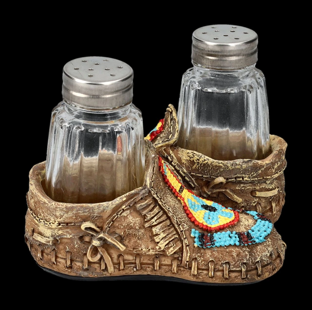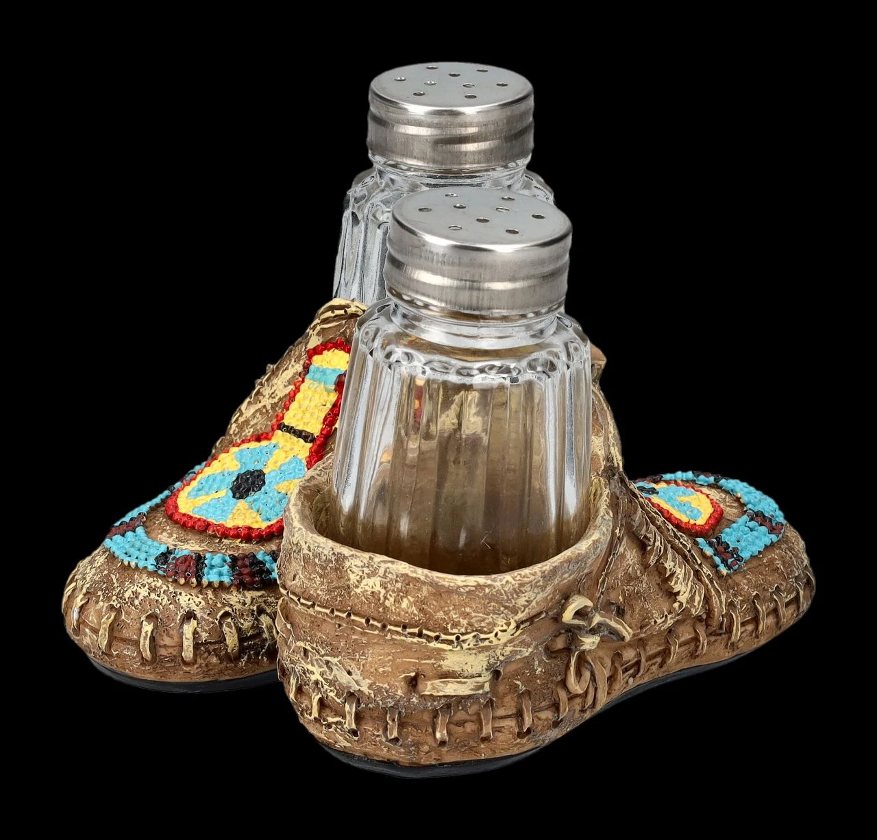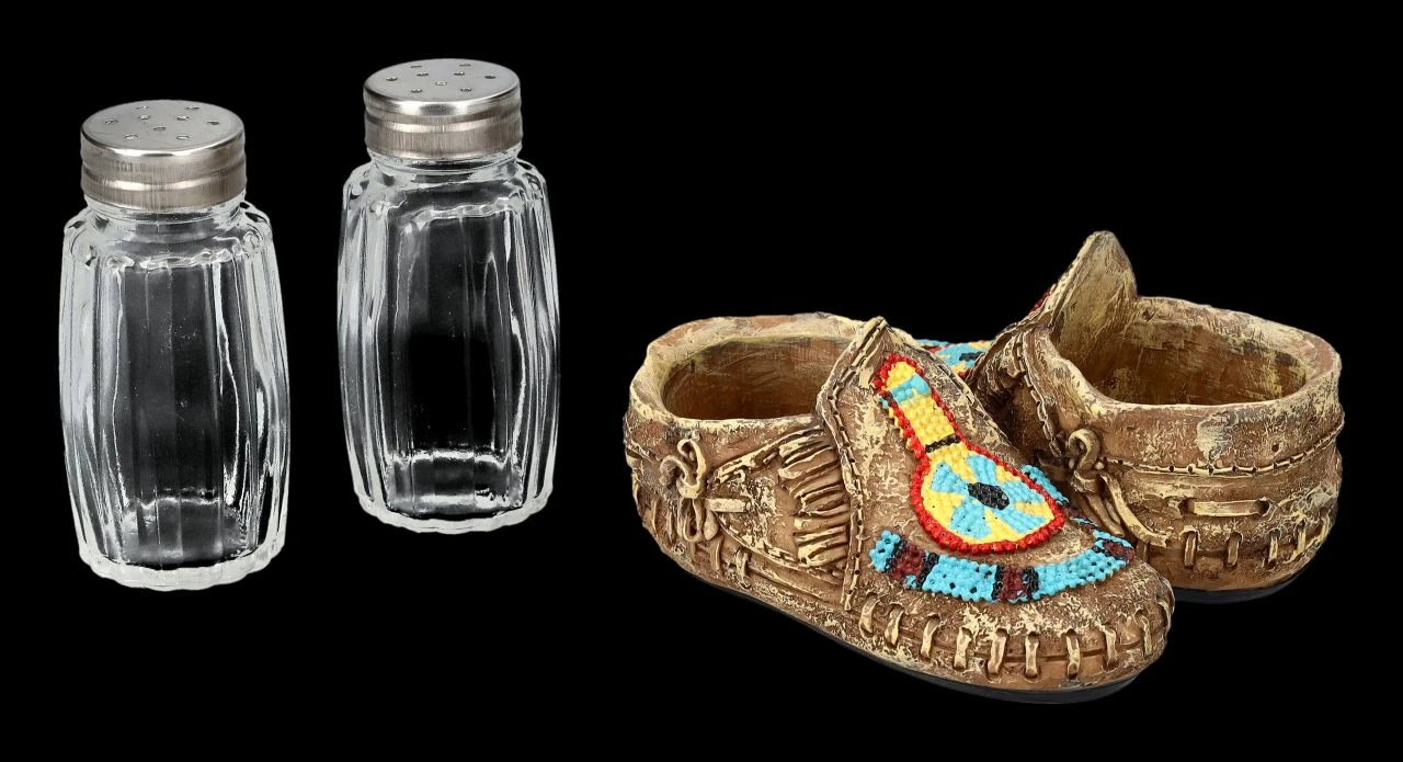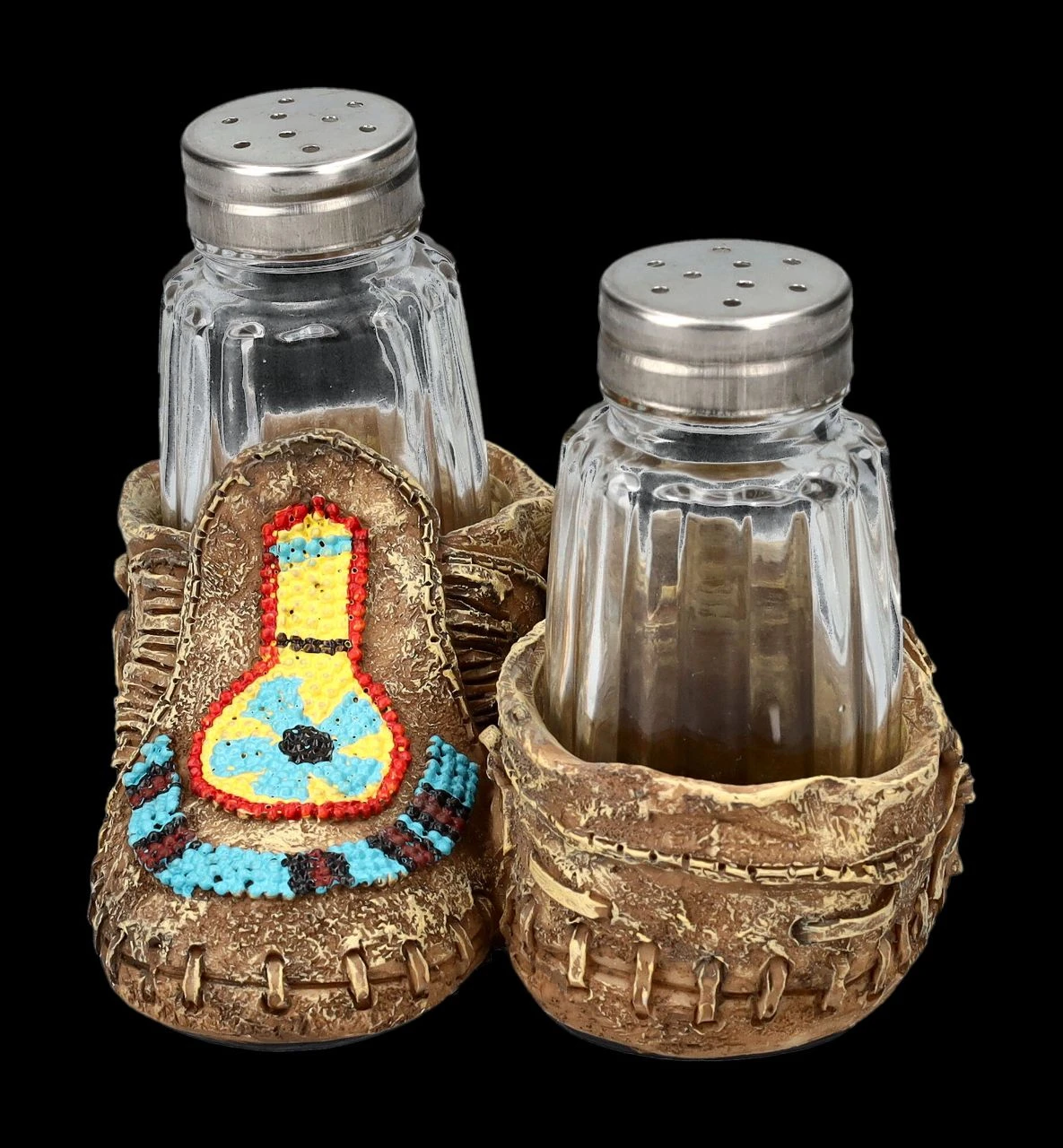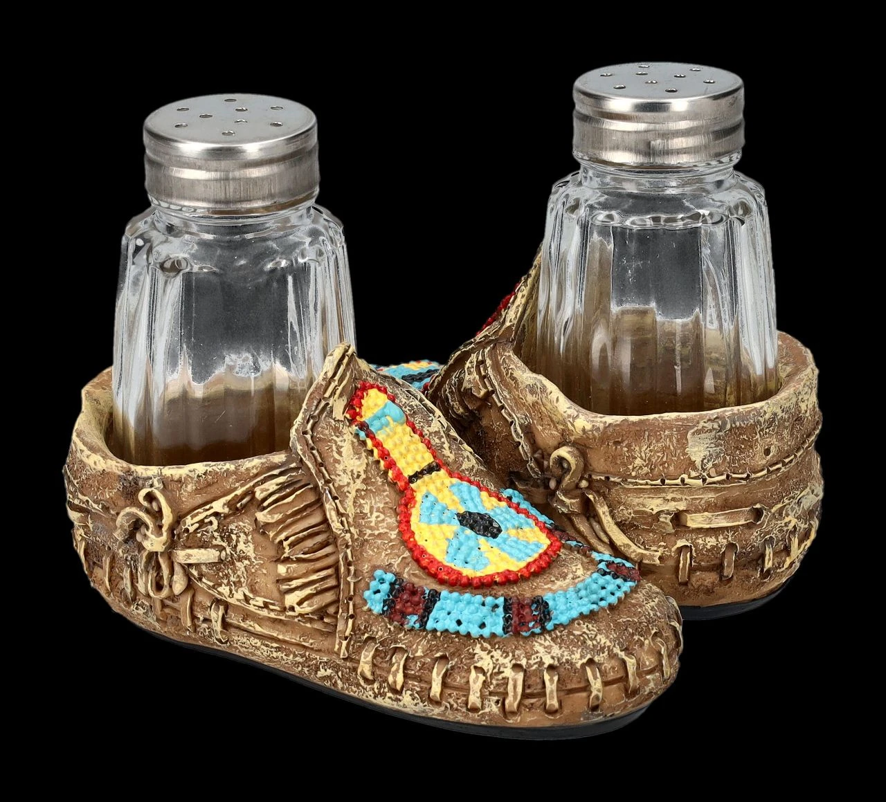 In den indianischen Mokassins aus handbemaltem Kunststein stecken jeweils ein Salz- und ein Pfefferstreuer aus Glas mit der Höhe von 8 cm und dem Durchmesser von 3,5 cm. Der 8,5 cm (ohne Streuer: 6 cm) hohe Salz- und Pfefferstreuer ist 11 cm breit und 10 cm tief. Ein perfektse Accessoire für jeden Western-Saloon, eine Bar oder ein Steakhouse und ein witziges Geschenk für Indianer-Freunde und Western-Fans.