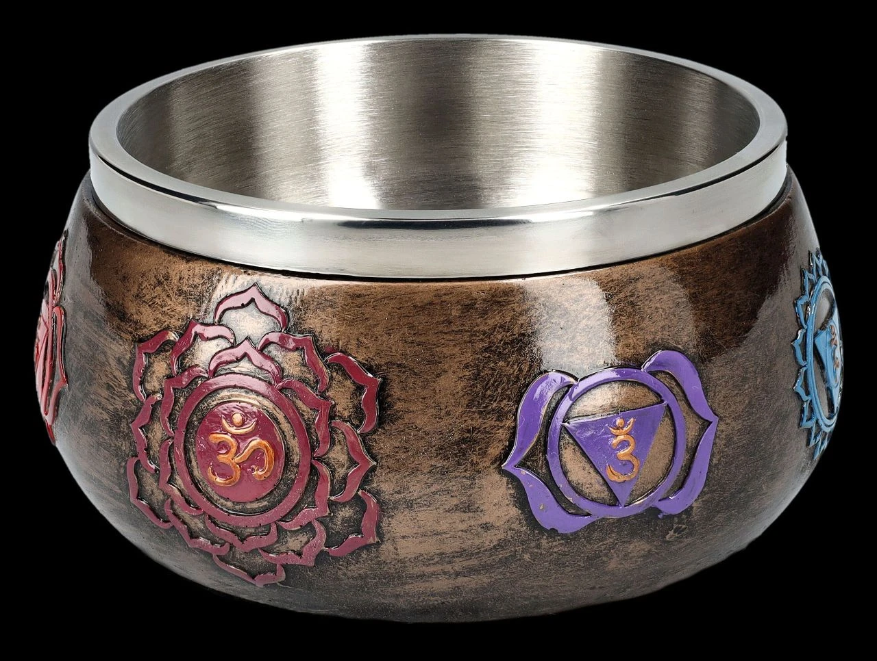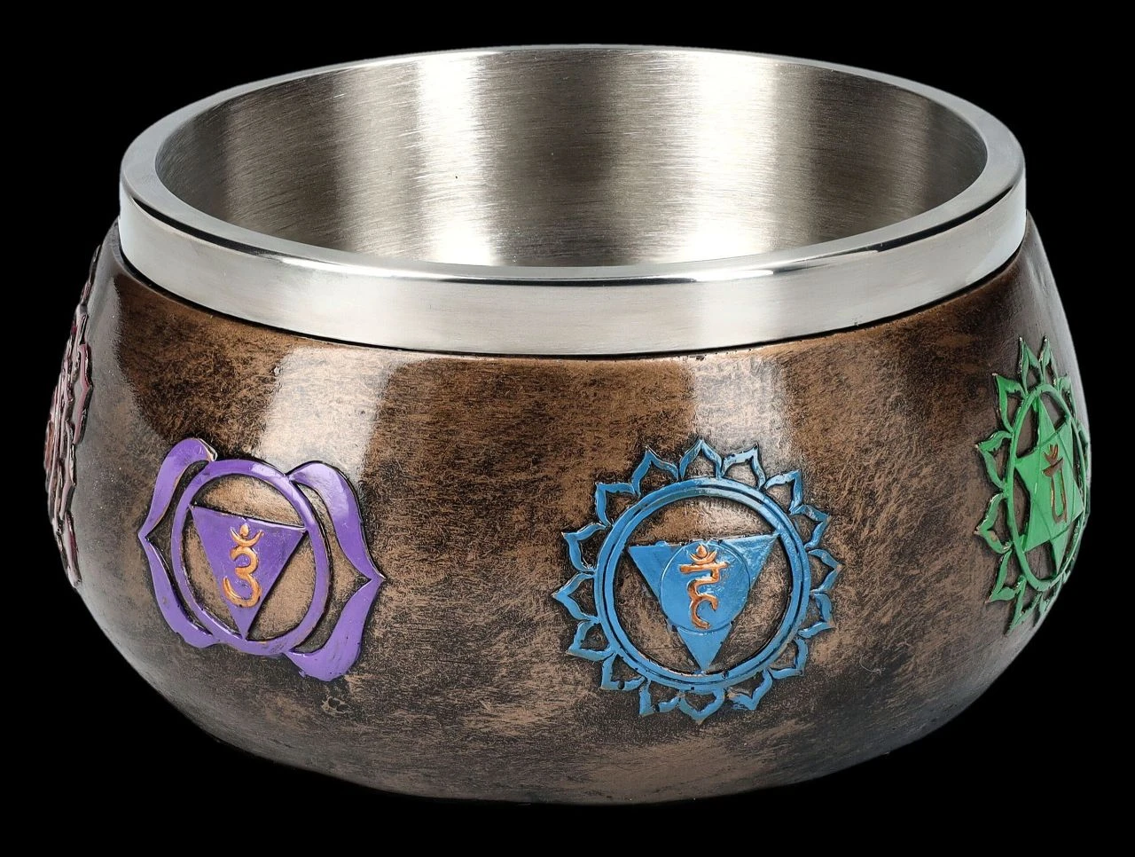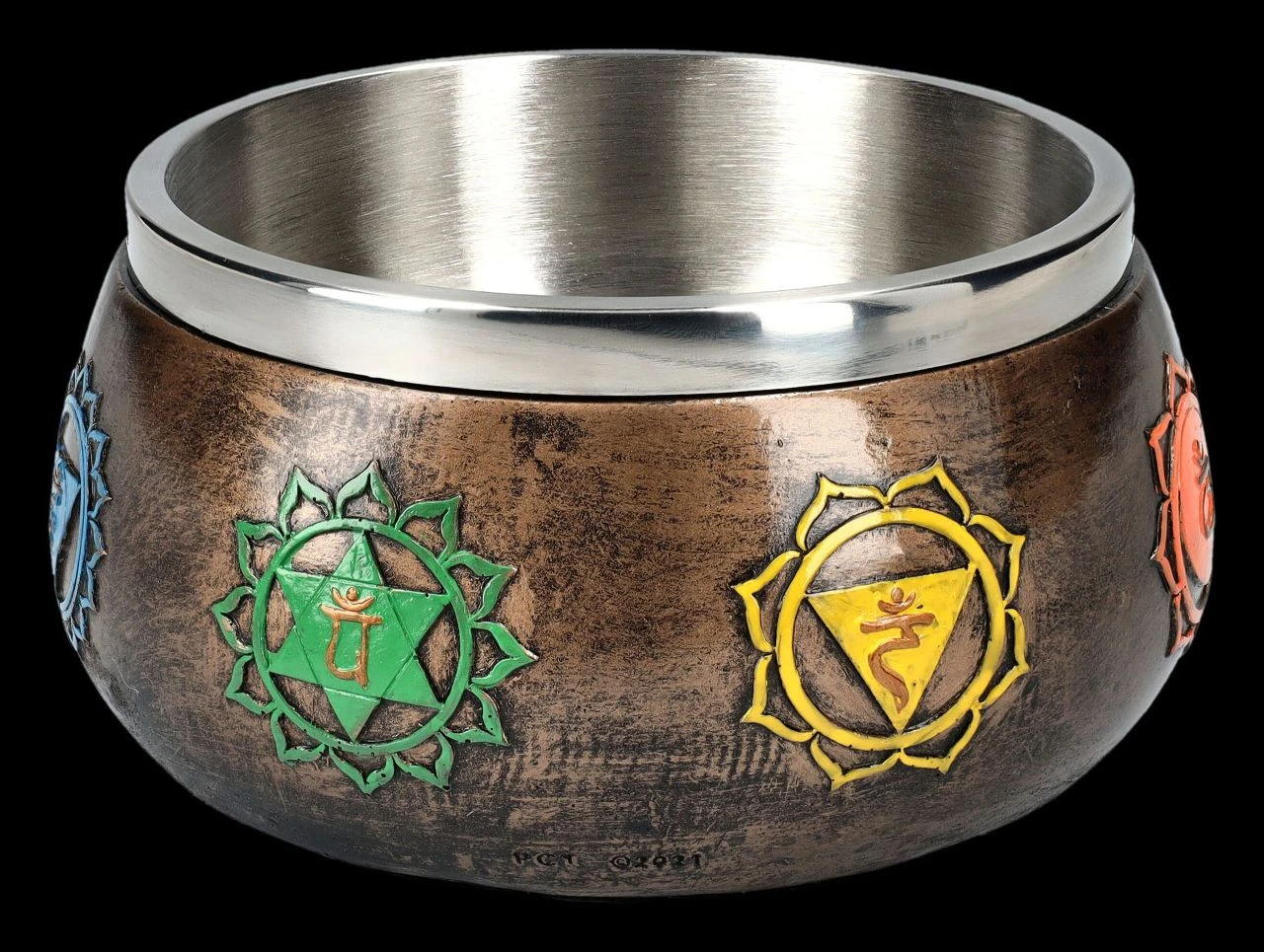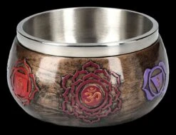 Die Blume des Lebens in den sieben Chakra-Farben sind auf dieser bronzebarbenen magischen Räucherschale abgebildet. Die faszinierende, 8 cm hohe, 14,5 cm breite und 14,5 cm tiefe Schale aus handbemaltem Kunststein (Polyresin) kann jedoch nicht nur als Räucherschale für Rituale oder beim Yoga verwendet werden, sie ist auch als außergewöhnliche Snackschale auf dem Tisch ein Blickfang. Durch den 4,5 cm hohen herausnehmbaren Edelstahleinsatz mit dem Durchmesser von 11 cm und dem Fassungsvermögen von ca. 350 ml kann sie sogar als ganz besondere Futterschale für Katze oder Hund dienen. Auf jeden Fall ist die Räucherschale mit den sieben Chakren ein faszinierendes und vielseitiges Accessoires und damit auch ein wunderbares Geschenk.