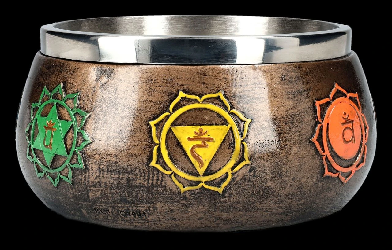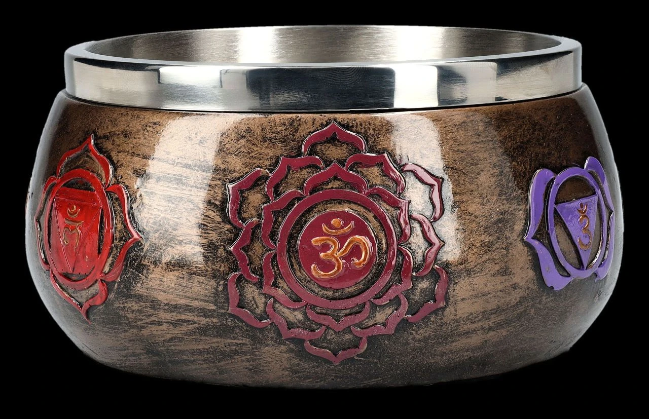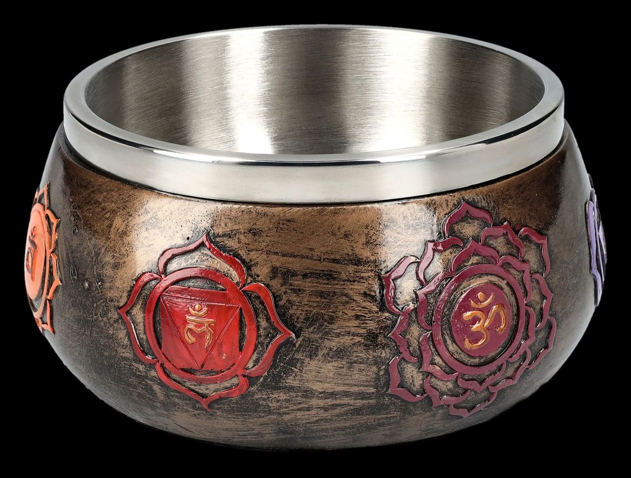 Die Blume des Lebens in den sieben Chakra-Farben sind auf dieser bronzebarbenen magischen Räucherschale abgebildet. Die faszinierende, 8 cm hohe, 14,5 cm breite und 14,5 cm tiefe Schale aus handbemaltem Kunststein (Polyresin) kann jedoch nicht nur als Räucherschale für Rituale oder beim Yoga verwendet werden, sie ist auch als außergewöhnliche Snackschale auf dem Tisch ein Blickfang. Durch den 4,5 cm hohen herausnehmbaren Edelstahleinsatz mit dem Durchmesser von 11 cm und dem Fassungsvermögen von ca. 350 ml kann sie sogar als ganz besondere Futterschale für Katze oder Hund dienen. Auf jeden Fall ist die Räucherschale mit den sieben Chakren ein faszinierendes und vielseitiges Accessoires und damit auch ein wunderbares Geschenk.