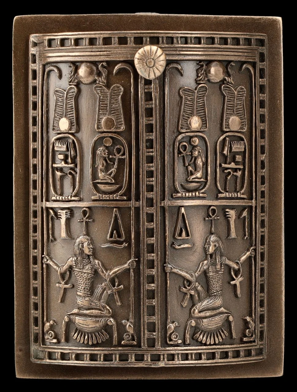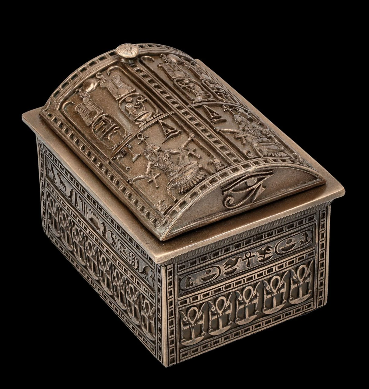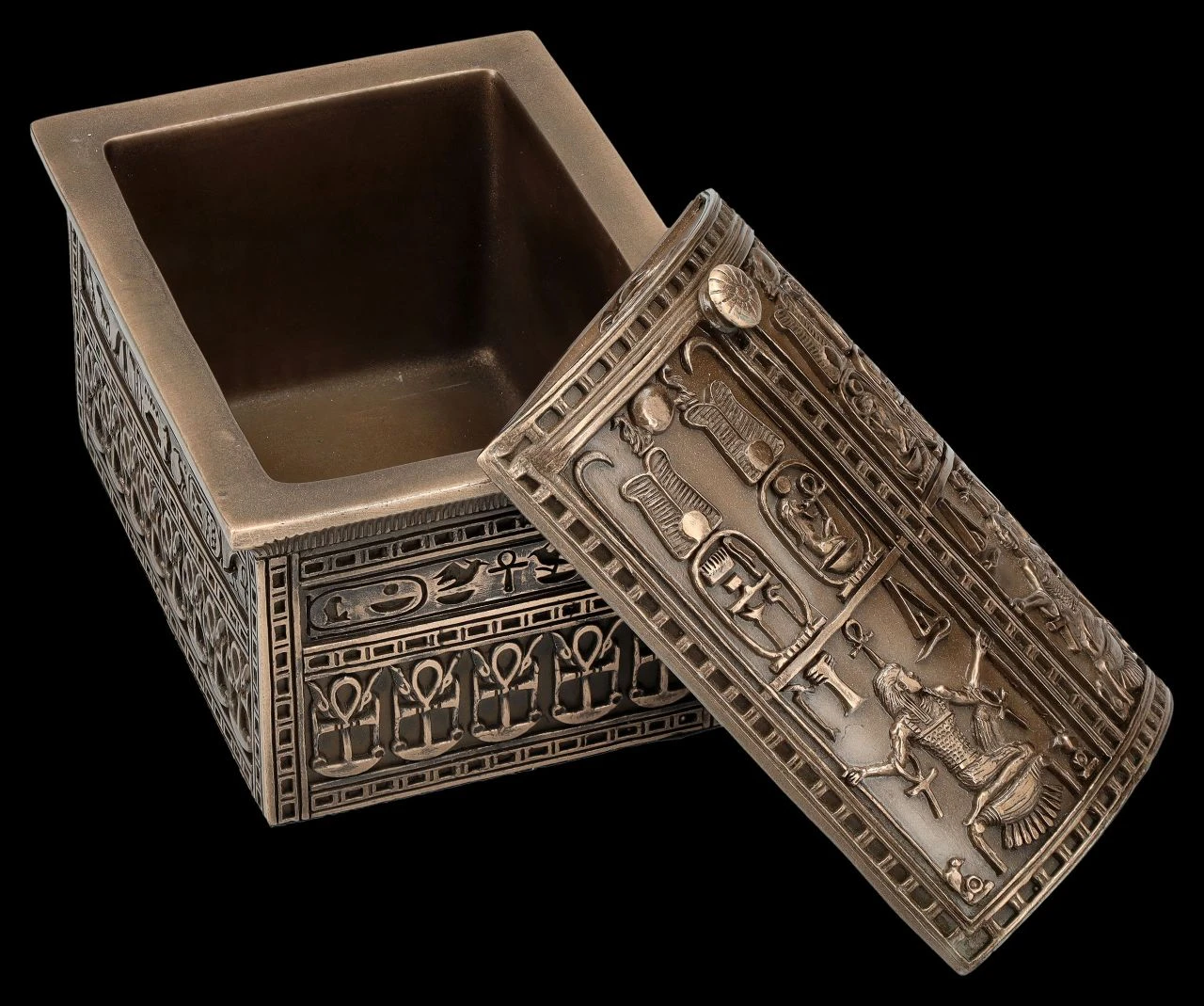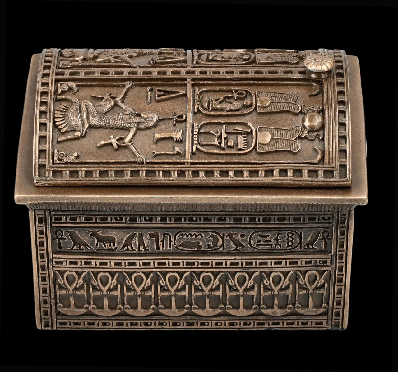 Schränke oder andere Möbel kannte man im alten Ägypten noch nicht. So wurde – wie man auch aus Grabbeigaben kennt – alles in Krügen, Körbe, Tüchern oder Kästchen verstaut. Die konnte man dann auch ganz leicht mitnehmen. Aber auch als Kanopenkasten wurden die oft wie richtige Kunstwerke verzierten Truhen verwendet. Die 9 cm hohe, 9 cm breite und 11,5 cm tiefe handbemalte und mit Hieroglyphen verzierte Schatulle in Form einer Ägyptischen Truhe ist detailreich aus Kunststein (Polyresin) gefertigt. Im Inneren hat sie mit H: 5,5 cm / B: 6,5 cm / T: 9,5 cm ausreichend Platz für besondere Kleinigkeiten und sie ist auch ein perfektes Geschenk für alle, die sich für das Alte Ägypten interessieren.