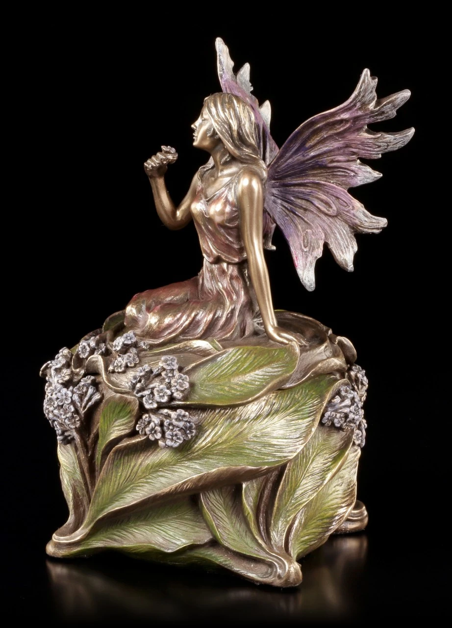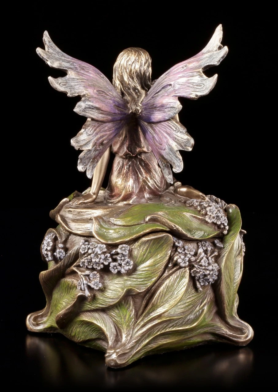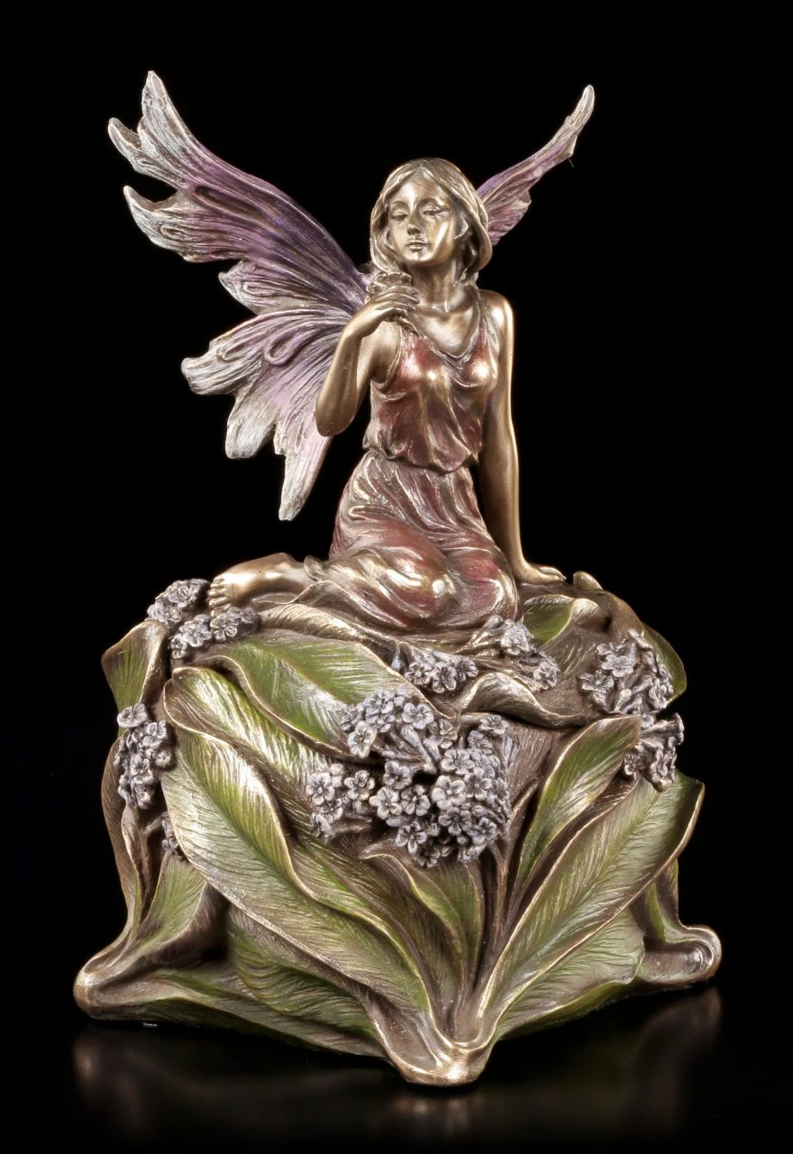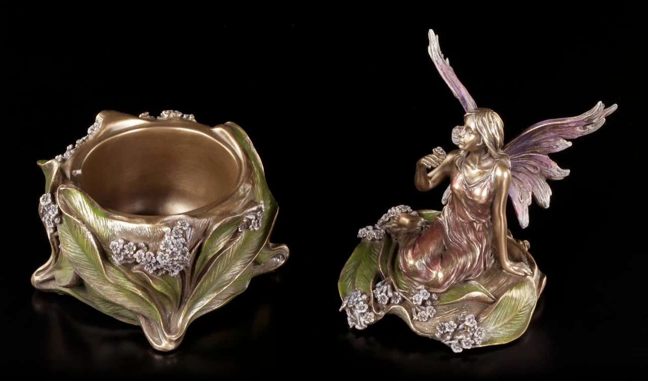 Vermutlich hat die niedliche kleine, in ein zartes Kleid gehüllte, Elfe mit den filigranen Flügeln mitten in den Blättern und kleinen Blüten geschlafen und hat sich nun, noch halb in ihren schönen Traum versunken, aufgerichtet. Dass sich unter der Elfe in der schönen Blüte eine geheimnisvolle Schatulle befindet, ist nicht auf den ersten Blick zu erkennen. Edel bronziert und sehr fein und liebevoll coloriert, ist die wunderschöne Schatulle mit der Höhe von 16 cm (Höhe der Elfe ist 9 cm) und dem Durchmesser von 11,5 cm aus der Studio Collection von Veronese auch ein zauberhaftes Objekt, das auf dem Tisch oder dem Sideboard bewundernde Blicke auf sich ziehen wird. Innen hat die reich verzierte Schatulle mit den Maßen T 4,5 cm / D 6,5 cm auch Platz für ein überraschendes Geschenk.