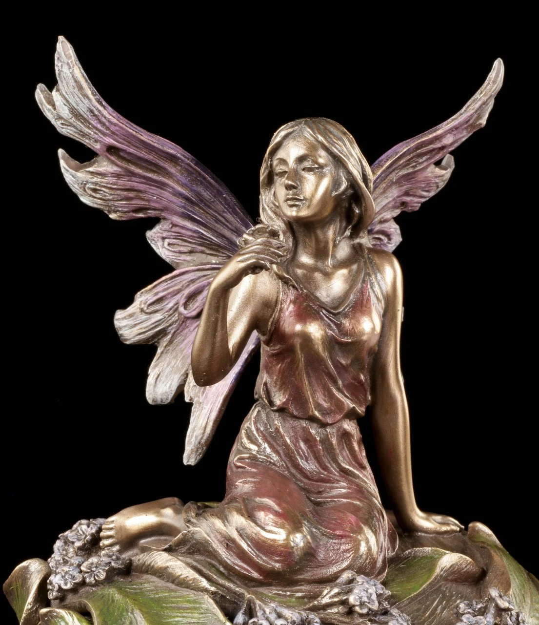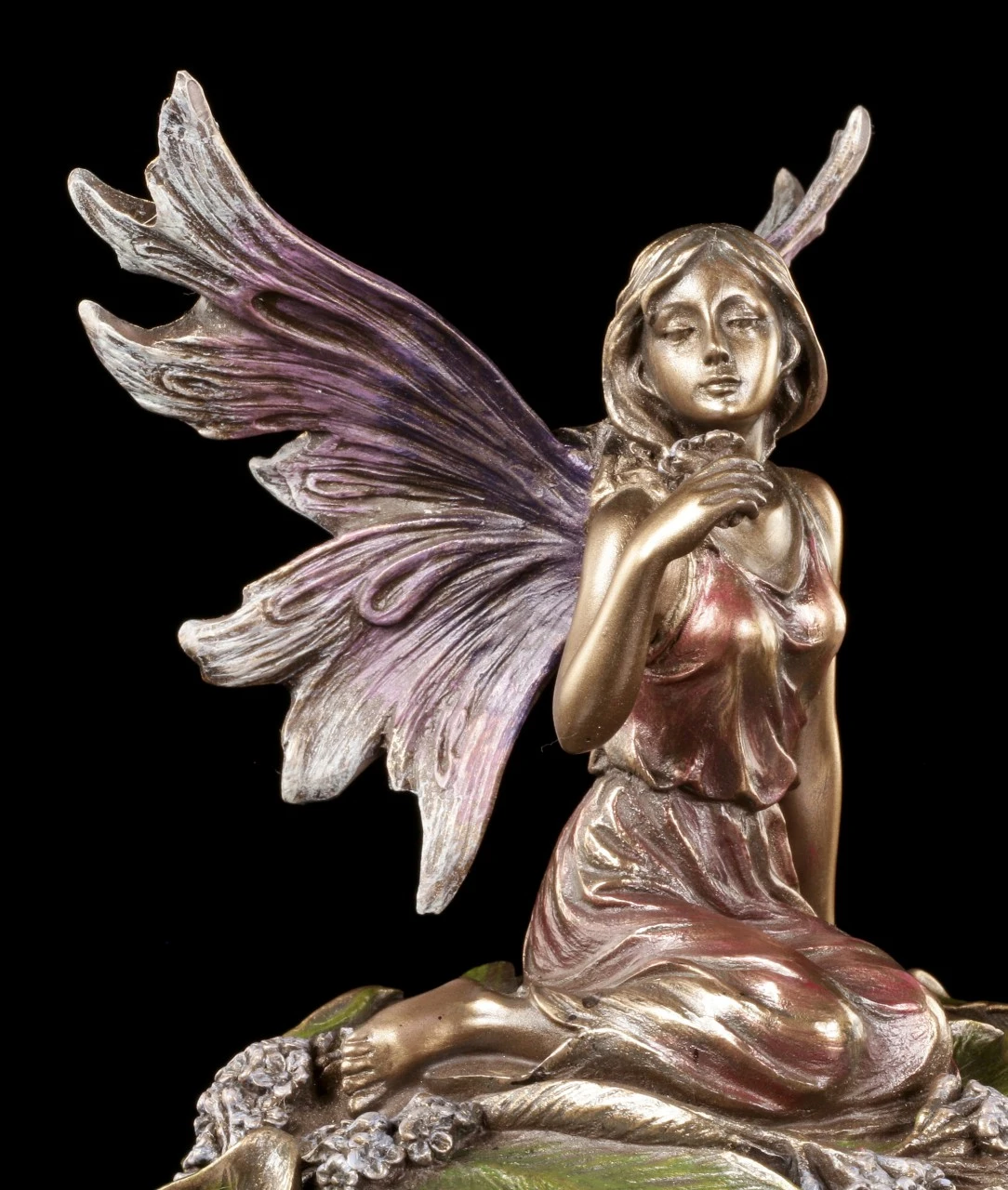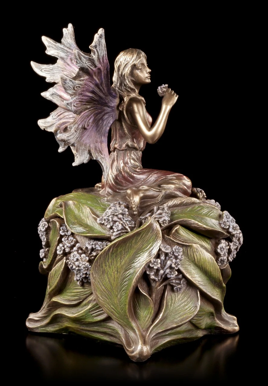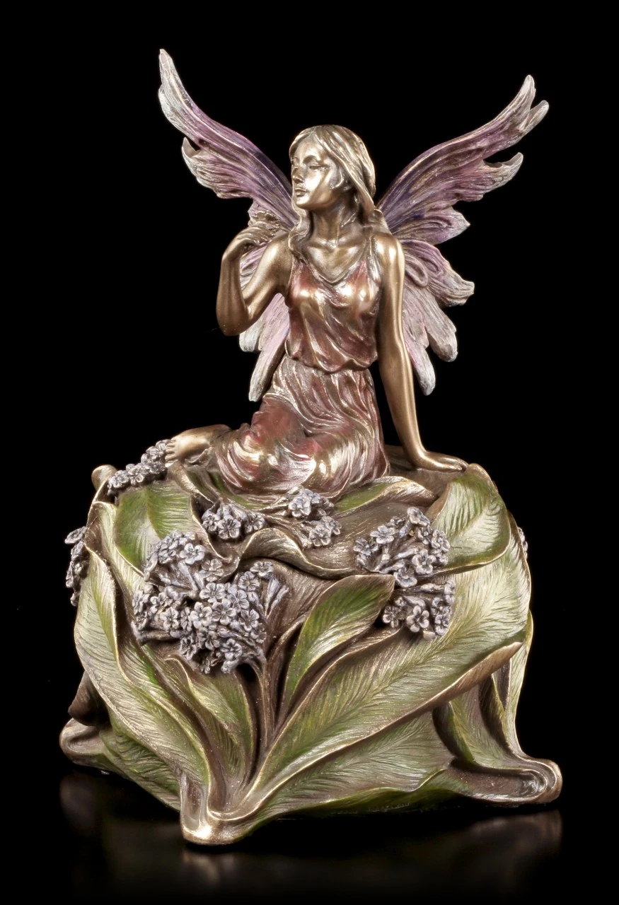 Vermutlich hat die niedliche kleine, in ein zartes Kleid gehüllte, Elfe mit den filigranen Flügeln mitten in den Blättern und kleinen Blüten geschlafen und hat sich nun, noch halb in ihren schönen Traum versunken, aufgerichtet. Dass sich unter der Elfe in der schönen Blüte eine geheimnisvolle Schatulle befindet, ist nicht auf den ersten Blick zu erkennen. Edel bronziert und sehr fein und liebevoll coloriert, ist die wunderschöne Schatulle mit der Höhe von 16 cm (Höhe der Elfe ist 9 cm) und dem Durchmesser von 11,5 cm aus der Studio Collection von Veronese auch ein zauberhaftes Objekt, das auf dem Tisch oder dem Sideboard bewundernde Blicke auf sich ziehen wird. Innen hat die reich verzierte Schatulle mit den Maßen T 4,5 cm / D 6,5 cm auch Platz für ein überraschendes Geschenk.