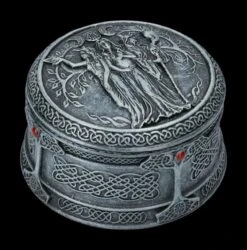 Eine fantastische Aufbewahrung für Ihre kleinen Kostbarkeiten ist die schön verzierte Schatulle aus der Studio Collection von Veronese. Auf dem Deckel der Schatulle steht Hekate, die Göttin der Magie, der Theurgie, der Nekromantie (Totenbeschwörung) vor einem Lebensbaum. Die Dreifach-Göttin Hekate wird auch als Göttin der Wegkreuzungen bzw. Weggabelungen, Schwellen und Übergänge und die Wächterin der Tore zwischen den Welten verehrt. Rote Schmucksteine leuchten am mit keltischen Symbolen verzierten Rand der schwarzen Schatulle aus Kunststein (Polyresin). Die 5,5 cm hohe Schatulle mit dem Durchmesser von 9,5 cm hat innen mit den Maßen H: 3,5 cm und D: 7,5 cm aber auch Platz für ein besonderes Geschenk