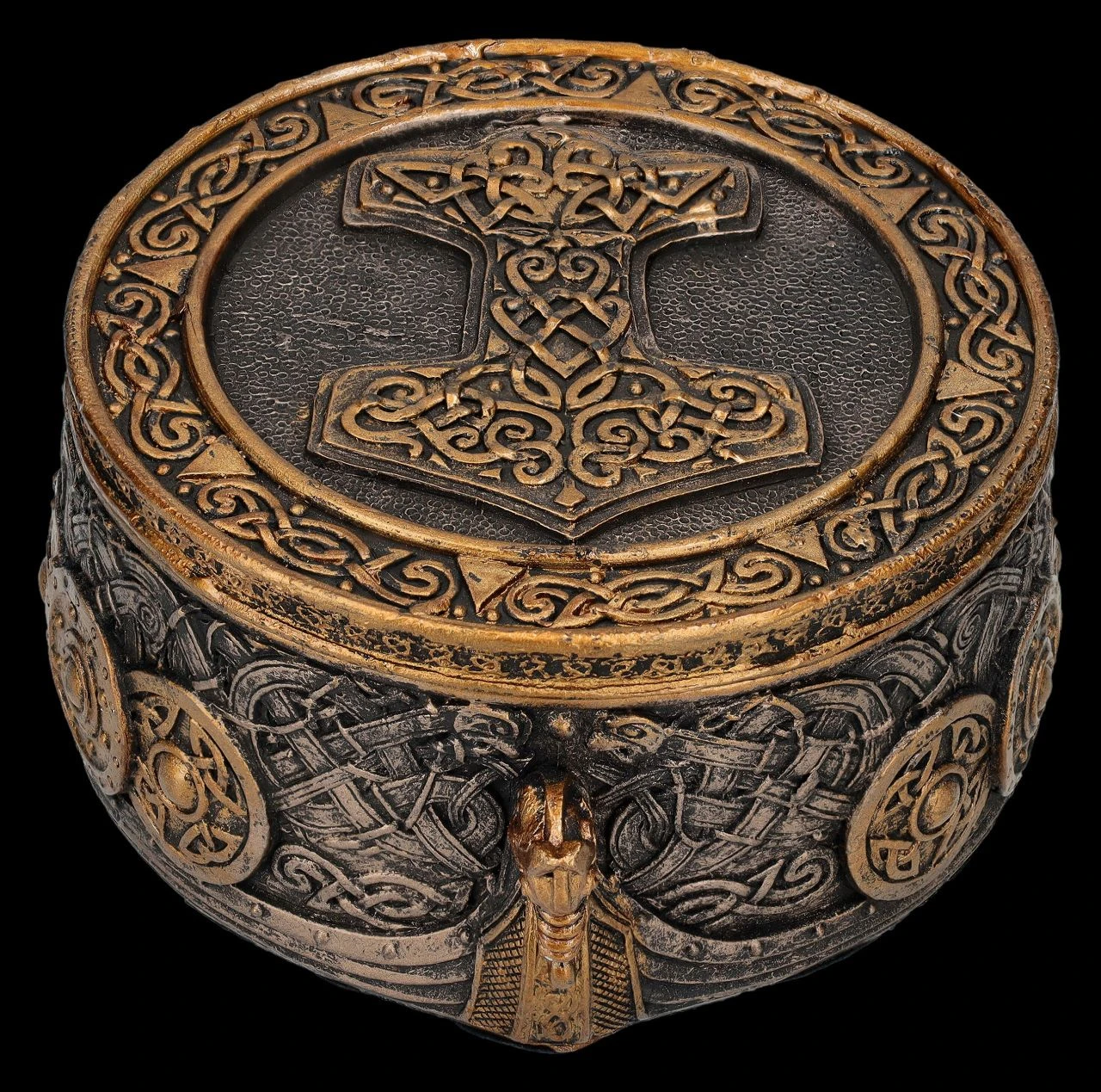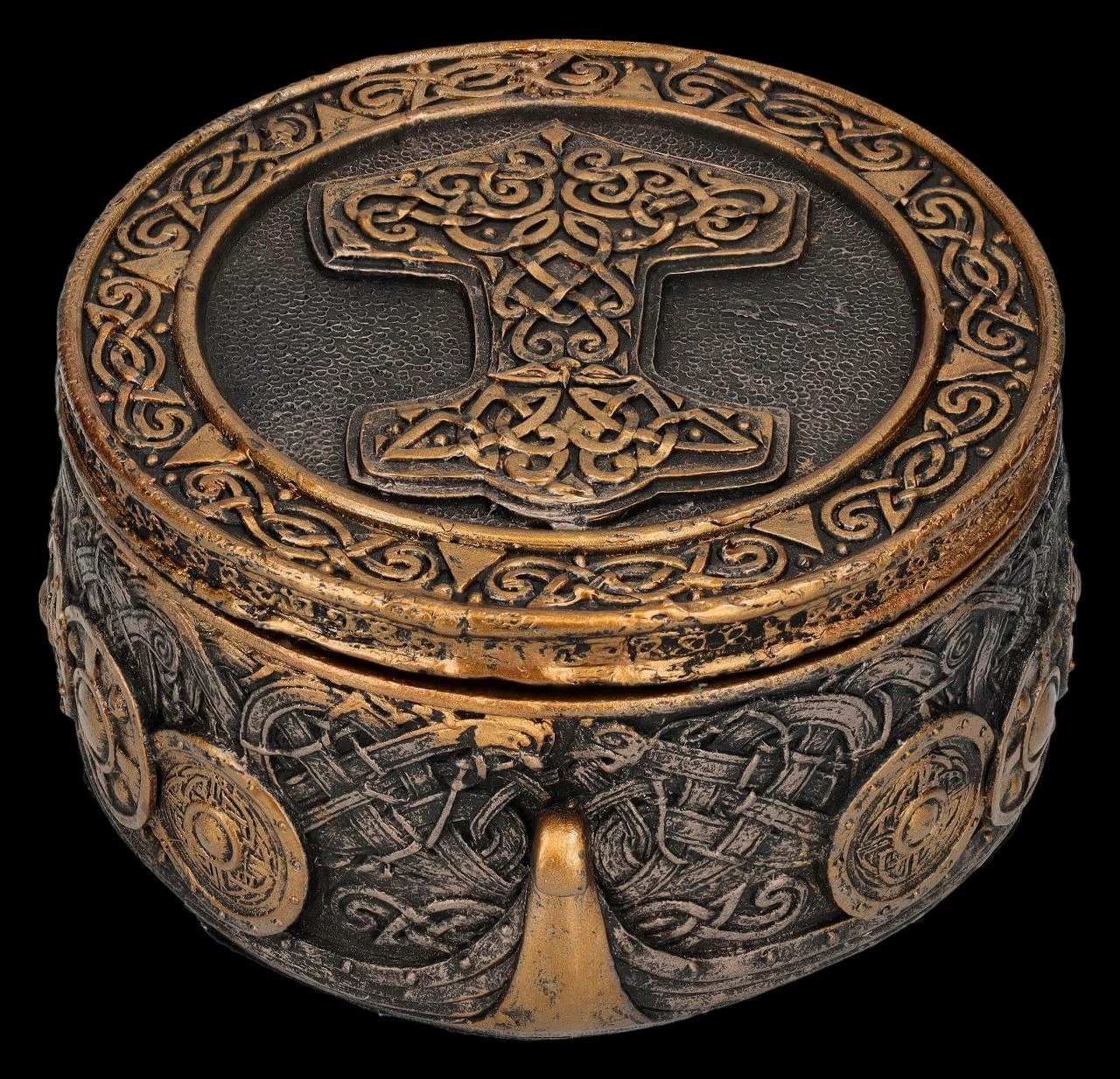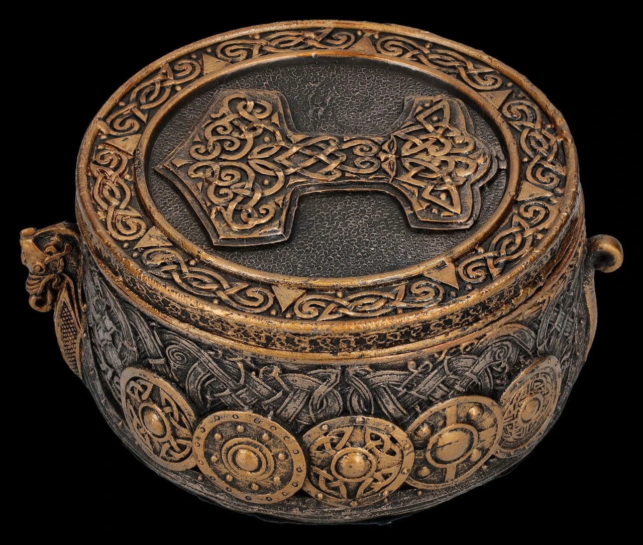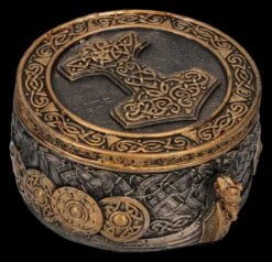 In dieser Schatulle können Wikinger ihre kleinen Schätzchen perfekt aufbewahren, denn Thors Hammer auf dem Deckel wird sie beschützen. Die faszinierende Schatulle aus handbemaltem Kunststein (Polyresin) wirkt mit den Verzierungen wie ein rundes Drakkar Schiff. Sie ist 5,5 cm hoch, 10 cm breit und 12 cm tief und hat innen mit H: 4 cm / B: 8,5 cm / T: 8,5 cm Platz für kleine Geheimnisse, Kostbarkeiten, oder was auch immer. Sie ist aber auch gleich als Verpackung für ein besonderes Wikinger-Geschenk perfekt geeignet.