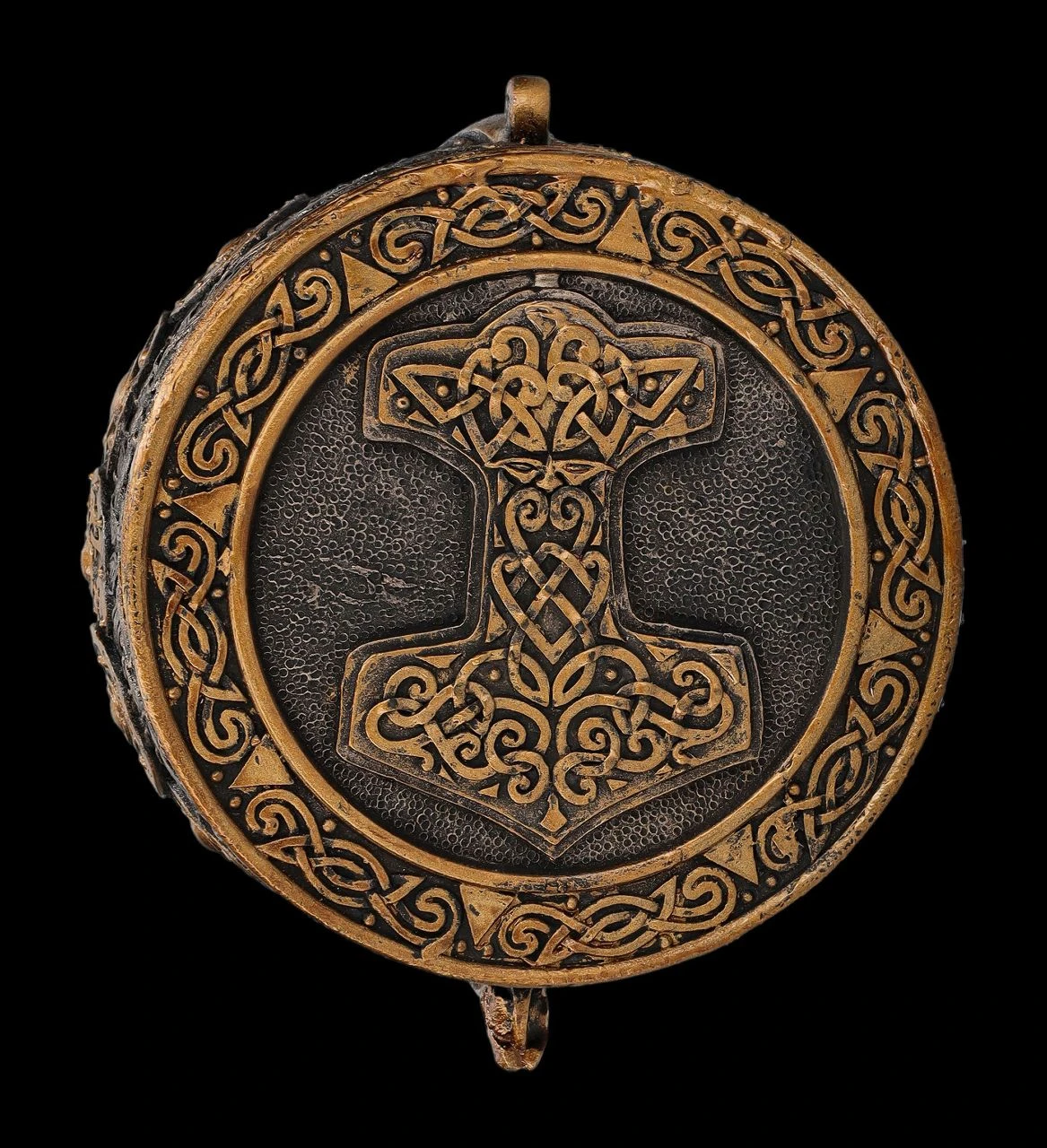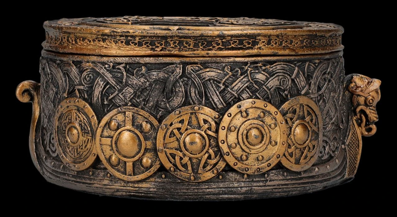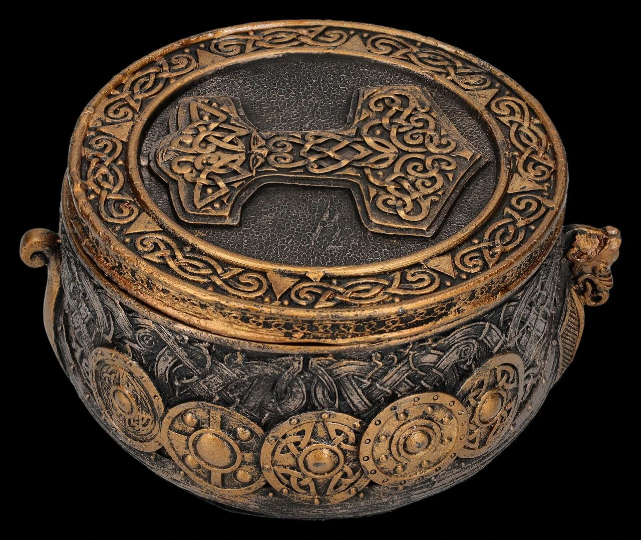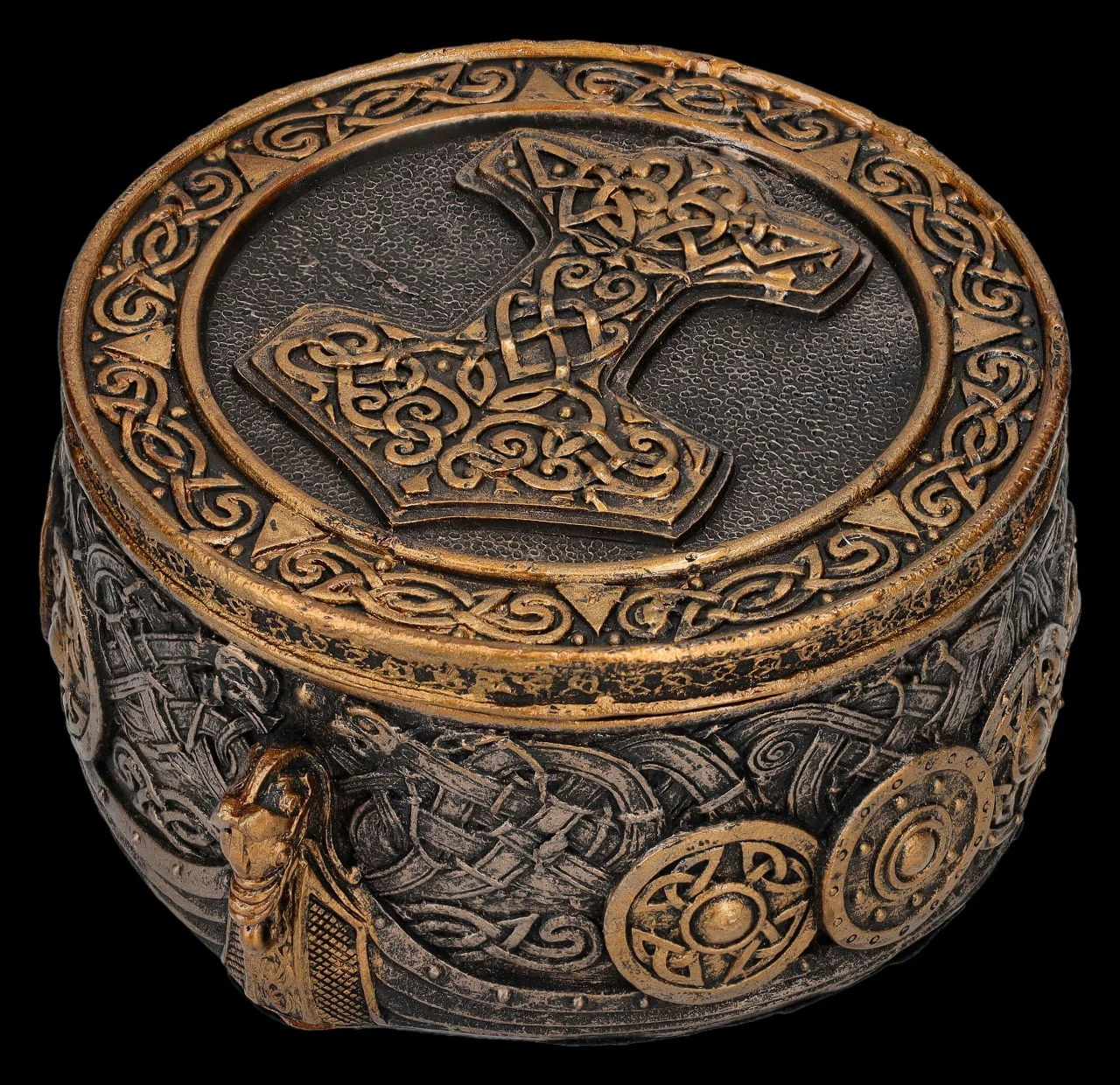 In dieser Schatulle können Wikinger ihre kleinen Schätzchen perfekt aufbewahren, denn Thors Hammer auf dem Deckel wird sie beschützen. Die faszinierende Schatulle aus handbemaltem Kunststein (Polyresin) wirkt mit den Verzierungen wie ein rundes Drakkar Schiff. Sie ist 5,5 cm hoch, 10 cm breit und 12 cm tief und hat innen mit H: 4 cm / B: 8,5 cm / T: 8,5 cm Platz für kleine Geheimnisse, Kostbarkeiten, oder was auch immer. Sie ist aber auch gleich als Verpackung für ein besonderes Wikinger-Geschenk perfekt geeignet.