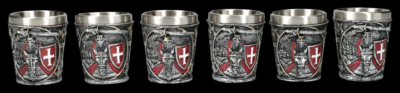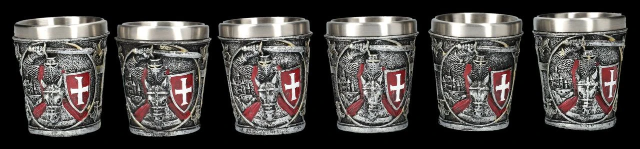 Die 6 Schnapsbecher in dem prächtigen Set sind perfekt für das nächste Rittermahl geeignet, oder auch, um nach einem Turnier mit den Ritter-Freunden auf den sportlichen Kampf anzustoßen. Die je 6,5 cm hohen, je 6 cm breiten und je 6 cm tiefen Becher sind aus handbemaltem Kunststein (Polyresin) und wirken wie aus Eisen geschmiedet. Sie zeigen Ritter auf ihren Pferden mit weißen Kreuzen auf ihren leuchtend roten Umhängen.und ihrem roten Schild. Die Schnapsbecher haben einen festen Einsatz aus Edelstahl mit einem Fassungsvermögen von ca. 80 ml. Dieses herrliche 6er Set mit den Kreuzrittern in Rot sind natürlich auch ein perfektes Geschenk für alle Ritter-Freunde.