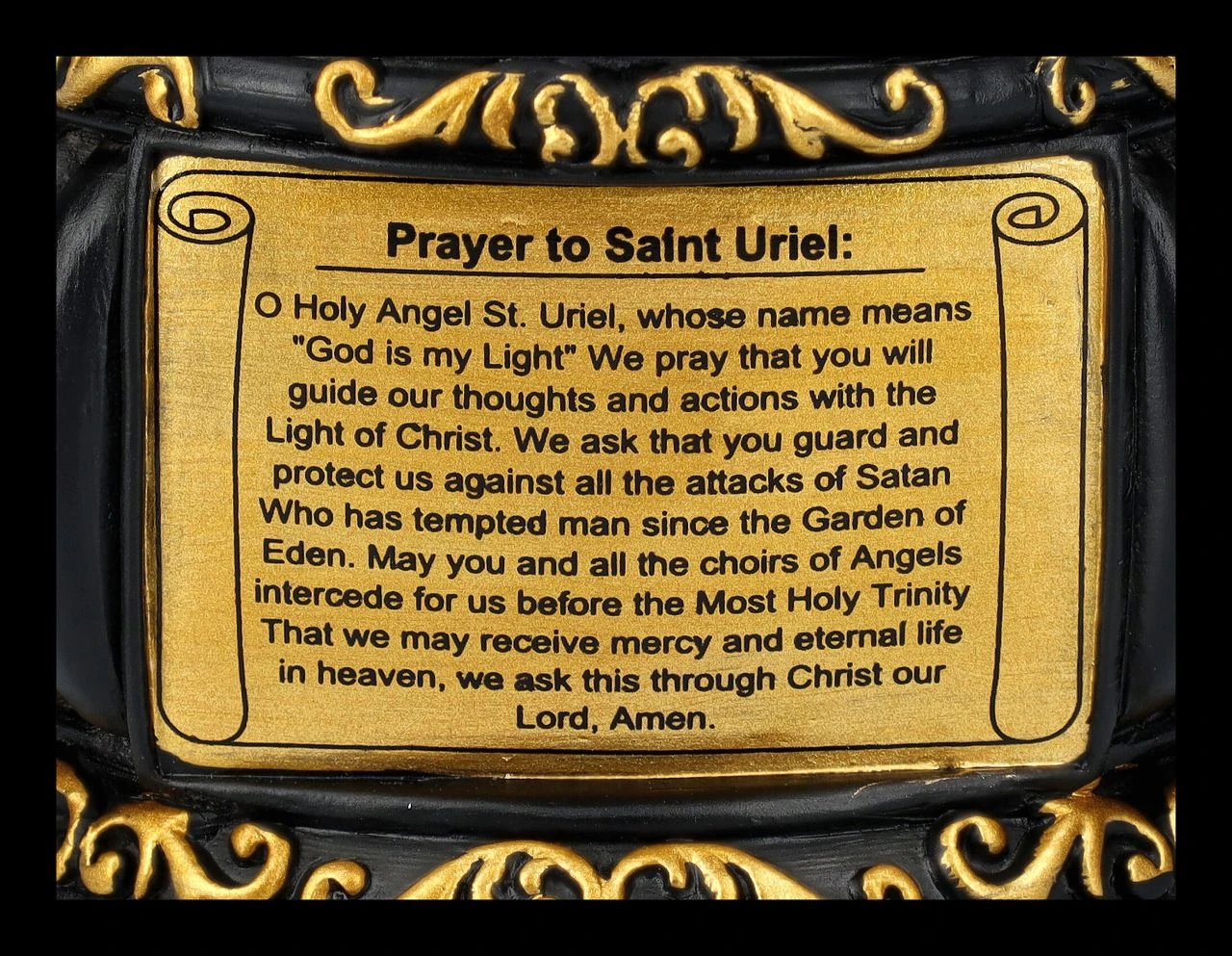 Diese wunderbare Schneekugel zeigt im Inneren der Glaskugel den Erzengel Uriel. Die Figur und die Halterung der Glaskugel sind aus handbemaltem Kunststein (Polyresin). Auf der Halterung ist ein englisches Gebet zu lesen. Übersetzt heißt das Gebet in etwa: ‚Gebet zum Heiligen Uriel. O Heiliger Engel St. Uriel, dessen Name „Gott ist mein Licht“ bedeutet. Wir beten, dass unsere Gedanken und Handlungen vom Licht Christi geleitet wird. Wir bitten Dich, uns vor allen Angriffen Satans zu schützen, der die Menschen seit dem Garten Eden in Versuchung geführt hat. Mögest Du und alle Chöre der Engel vor der Allerheiligsten Dreifaltigkeit für uns eintreten. Dass wir Barmherzigkeit und ewiges Leben im Himmel empfangen, darum bitten wir durch Christus, unseren Herrn. Amen.‘ Die 14 cm hohe, 10 cm breite und 10 cm tiefe Schneekugel ist also ein wunderbares Geschenk nicht nur für Sammler, sondern auch für alle Gläubigen.