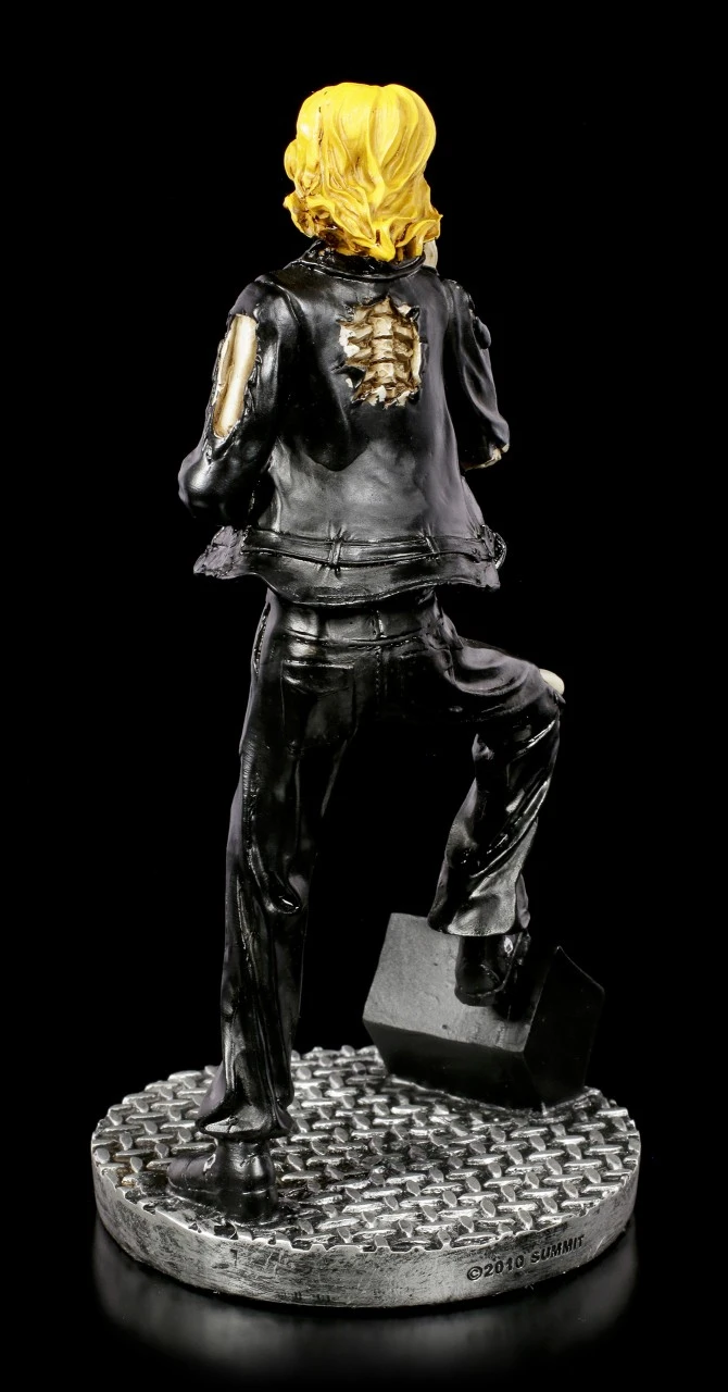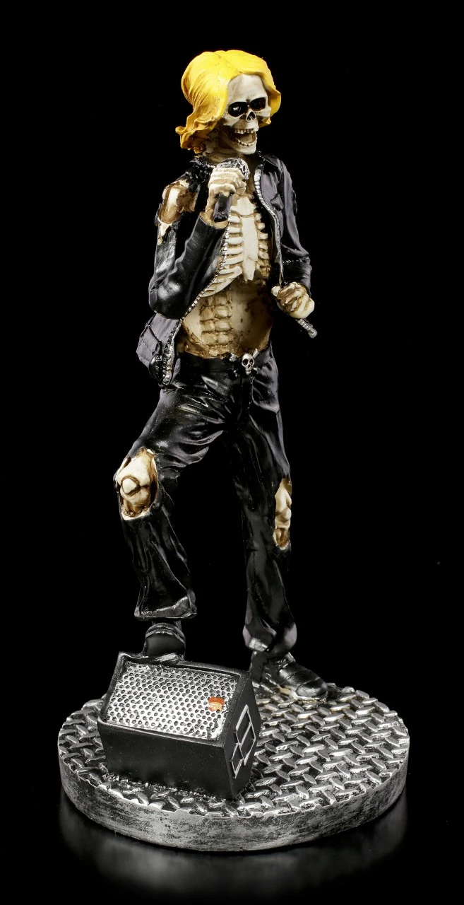 Die handbemalte Skelett Figur aus Kunststein (Polyresin) ist für jeden Rock Sänger das perfekte Geschenk zum Geburtstag. Der blonde Sänger gibt sein Bestes und der Refrain bringt alle Zuschauer zum Mitsingen. Die vielen Details der Figur, das Mikrofon, der Lautsprecher und coolen Klamotten, machen die Figur zu einer Besonderheit.
