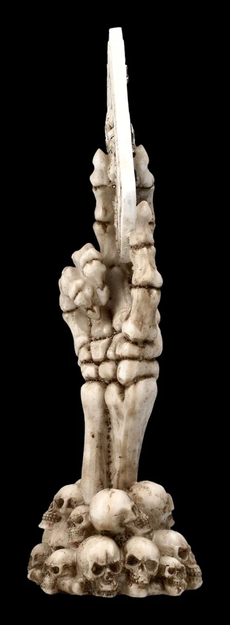 Glücksbringer am Kartentisch, oder doch die Warnung, kein Ass im Ärmel zurückzuhalten? Auf jeden Fall wird diese witzige Skelett Hand mit dem Pik Ass in der Hand der absolute Hingucker bei jedem Kartenspiel. Die aus mehreren Totenschädeln ragende Skelett Hand „Ace up your Sleeve“ ist sehr detailreich aus handbemaltem Kunststein (Polyresin) gefertigt. Sie ist 18 cm hoch, 7 cm breit und 5,5 cm tief.