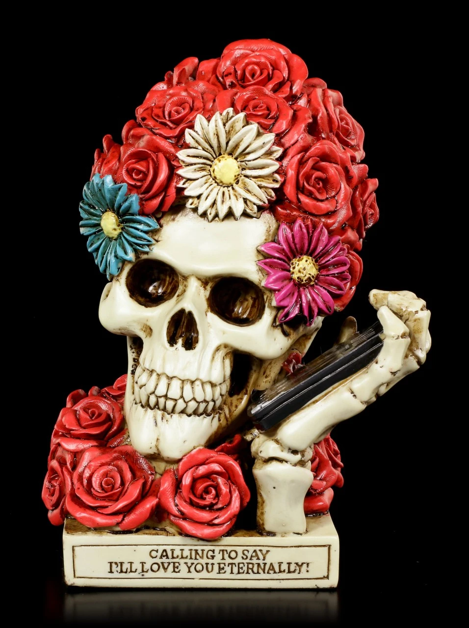 Dieser aufsehenserregende Totenkopf mit den vielen schmückenden Blumen ist ein außergewöhnliches Zeichen der unendlichen Liebe. Er dekoriert jeden Tisch und jedes Regal.