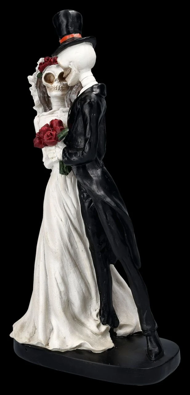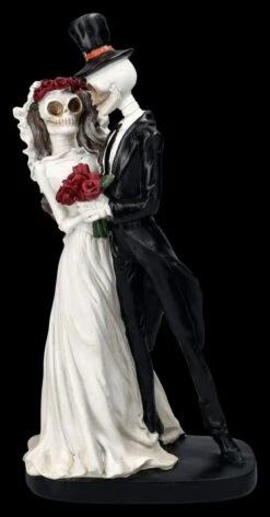 Nicht mal der Tod kann die Erinnerung an den ersten Hochzeitstanz löschen… Sie im weißen Brautkleid mit rotem Blütenkranz und einem Brautstrauß aus blutroten Rosen und er im Smoking mit Zylinder tanzen innig den Hochzeitstanz. Das lustige Hochzeitspaar wurde aus handbemaltem Kunststein (Polyresin) gefertigt. Die 33,5 cm hohe, 20 cm breite und 12 cm tiefe Skelettfigur ist nicht nur ein vielsagendes Geschenk für ein Brautpaar, sondern auch eine ungewöhnliche und humorvolle Deko für die Hochzeitstafel.