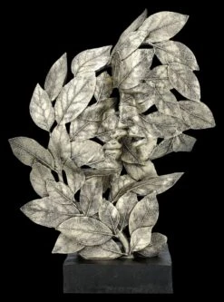Inmitten silbrig zarter und filigraner Blätter entdeckt man erst bei genauem Hinsehen einen schönen Frauenkopf, der mit geschlossenen Augen gerade den zarten Kuss des Mannes erwartet. Die kunstvolle Skulptur aus Blättern ist eine faszinierende Darstellung eines Kusses als ‚Natürliche Emotion‘ und strahlt, ohne kitschig zu wirken, doch auf moderne Art eine leidenschaftliche Atmosphäre aus. Die raffiniert angeordneten Blätter sind bei dieser zauberhaften Skulptur aus handbemaltem Kunststein (Polyresin) außerordentlich effektvoll inszeniert. Mit dem Podest ist die wunderbare Skulptur ‚Kuss‘ 36,5 cm hoch, 28 cm breit und 11 cm tief und wird garantiert überall zum absoluten Blickfang. Sie ist aber auch ein reizvolles und bezauberndes Geschenk für seine Liebste oder den Liebsten.