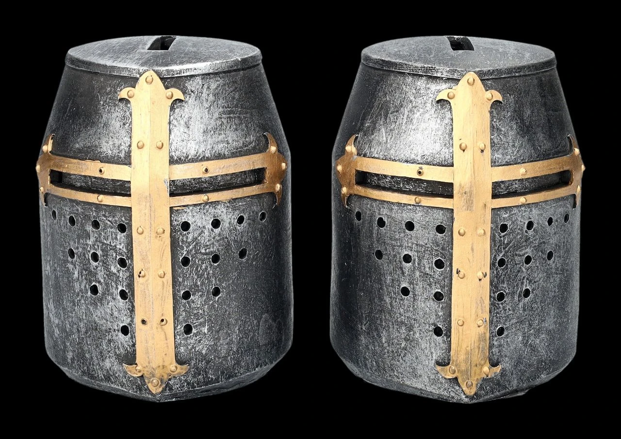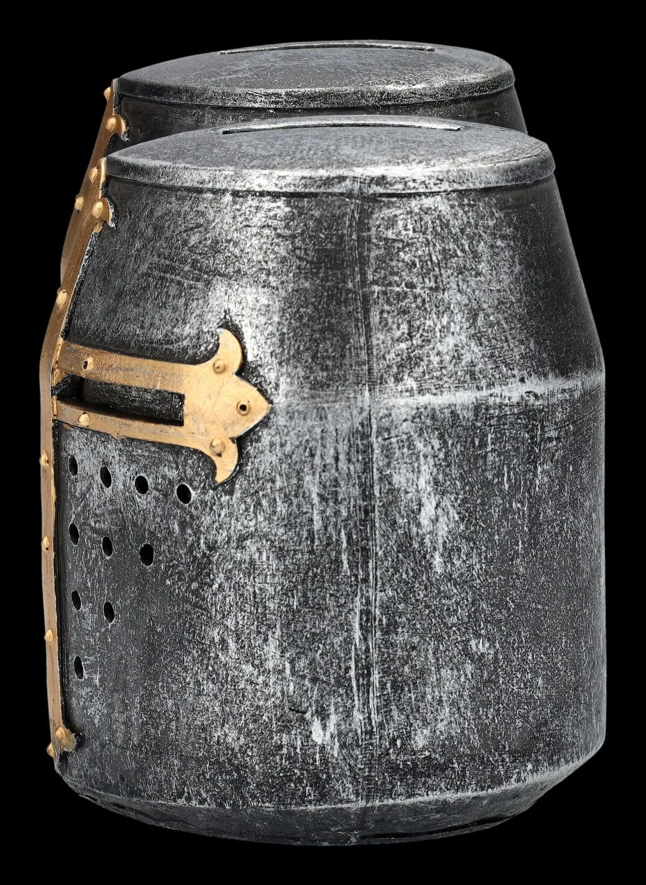 Auch kleine Ritter brauchen für das eine oder andere mal einen Notgroschen. Mit diesem Kreuzritterhelm lässt es sich auch gleich mit dem besten Freund gemeinsam sparen, denn die tolle Spardose gibt es gleich im Doppelpack. Die silberfarbenen und mit goldenen Akzenten handbemalten Kreuzritterhelme im 2er Set sind je 10 cm hoch, je 7,5 cm breit und je 8,5 cm tief. Sie sind aus Kunststein (Polyresin) gefertigt und haben auf der Unterseite eine Entnahmeöffnung. Schon etwas aufgefüllt, sind diese beiden Kreuzritterhelme als Spardose auch ein perfektes Geschenk für kleine und große Ritter.