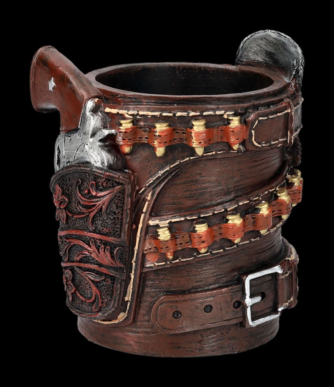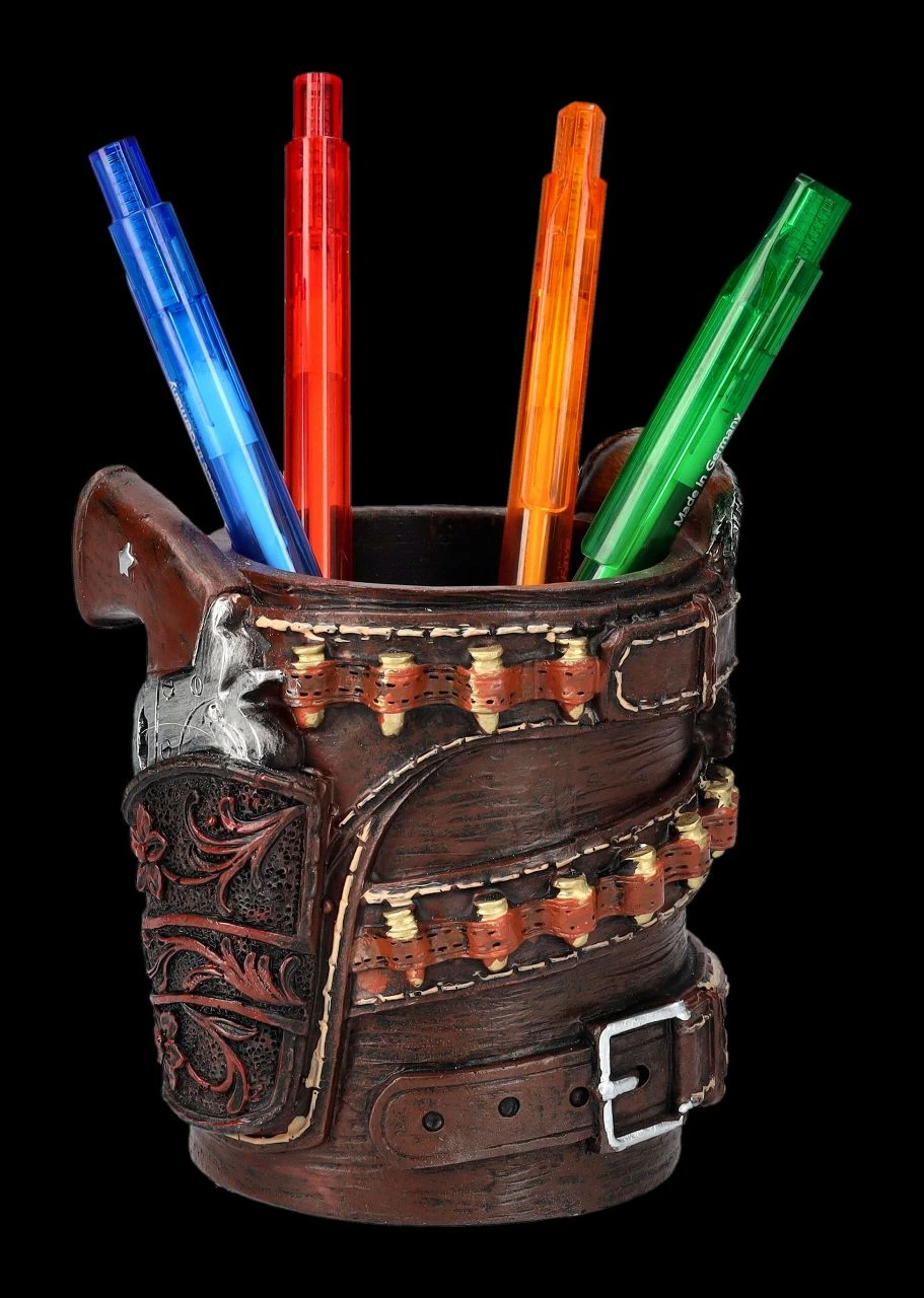 Da hat sich ein Cowboy viel Mühe gegeben und seinen Gürtel eng um einen Stiftebecher herumgewunden. Der braune Gürtel mit der silberfarbenen, verzierten Gürtelschnelle wirkt beinahe wie aus Leder gefertigt. Natürlich dürfen auch Holster und Patronenhülsen nicht fehlen. Wer diesen 10 cm hohen, 9 cm breiten und 8,5 cm tiefen Stiftebecher aus handbemaltem Kunststein (Polyresin) auf einem Schreibtisch entdeckt, weiß sofort, dass er einen Western-Fan vor sich hat. Innen hat er mit H: 8 cm x B: 5,5 cm x T: 5,5 cm genug Platz für die wichtigsten Stifte. Die Lieferung erfolgt ohne Dekoration.