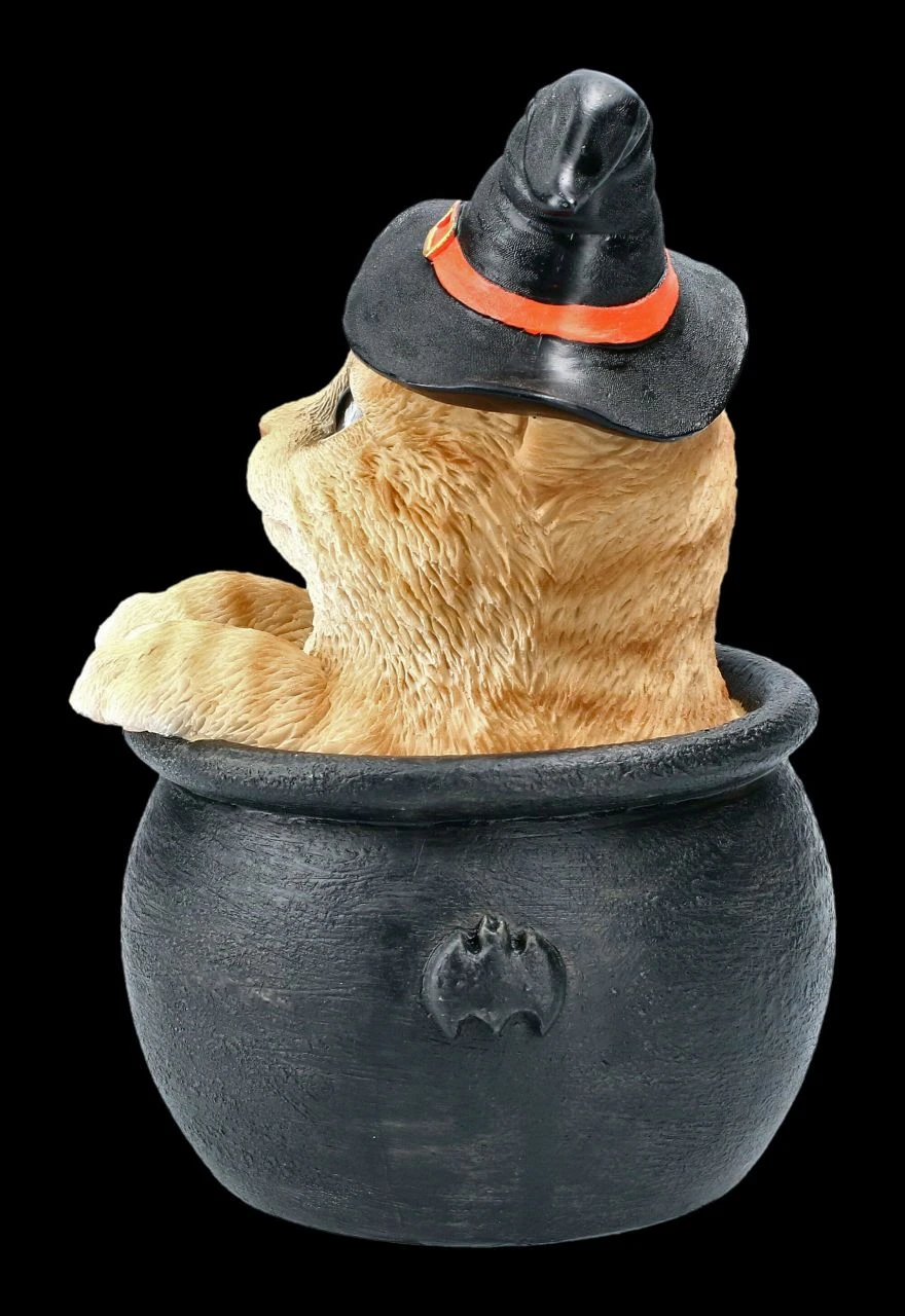 Sucht mich denn keiner, scheint sich dieses süße rote Tigerkatzenbaby zu fragen. Da war das Versteck im Hexenkessel wohl doch zu gut, oder macht mich vielleicht mein Hexenhut unsichtbar? Diese kleine süße Tabby Hexen-Katze ist mit dem Kessel 16,0 cm hoch, 11,0 cm breit und 10,0 cm tief und aus handbemaltem Kunststein (Polyresin). Das zauberhafte Kätzchen ist nicht nur zu Halloween ein tolles Geschenk für Katzenfreunde.