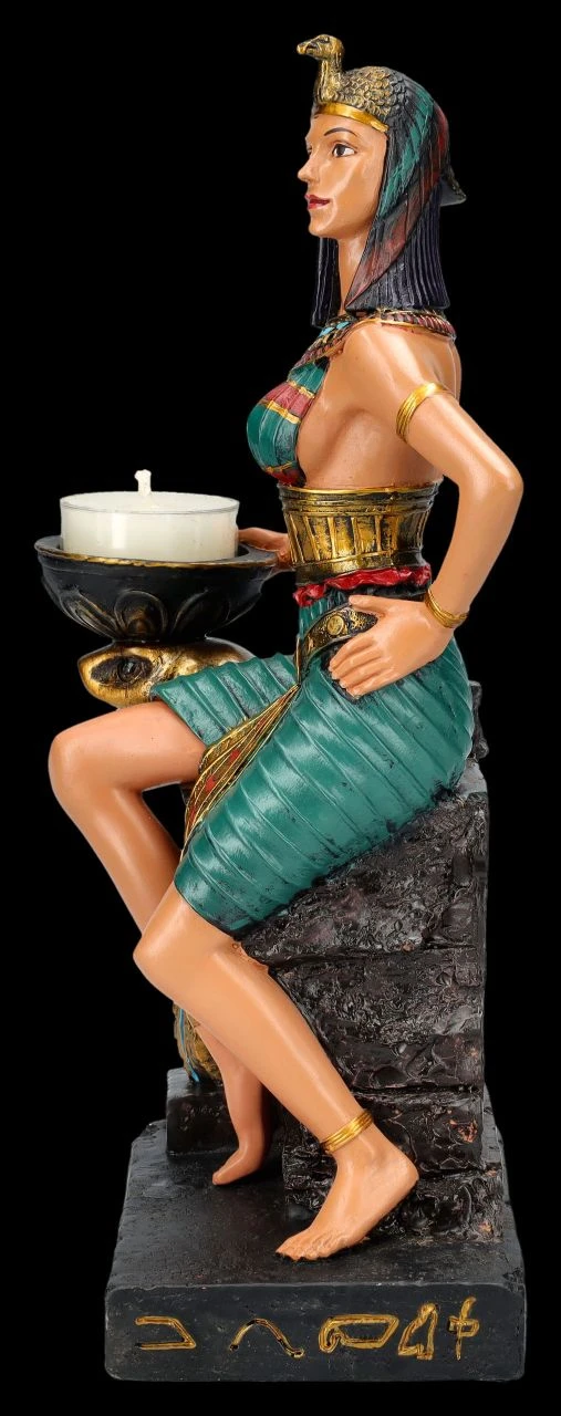 Stolz, selbstbewusst und angstfrei sitzt die Ägyptische Priesterin neben der goldenen Königskobra auf einem hohen Stein. Auf dem Kopf trägt die Kobra eine schöne Schale, in der ein Teelicht abgestellt werden kann. Der Teelichthalter mit der schönen Priesterin ist aus Kunststein (Polyresin) und wurde in schönen Farben mit goldenen Akzenten von Hand bemalt. Er ist 24,5 cm hoch, 12 cm breit und 8 cm tief und bringt altägyptisches Flair in jeden Wohnbereich. In der Schale hat ein Teelicht bis zu einem Durchmesser von 3,8 cm Platz. Das Teelicht ist in der Lieferung nicht enthalten. Die Ägyptische Priesterin mit der Kobra ist als Teelichthalter nicht nur sehr dekorativ, sie ist auch ein perfektes Geschenk für jeden, der sich für das Alte Ägypten interessiert.