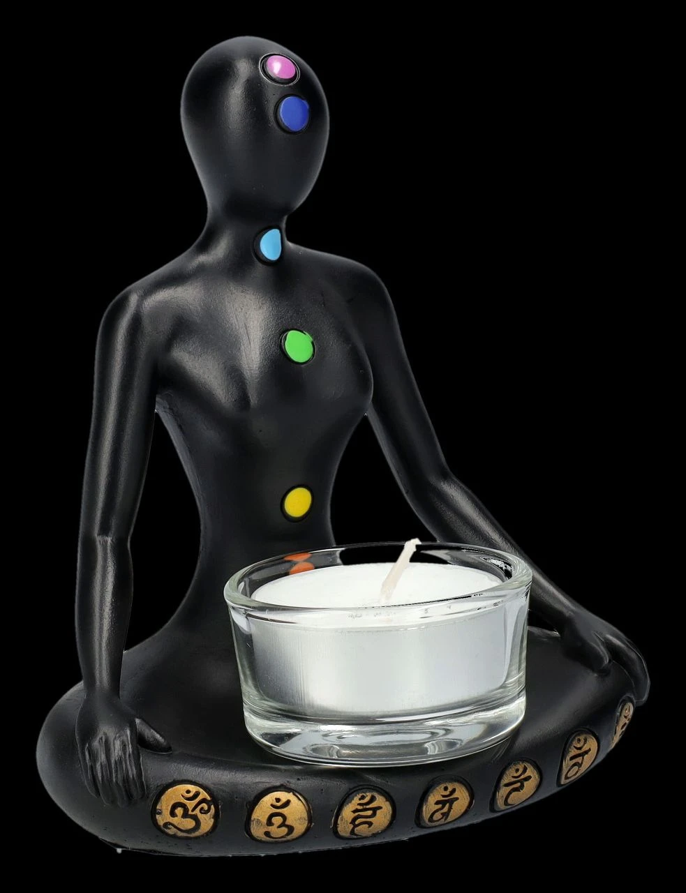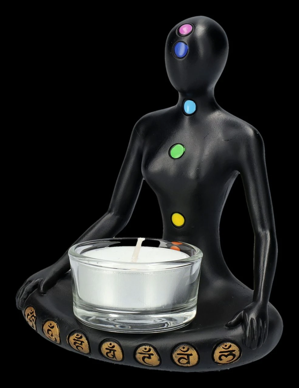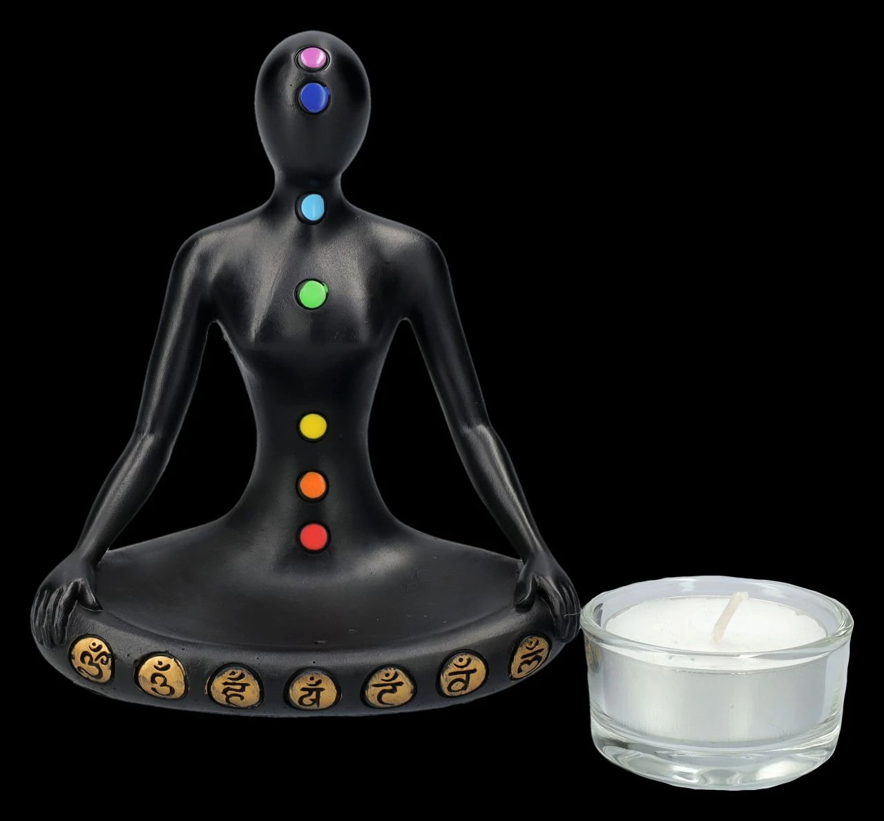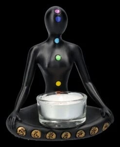 Die schlichte und gerade daher sehr modern wirkende Yogafigur als Teelichthalter mit den leuchtenden Chakra-Punkten auf dem schwarzen Körper ist perfekt als dekorativer Blickfang für jedes Yogastudio geeignet. Der Teelichthalter bringt aber auch in den persönlichen Yoga-Bereich die richtige Atmosphäre. Der elegante Teelichthalter aus der Summit Collection.ist 12 cm hoch, 10,5 cm breit und 9 cm tief. Er ist aus handbemaltem Kunststein (Polyresin) und hat eine Schale aus Glas zur Aufnahme der Teelichter. Die Lieferung erfolgt ohne Teelicht.