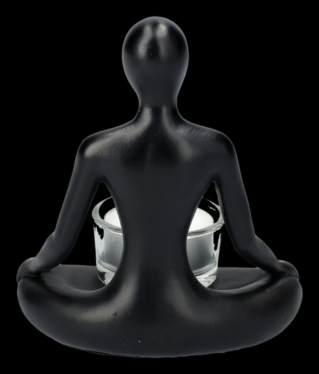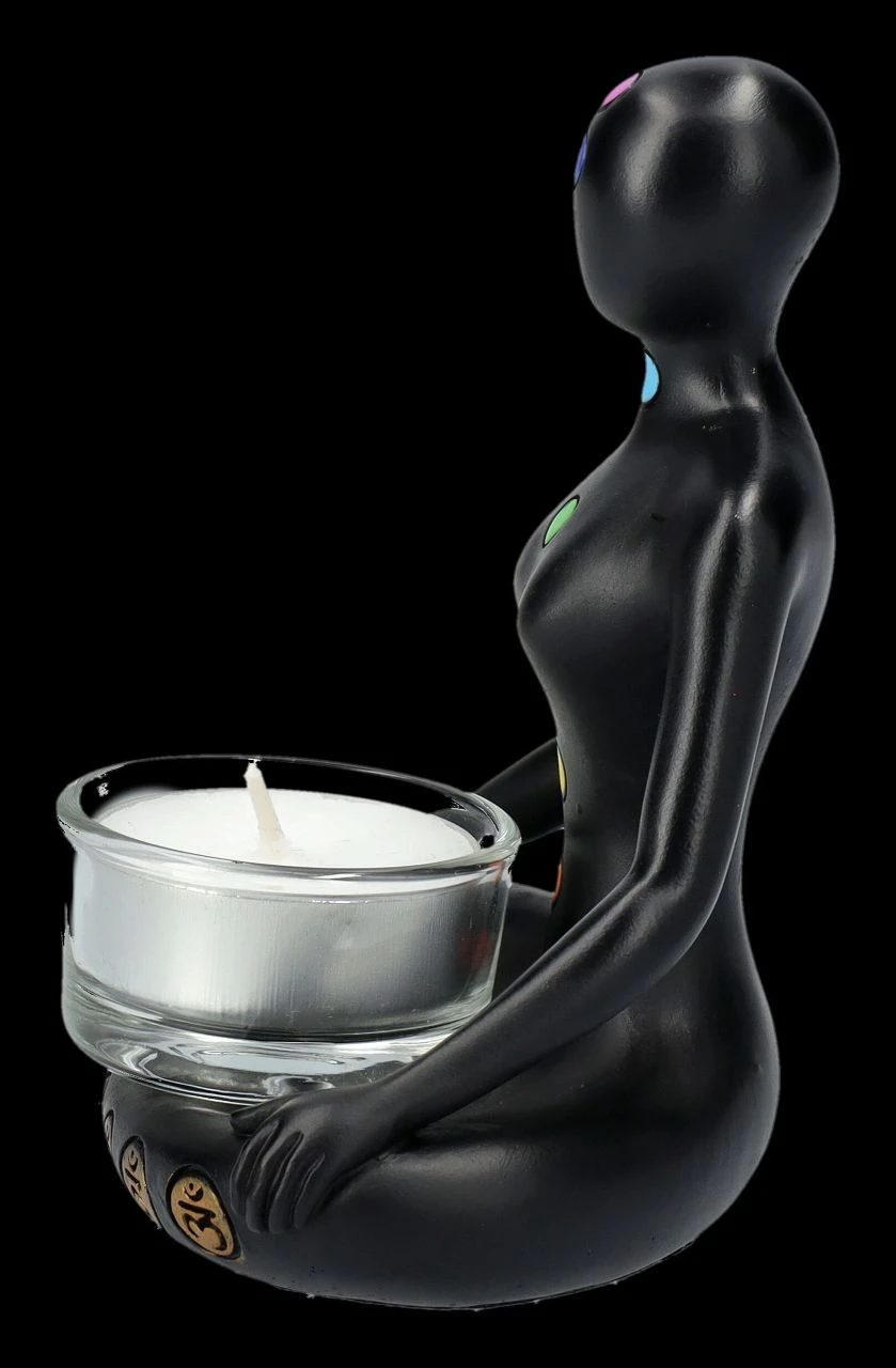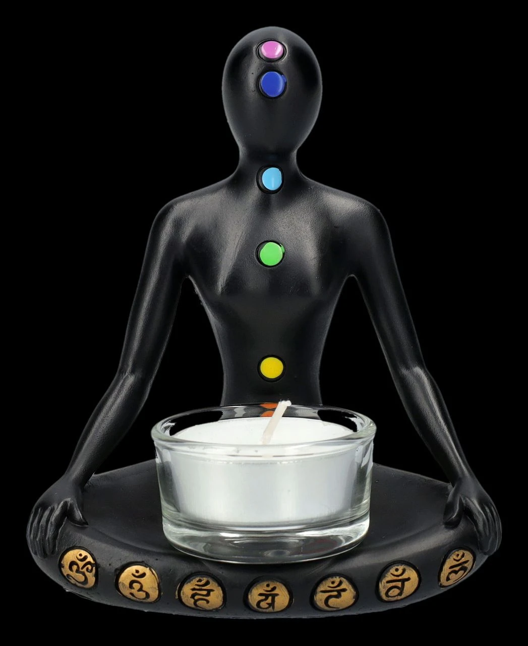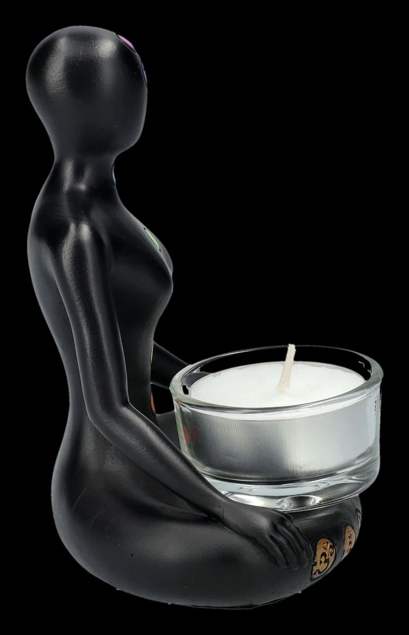 Die schlichte und gerade daher sehr modern wirkende Yogafigur als Teelichthalter mit den leuchtenden Chakra-Punkten auf dem schwarzen Körper ist perfekt als dekorativer Blickfang für jedes Yogastudio geeignet. Der Teelichthalter bringt aber auch in den persönlichen Yoga-Bereich die richtige Atmosphäre. Der elegante Teelichthalter aus der Summit Collection.ist 12 cm hoch, 10,5 cm breit und 9 cm tief. Er ist aus handbemaltem Kunststein (Polyresin) und hat eine Schale aus Glas zur Aufnahme der Teelichter. Die Lieferung erfolgt ohne Teelicht.