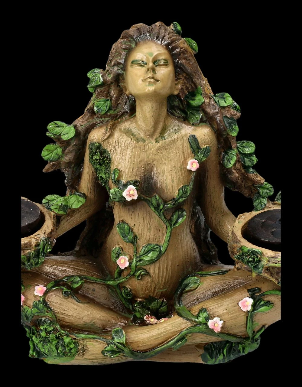 Wie aus einem uralten Stamm herausgewachsen, sitzt die Erdmutter meditierend inmitten grüner Blätter mit Blüten und scheint alle guten Geister zum Schutz der Natur anzurufen. Um die äußerst wichtige Balance in der Natur zu demonstireren, gibt es in beiden Händen Halterungen zur Aufnahme von Teelichtern. Der wunderschön gestaltete Teelichthalter ist außerordentlich detailreich aus Kunststein (Polyresin) gefertigt und liebevoll handbemalt. Mit der Höhe von 14 cm, der Breite von 19 cm und der Tiefe von 8 cm ist dieser magische Teelichthalter eine schöne Lichtquelle und Dekoration, die sofort alle Blicke auf sich ziehen wird. Der außergewöhnliche Teelichthalter Mutter Erde Balance of Nature ist aber auch ein wunderbares Geschenk für jeden, der die Natur liebt und schützen möchte. Die Lieferung erfolgt ohne Teelicht.
