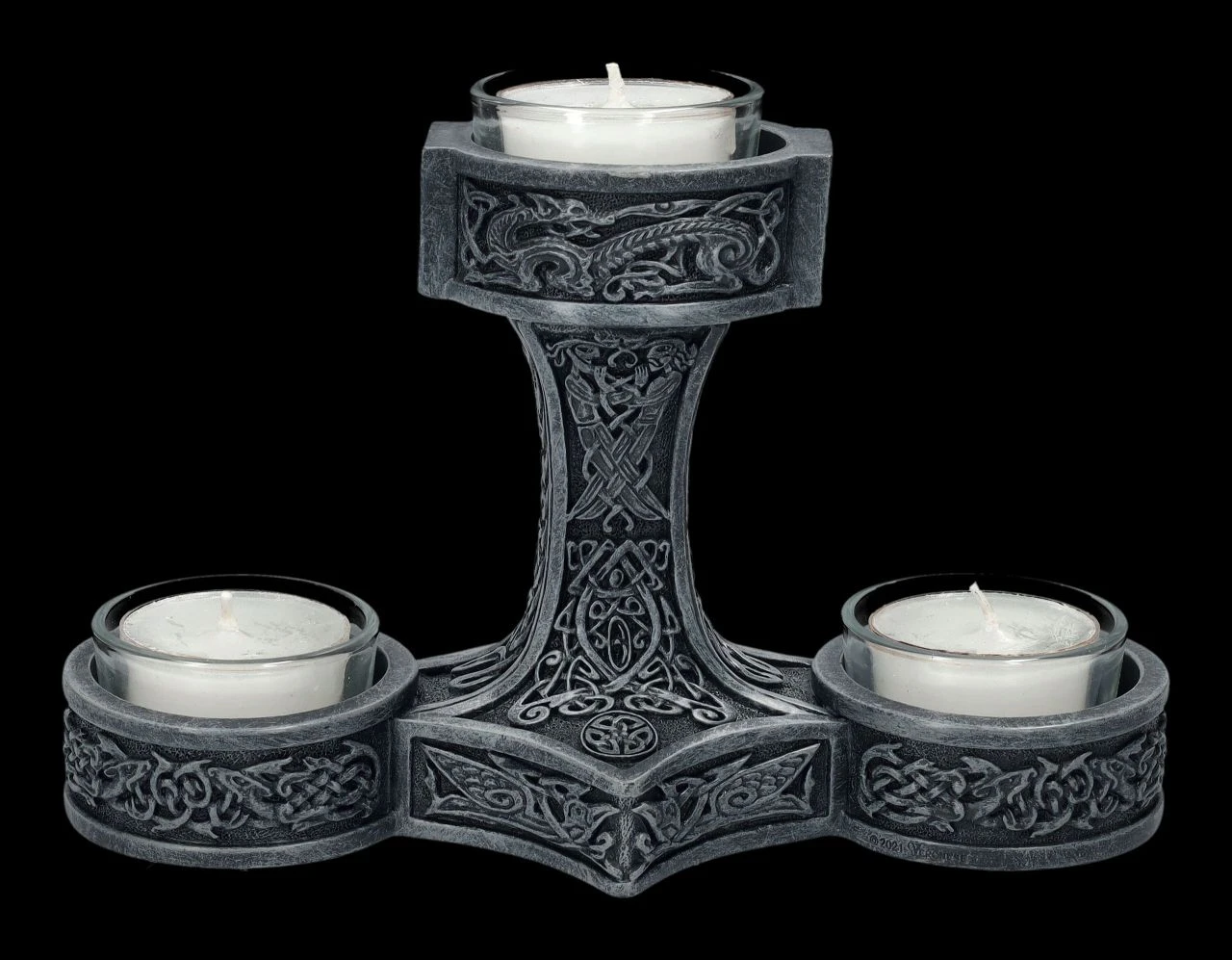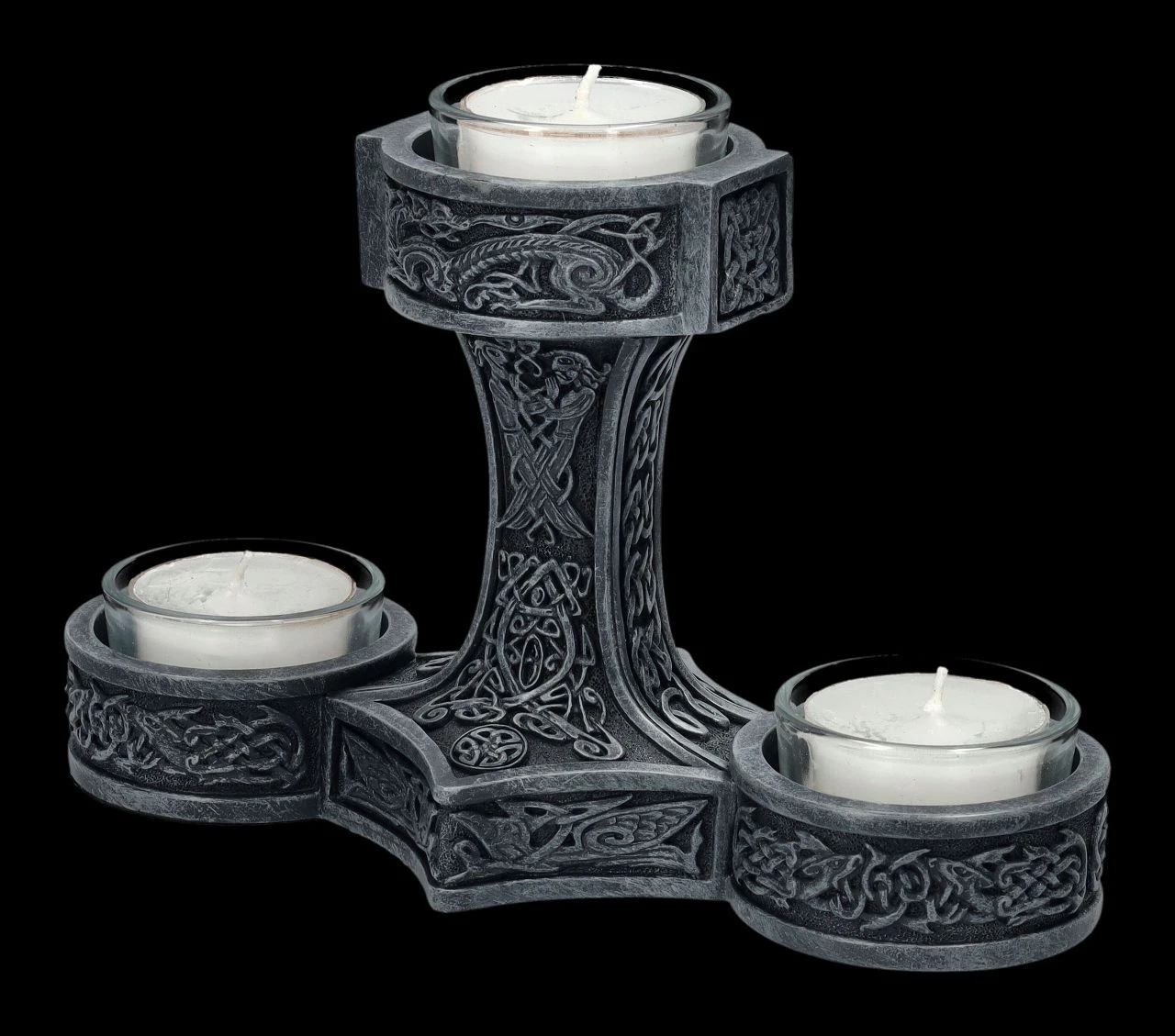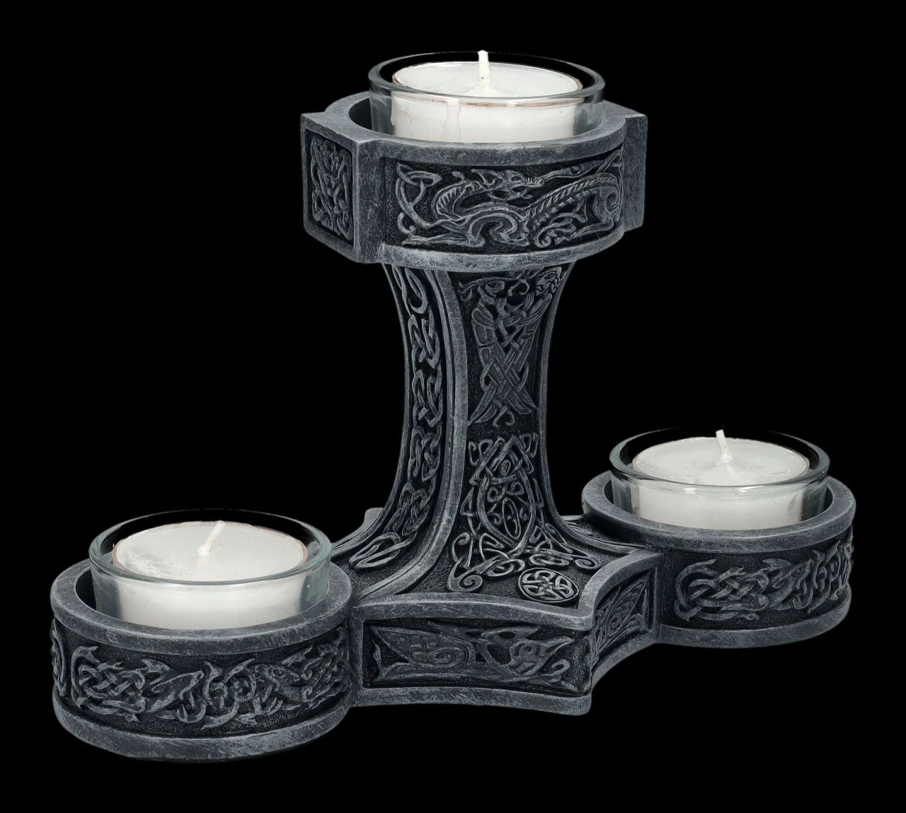 Aus der Studio Collection von Veronese stammt dieser außergewöhnliche Teelichthalter in Form von Thor’s Hammer, der auch als Geschenk für besondere Freunde sicher Freude macht. Der 12,5 cm hohe, 18 cm breite und 8,5 cm tiefe Teelichthalter aus sorgfältig handbemaltem Kunststein (Polyresin) ist eine wahrlich unverzichtbare Deko für alle Nordmänner. Der fantastische Teelichthalter kann drei Teelichter mit dem Durchmesser von ca. 3,6 cm und der Höhe von ca. 1,3 cm aufnehmen. Die Teelichter sind in der Lieferung nicht enthalten.