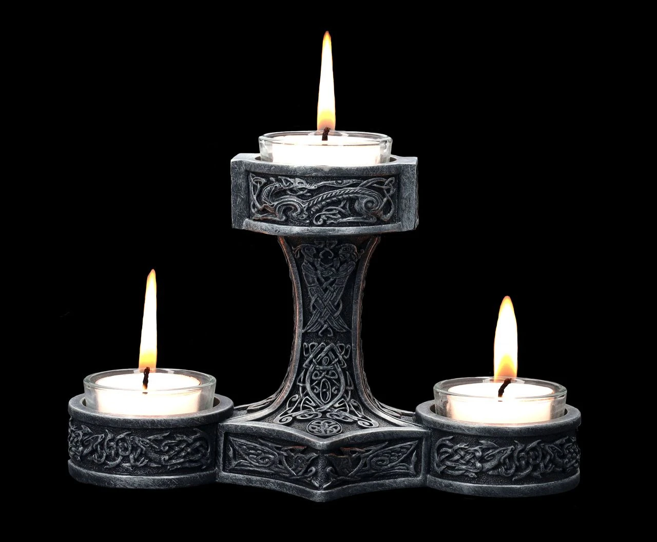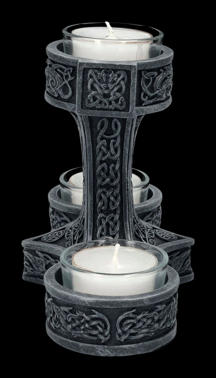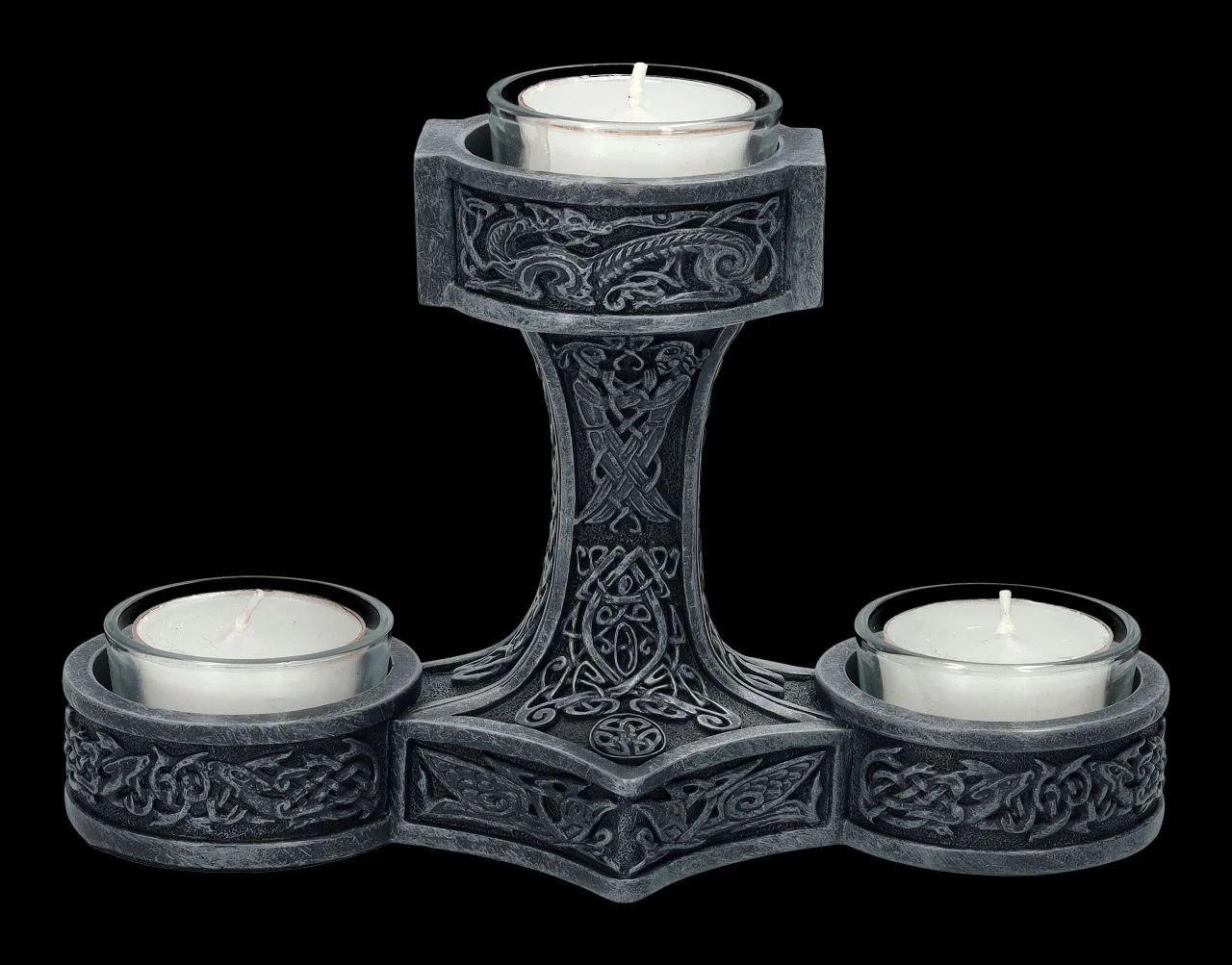 Aus der Studio Collection von Veronese stammt dieser außergewöhnliche Teelichthalter in Form von Thor’s Hammer, der auch als Geschenk für besondere Freunde sicher Freude macht. Der 12,5 cm hohe, 18 cm breite und 8,5 cm tiefe Teelichthalter aus sorgfältig handbemaltem Kunststein (Polyresin) ist eine wahrlich unverzichtbare Deko für alle Nordmänner. Der fantastische Teelichthalter kann drei Teelichter mit dem Durchmesser von ca. 3,6 cm und der Höhe von ca. 1,3 cm aufnehmen. Die Teelichter sind in der Lieferung nicht enthalten.