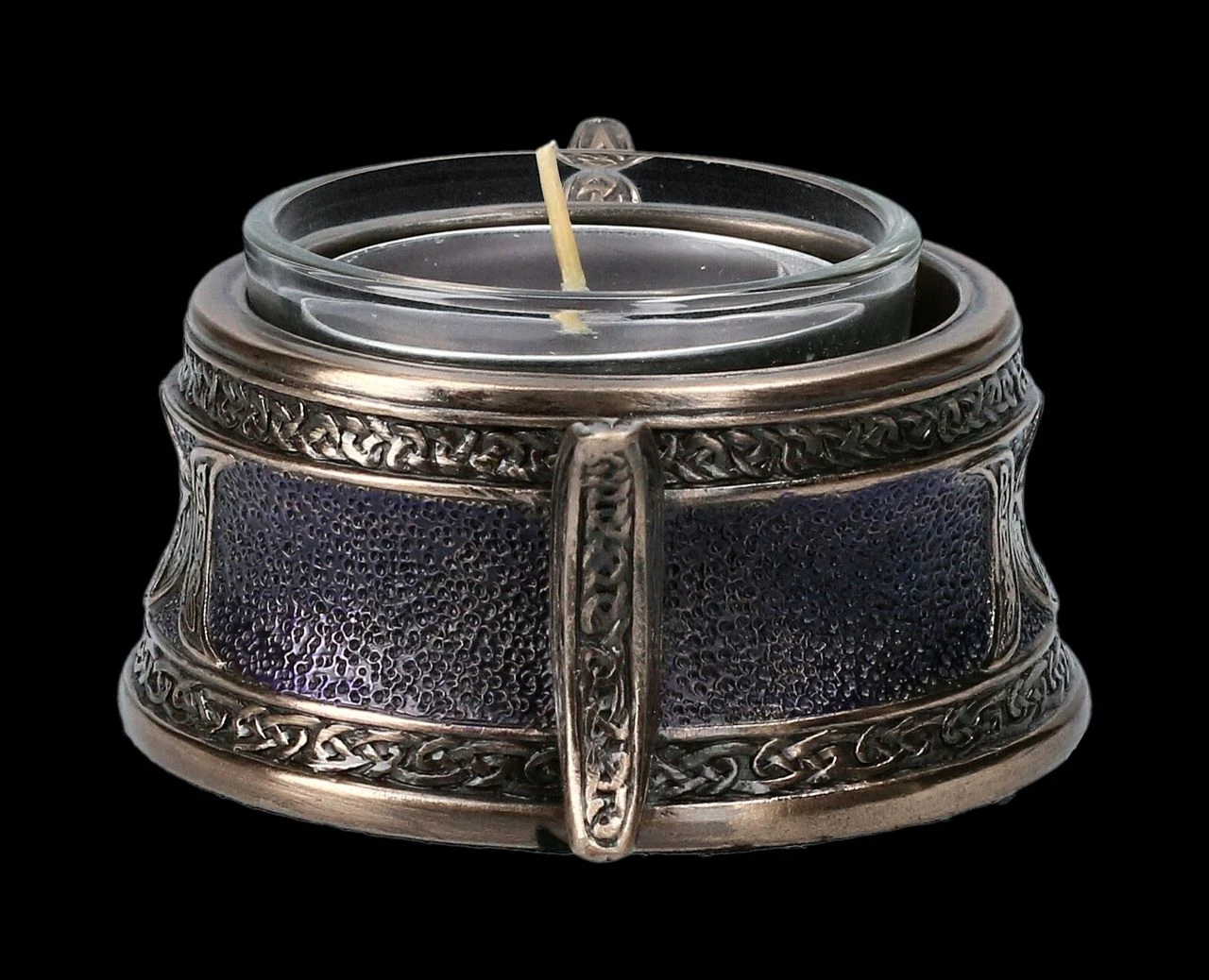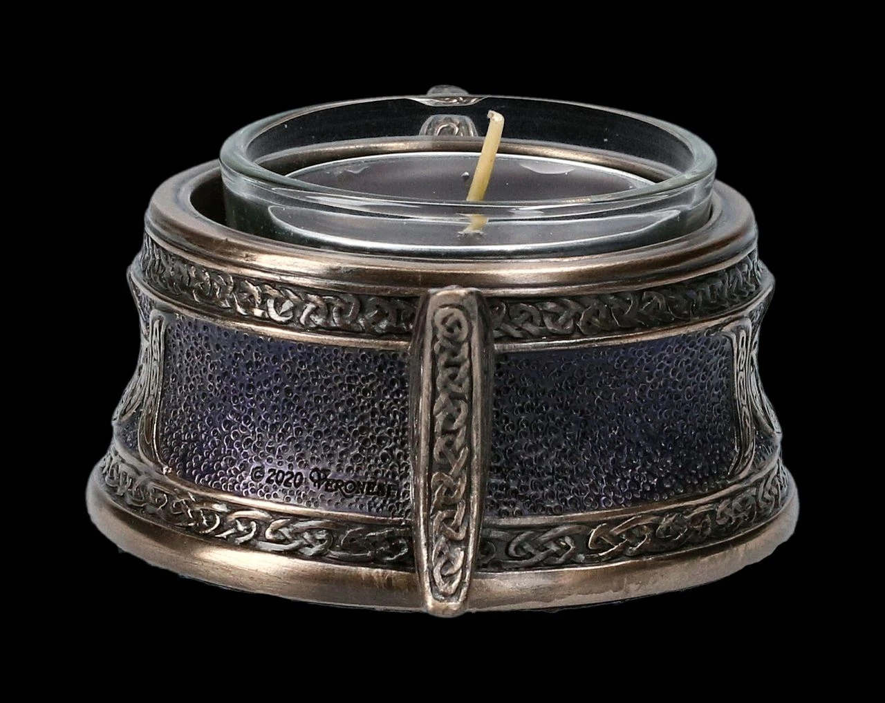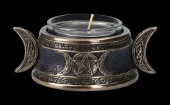 Der schön verzierte Teelichthalter aus der Studio Collection von Veronese spendet Ihnen perfekt das Licht für die magischen Momente der Entspannung nach einem langen Arbeitstag. Während die runde, mit dem Trinity Motiv verzierte Schale den Vollmond bildet, sind an den beiden Seiten des 4 cm hohen, 9 cm breiten und 7 cm tiefen Teelichthalters die beiden Mondsicheln angebracht. Der aus edel bronziertem und sehr fein coloriertem Kunststein (Polyresin) gefertigte Teelichthalter wiederholt am Rand der runden, mit keltischen Bordüren verzierten Schale das Motiv der Dreifach Göttin. Er bietet Platz für ein Teelicht mit den Maßen H: ca. 1,3 cm/ D: ca. 3,6 cm. Die Lieferung erfolgt ohne Teelicht.