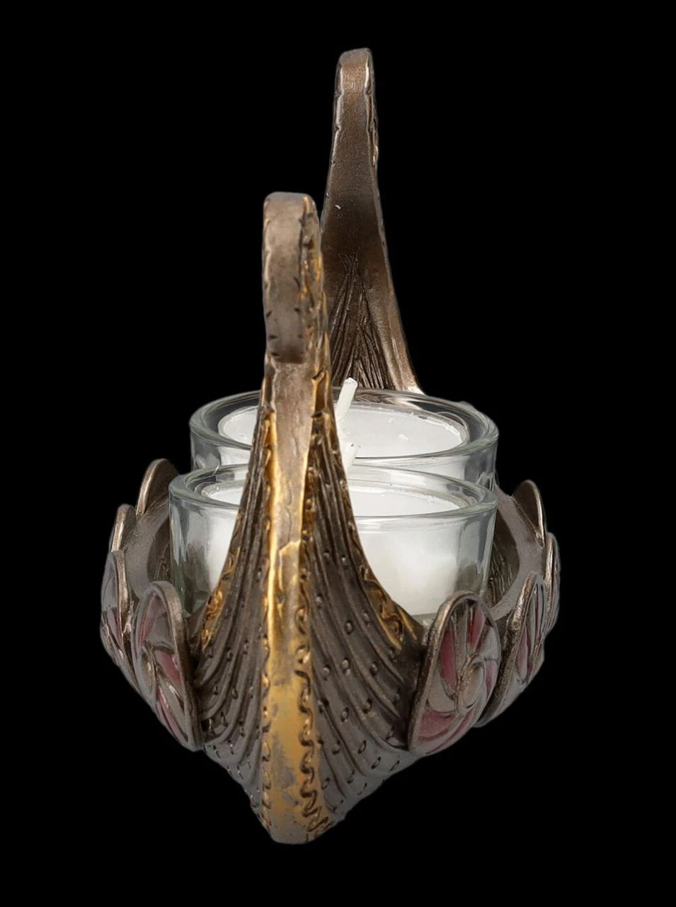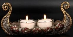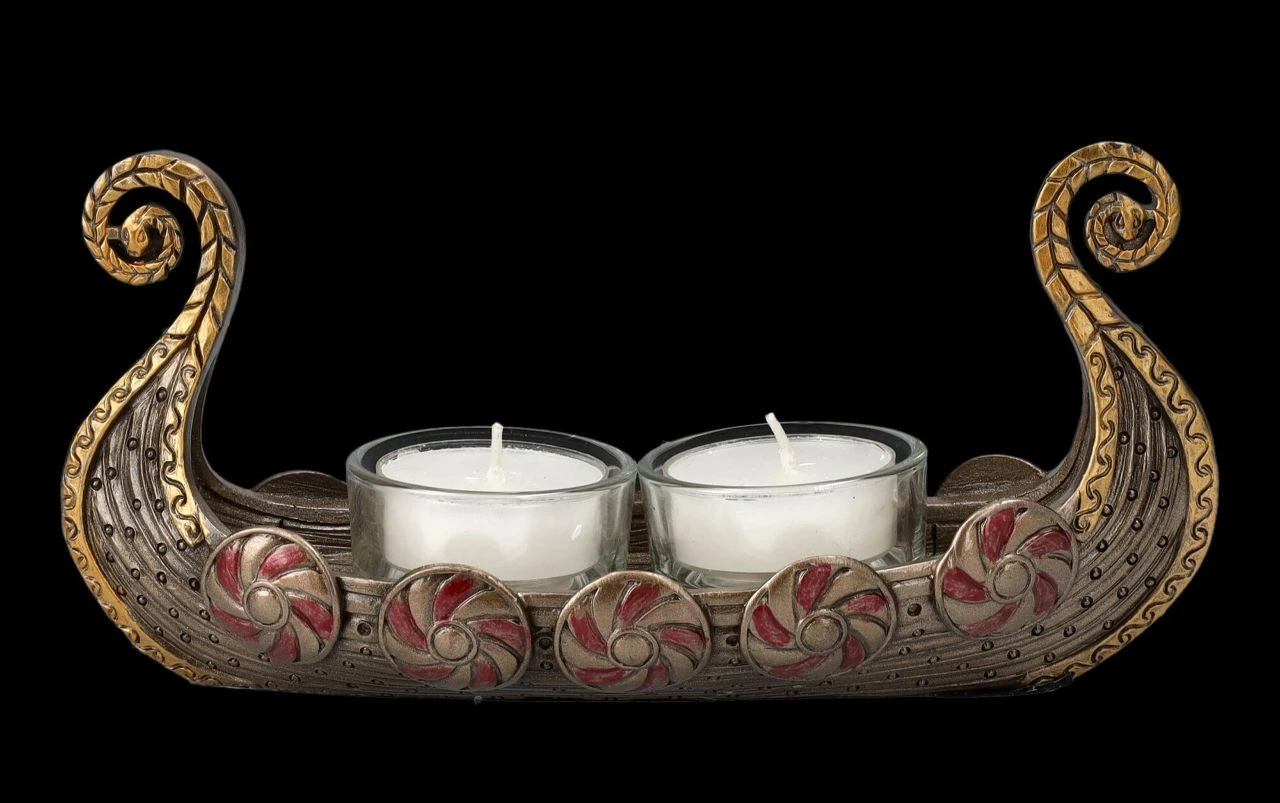 Es gehört zu dem Wikinger Bild, das jeder kennt – Drakkar, das Langboot der Wikinger, auch Drachenboot genannt. Mit diesen schnellen Schiffen erreichten die Wikinger auch weit entfernte Häfen und verbreiteten Angst und Schrecken. Für jeden Freund der Wikinger ist dieser Teelichthalter aus detailreich handbemaltem Kunststein (Polyresin) eine perfekte Deko und auch ein fantastisches Geschenk. Der 9 cm hohe, 19 cm breite und 6,5 cm tiefe Teelichthalter mit dem Wikinger Schiff Drakkar kann zwei Teelichter aufnehmen. Teelichter sind in der Lieferung nicht enthalten.