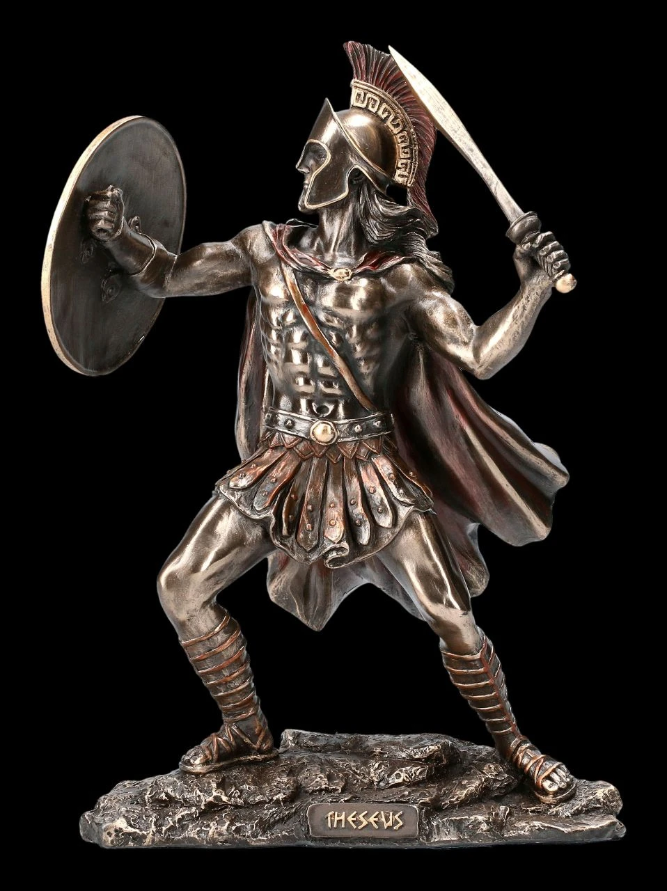 Wie auf dem einem Fels nachgebildeten Sockel dieser fantastischen Figur zu lesen ist, handelt es sich bei dem tapferen Kämpfer mit Schwert und Schild um den Königssohn Theseus, dem es einst gelungen war, das Ungeheuer Minotaurus zu besiegen. Nach der griechischen Mythologie wurden Minotaurus jedes Jahr 7 Jünglinge und Jungfrauen geopfert. Minotaurus wurde von Theseus mit Hilfe eines Fadens, mit dem er die Jünglinge und Jungfrauen mit Ariadne aus dem Labyrinth befreien konnte, überlistet und anschließend besiegt. Die fantastische Statuette des Theseus im Kampf ist aufwändig aus Kunststein (Polyresin) gefertigt und mit großer Sorgfalt bronziert und coloriert. Die Figur des kämpfenden Theseus aus der Studio Collection von Veronese ist 20 cm hoch, 15 cm breit und 10 cm tief. Sie ist ein wirklich effektvolles Geschenk für alle Fans der Alten Griechen und ein stilvoller Blickfang in jedem Wohn- oder Arbeitsbereich.