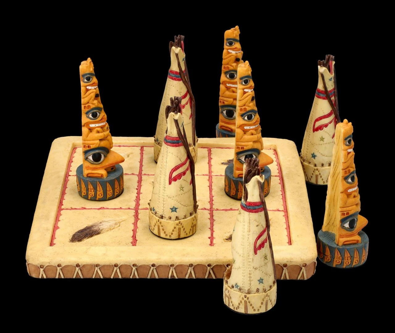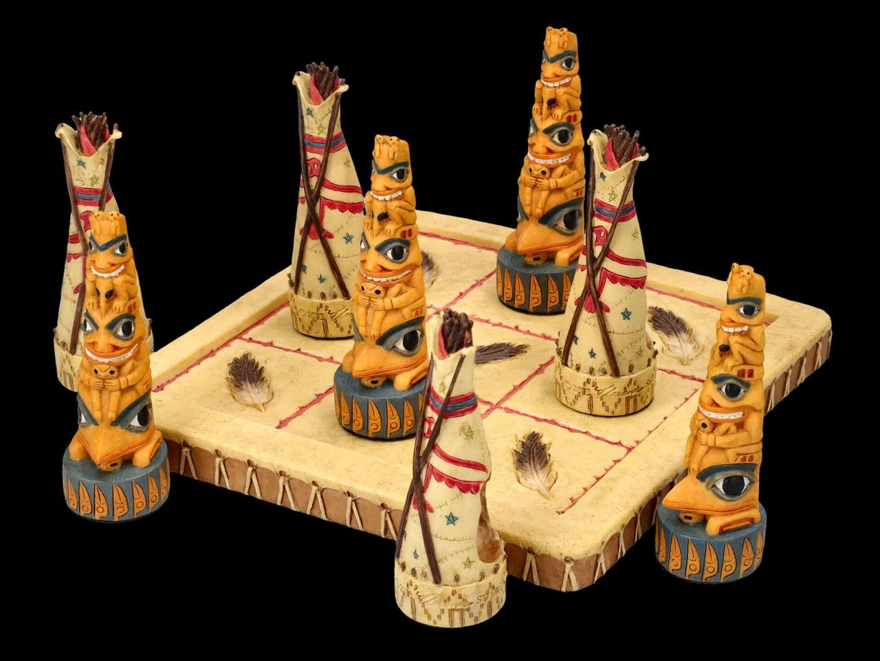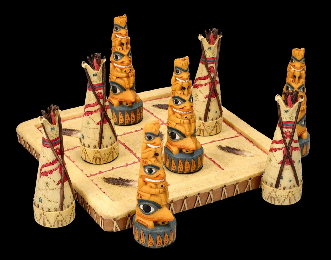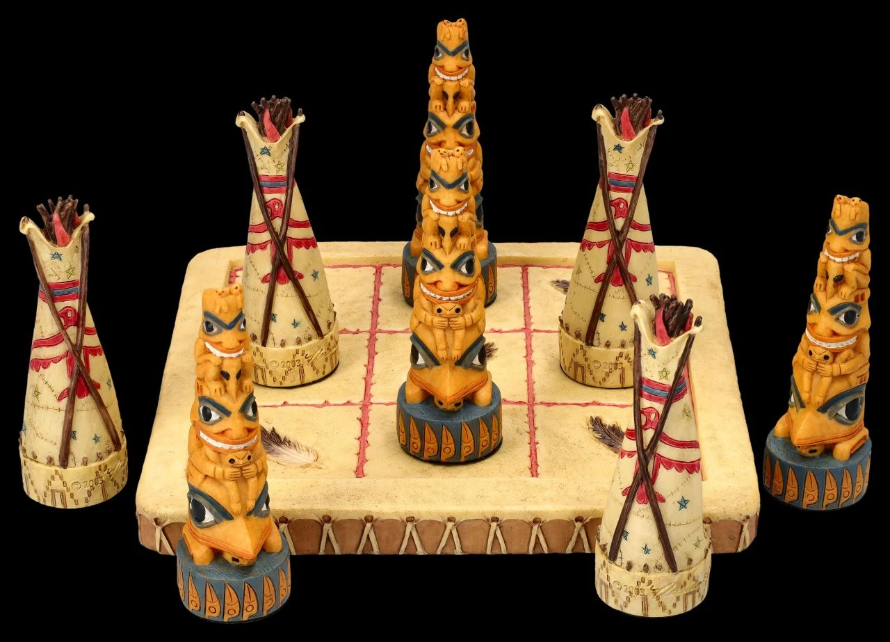 Je 4 detailreiche Totems und Tipis der Ureinwohner und ein Spielbrett sind bei diesem Tic-Tac-Toe Spiel aus toll handbemaltem Kunststein (Polyresin) mit dabei. Auf dem quadratischen Spielfeld mit den neun Feldern stellen die beiden Spieler abwechselnd ihre Figur auf eines der Felder. Derjenige, der als erster drei seiner Figuren in einer Zeile, Spalte oder Diagonale aufgestellt hat, der hat gewonnen. Die 8 Figuren sind je 8 cm hoch, 2,5 cm breit und je 2,5 cm tief und das Spielfeld hat eine Fläche von 15 x 15 cm und eine Höhe von 1 cm. Das ist doch ein fantasievolles Geschenk und eine perfekte Aufforderung, mal wieder ein Spiel am Brett zu spielen.