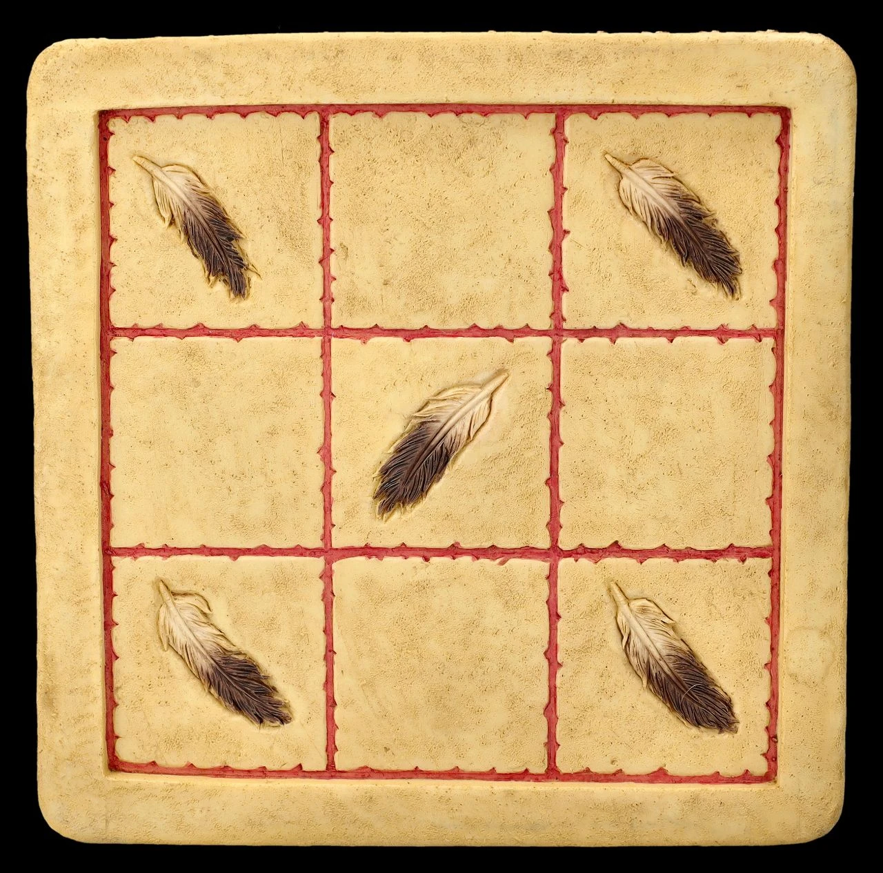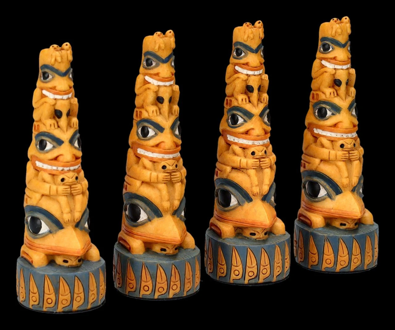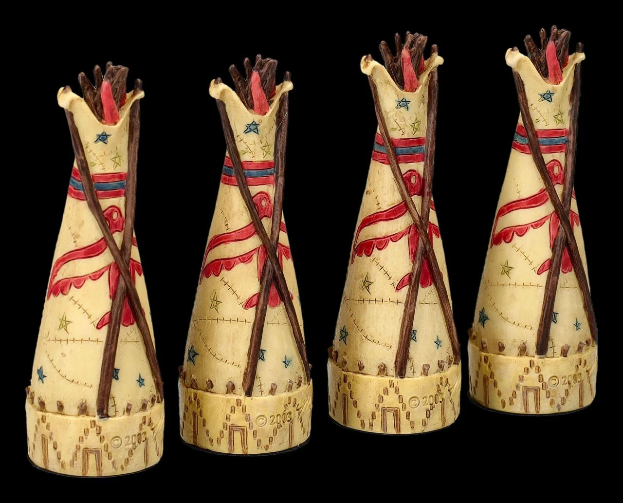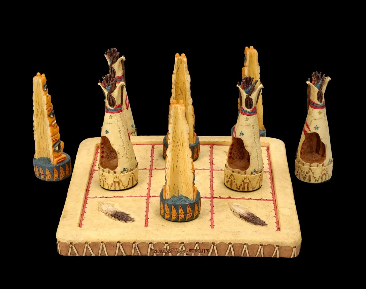 Je 4 detailreiche Totems und Tipis der Ureinwohner und ein Spielbrett sind bei diesem Tic-Tac-Toe Spiel aus toll handbemaltem Kunststein (Polyresin) mit dabei. Auf dem quadratischen Spielfeld mit den neun Feldern stellen die beiden Spieler abwechselnd ihre Figur auf eines der Felder. Derjenige, der als erster drei seiner Figuren in einer Zeile, Spalte oder Diagonale aufgestellt hat, der hat gewonnen. Die 8 Figuren sind je 8 cm hoch, 2,5 cm breit und je 2,5 cm tief und das Spielfeld hat eine Fläche von 15 x 15 cm und eine Höhe von 1 cm. Das ist doch ein fantasievolles Geschenk und eine perfekte Aufforderung, mal wieder ein Spiel am Brett zu spielen.