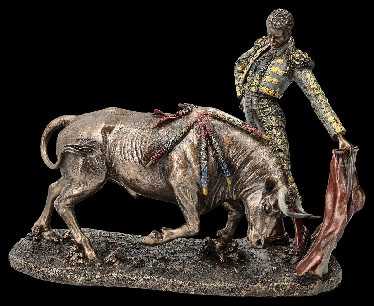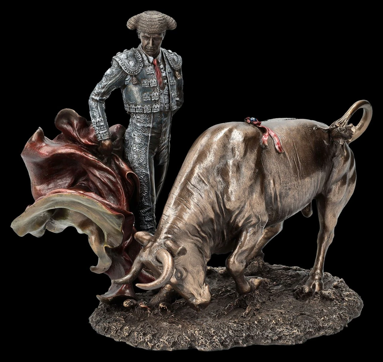 Matadoren beim Stierkampf, wie man sie vielleicht aus der Arena, aber sonst aus zahlreichen Abbildungen und auch aus Filmen kennt, zeigen diese beiden Torero Figuren im Set. Auch wenn bekannt ist, dass Stiere (genau wie alle Rinder) die Farbe Rot gar nicht sehen können, da sie rot-farbenblind sind, gehört das Wedeln mit dem roten Tuch – der Muleta – zum traditionellen Stierkampf dazu. Der Stier des in Blau gekleideten Matadors lässt sich von dem roten Tuch genauso reizen, wie der Stier des in gelben Farben gekleideten Matadors. Das fantastische Figuren Set aus der Studio Collection von Veronese ist bis zu der aufwändig bestickten Kleidung mit Weste und Kniehose der Toreros und ihrer perfekten, stolzen Haltung wunderbar detailreich dargestellt. Auch die Reaktionen und Bewegungen der Stiere sind mit viel Liebe zum Detail ausgearbeitet. Das Torero Figuren-Set ist aus edel bronziertem und zurückhaltend, aber sehr fein coloriertem Kunststein (Polyresin) gefertigt. Die Figur des in Blau gekleideten Matadors mit seinem Stier ist 22 cm hoch, 26 cm breit und 19,5 cm tief und die des in Gelb gekleideten Matadors mit dem angreifenden Stier ist 22,5 cm hoch, 29 cm breit und 13,5 cm tief. Die Matadoren beim Stierkampf sind außerordentlich dekorativ und ein effektvoller Blickfang.