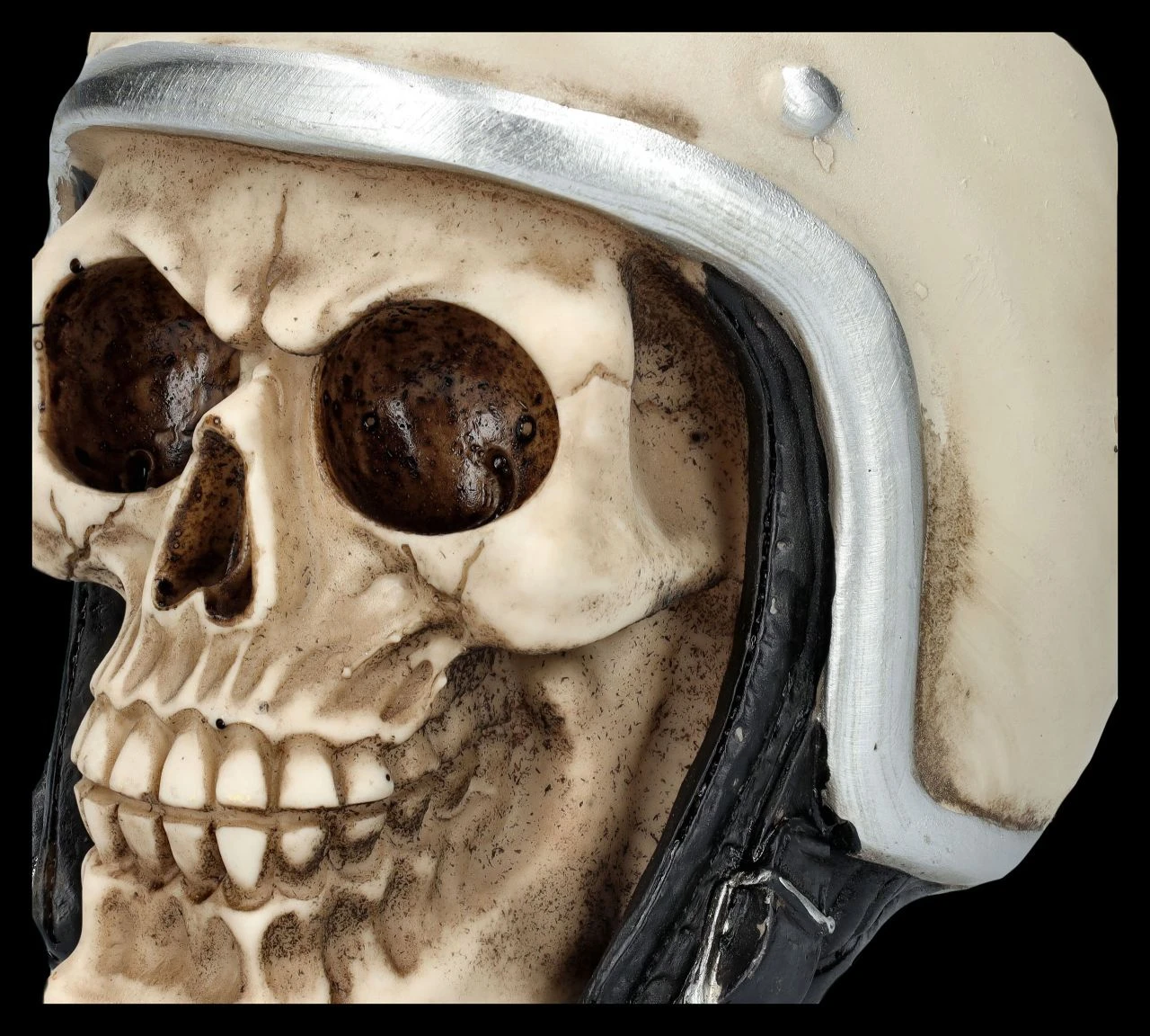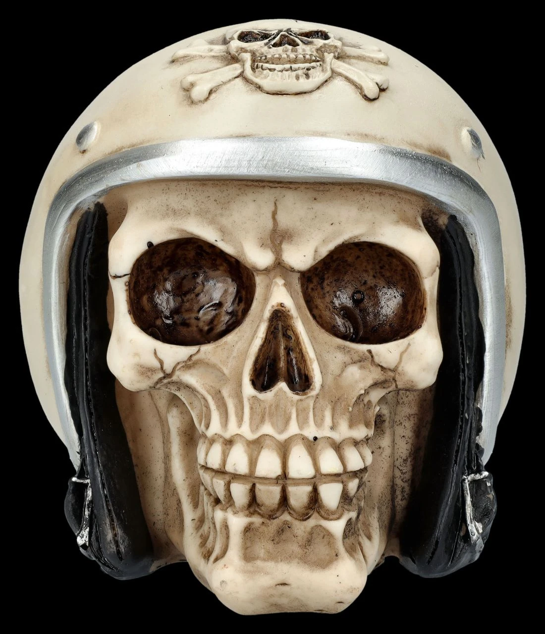 Für Biker ist dieser witzige grinsende Totenschädel mit dem Motorradhelm im Vintage-Look das perfekte Geschenk. Der von Hand bemalte 13,5 cm hohe, 13 cm breite und 15 cm tiefe Totenkopf ist detailreich aus Kunststein (Polyresin) gefertigt. Der etwas exzentrische Totenkopf mit dem beigen Helm wird mit Sicherheit auch Sammler begeistern.