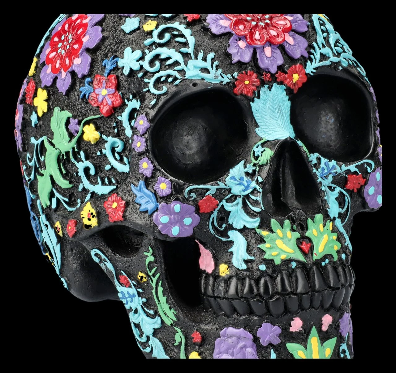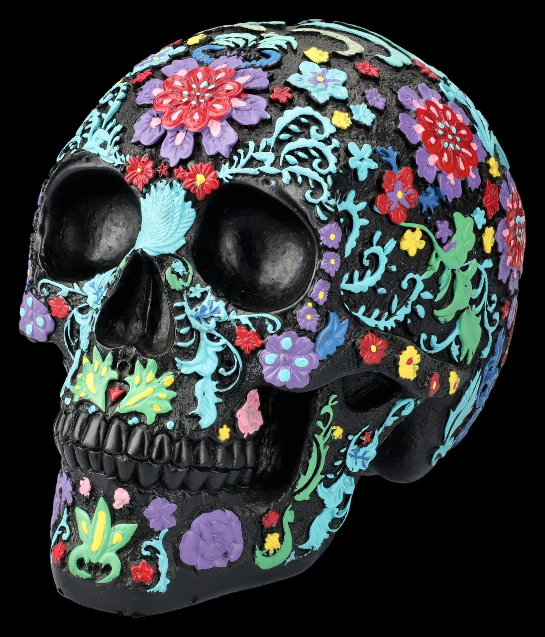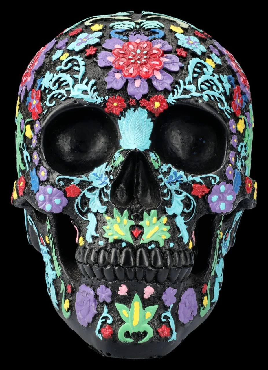 Der schwarze Totenkopf ist über und über mit bunten, fröhlichen Blumen und Blütenranken verziert. Der künstlerische Schädel mit dem bunten Blumenmuster im Hippie-Style ist auf jeden Fall eine zwar ungewöhnliche, aber zumindest sehr auffällige und fröhliche Dekoration. Der ungewöhnliche, aber sehr dekorative Totenkopf stammt aus der Summit Collection. Er ist detailreich aus handbemaltem Kunststein (Polyresin) gefertigt und 16 cm hoch, 13 cm breit und 20 cm tief. Der schwarze Totenkopf mit dem bunten Blumenmuster ist sicher auch für Sammler ein fantasievolles Geschenk.