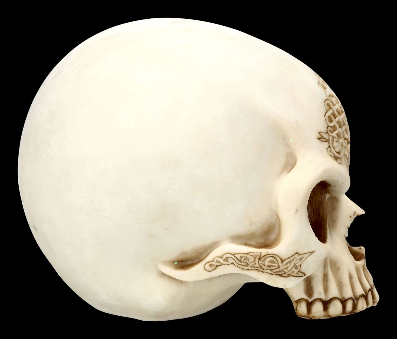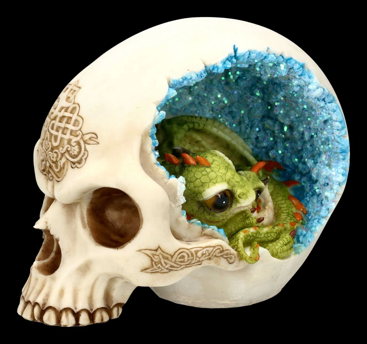 Der mit einem keltischen Muster wie ein Brandzeichen verzierte Totenkopf beherbergt etwas gans Besonderes. Ein Drache hat sich mit seinem Jungen eine Kristallhöhle, die sich in diesem außergewöhnlichen Schädel gebildet hat, als Nest ausgesucht. Die beiden haben sich richtig zufrieden in die Höhle eingekuschelt. Der Totenkopf mit dem keltischen Muster und der Kristallhöhle ist 12 cm hoch, 15 cm breit und 11cm tief.Der Totenkopf Celtic Cave wurde sehr detailreich aus Kunststein (Polyresin) gefertigt und aufwendig von Hand bemalt.