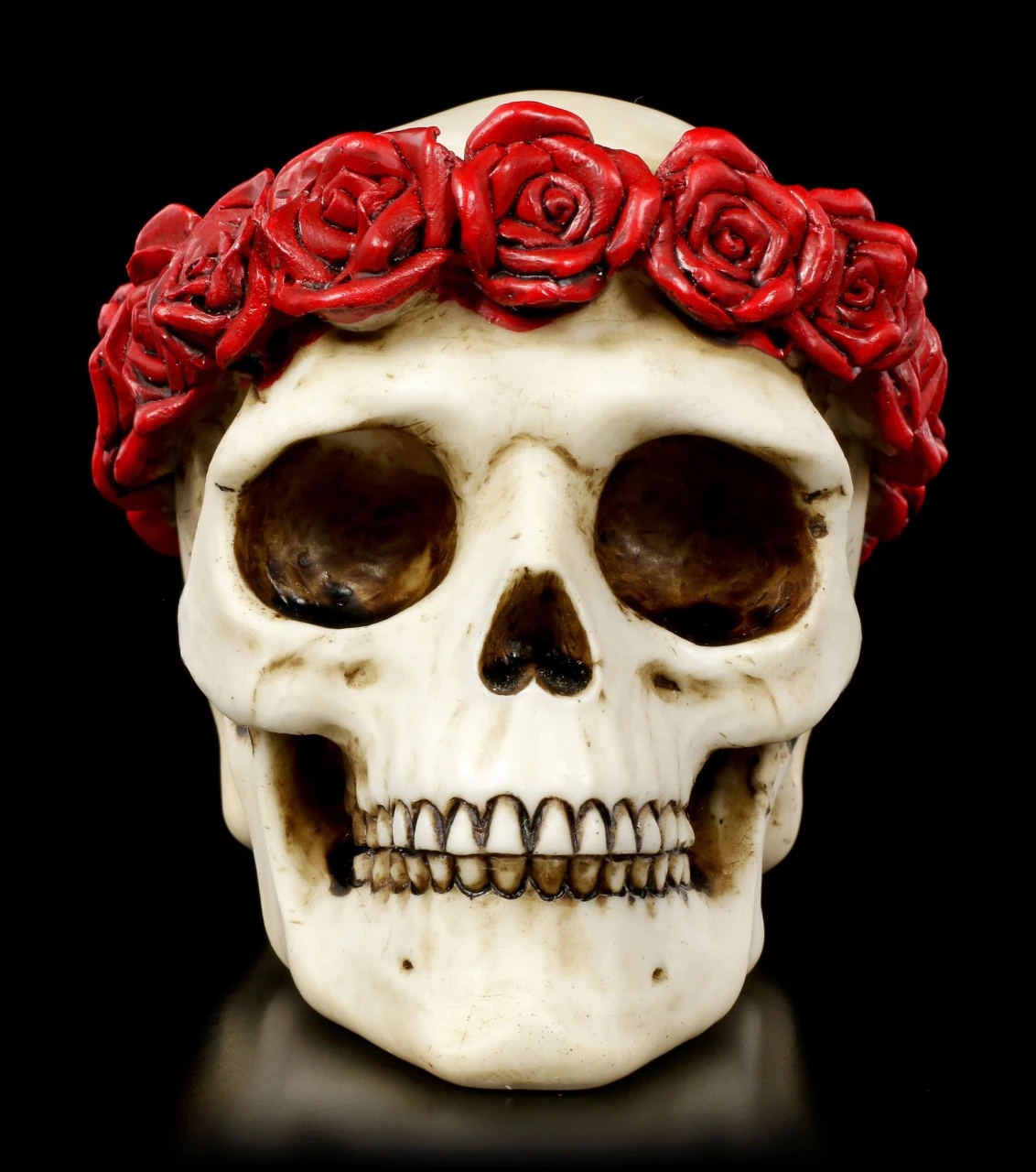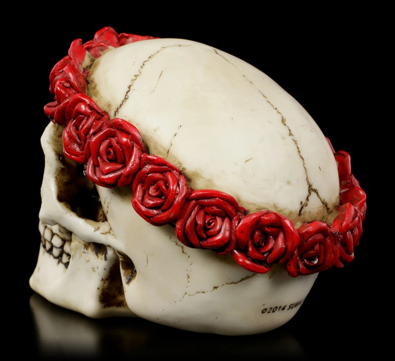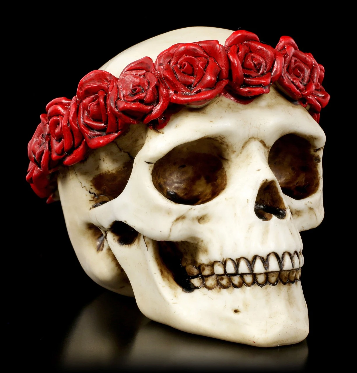 Den kleinen menschliche Schädel ziert eine Blumenkrone. Die roten Rosen stehen im wunderbaren Farbkontrast zu dem handbemaltem Totenkopf aus Kunststein (Polyresin) in knochenfarbenem Finish. Nicht nur für Gothic Fans ein tolles Geschenk.