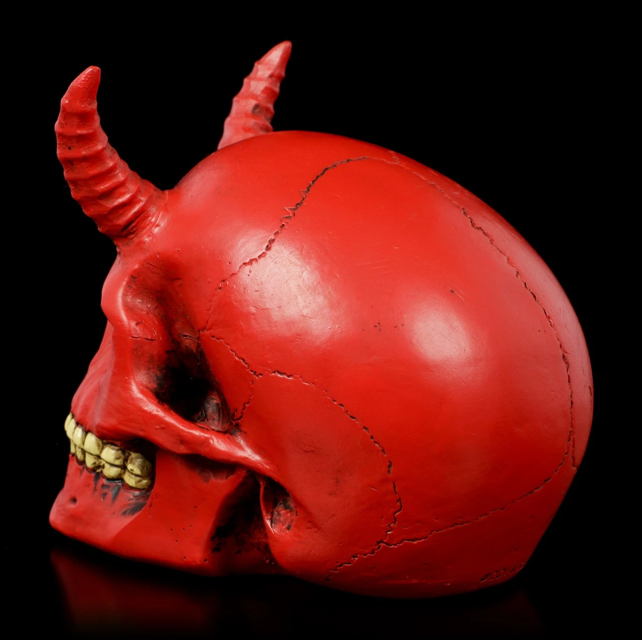 Der Höllenschädel! Welcher Dämon auch immer diesem Schädel innewohnt, die Besessenheit zeigt schon Ihre Spuren. Dem ehemaligen menschlichen Totenkopf sind zwei große gebogene Hörner gewachsen und die Knochen haben einen roten Ton angenommen. Der handbemalte Schädel aus Kunststein (Polyresin) ist eine Schönheit!