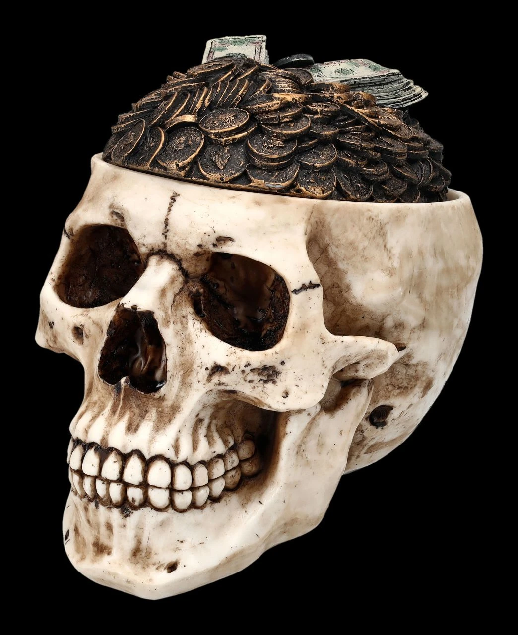 Hoffentlich kommt niemand in Versuchung, die Schädeldecke dieses Totenkopfes abzuheben, denn dann entdeckt er die geheimnisvolle Schatulle darunter, in der man perfekt Münzen oder andere kleine Kostbarkeiten aufheben kann. Aus der Schädeldeckel des Totenkopfes scheint ein Haufen Geld in Form von Scheine und Münzen hervorzuquellen. Die zahlreichen Details der knochenfarben handbemalten Schädelschatulle aus Kunststein (Polyresin) sind einfach faszinierend. Der 13 cm hohe, 11 cm breite und 16 cm tiefe Schädel hat innen eine Öffnung mit den Maßen H 7 cm x B 6 cm x T 10 cm für besondere kleine Kostbarkeiten.