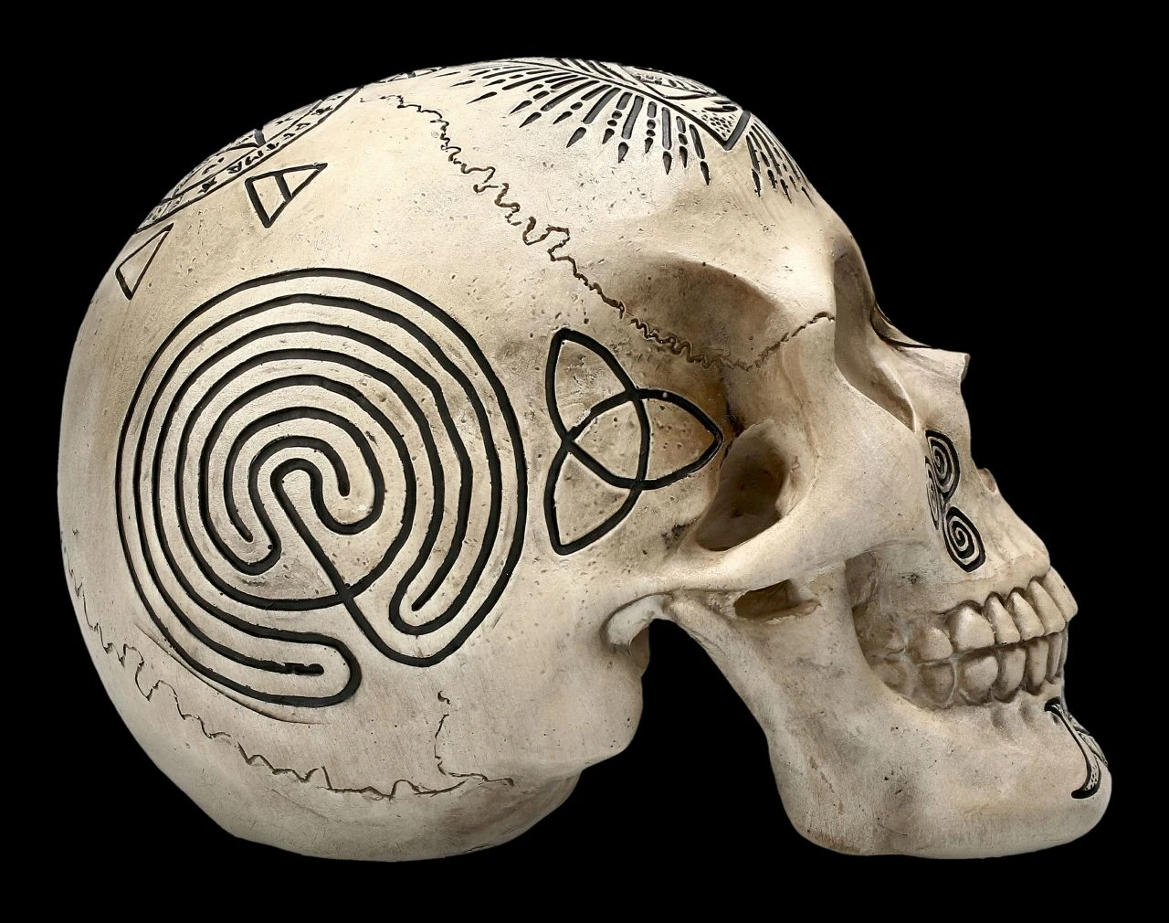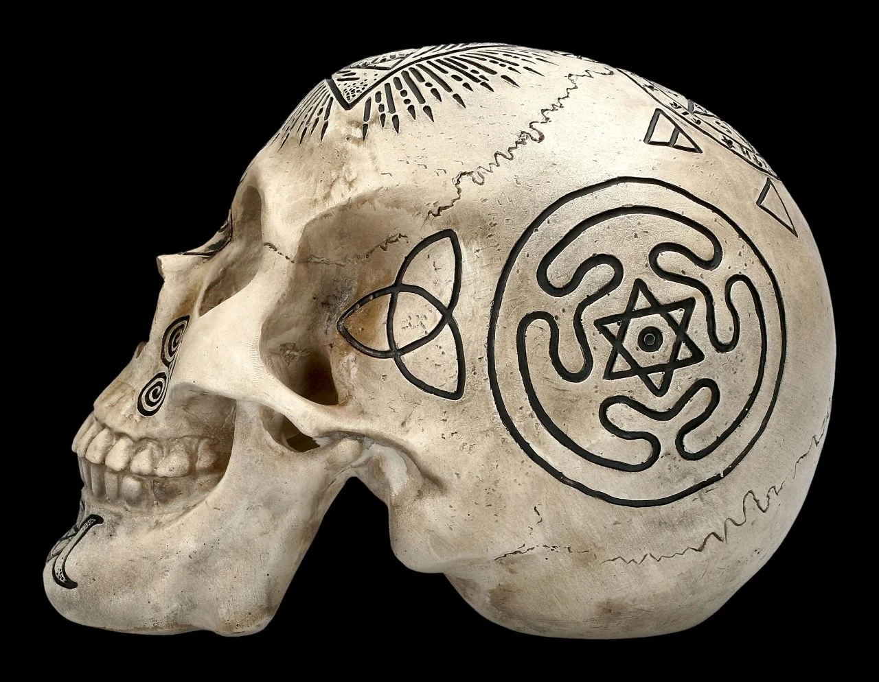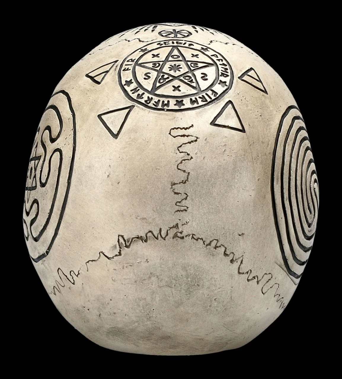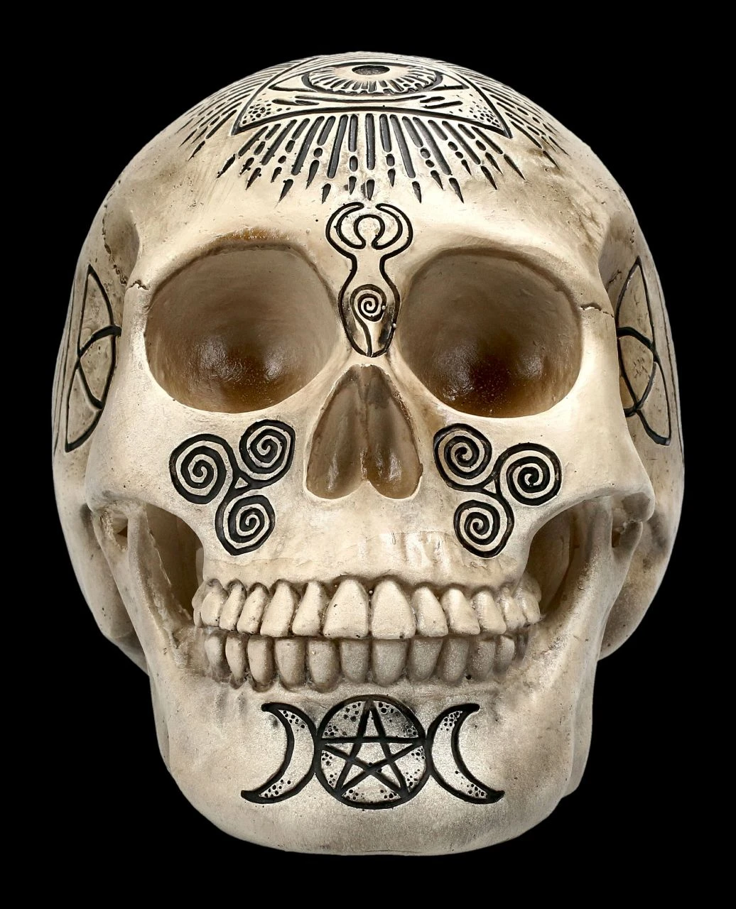 Für Hexen und Magier ist dieser handbemalte Totenschädel ein unverzichtbares Zubehör für ihre Rituale. Der coole Totenschädel mit den Zeichen der Spiralgötttin und dem Wiccazeichen mit dem Pentagramm in der Mitte ist sorgsam aus handbemaltem Kunststein (Polyresin) gefertigt. Er ist 12,5 cm hoch, 12 cm breit und 16,5 cm tief. Der Totenschädel Witchcraft ist ein magischer und effektvoller Blickpunkt.