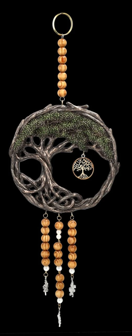 Die Wurzeln von Yggdrasil, der Weltesche aus der nordischen Mythologie, bilden bei diesem wunderschönen Traumfänger einen Kreis, der den germanischen Lebensbaum umrahmt. Das in den Zweigen hängende Medaillon zeigt ebenfalls den Lebensbaum. Der wunderbare, 32,5 cm hohe, 12,5 cm breite und 1,5 cm tiefe Traumfänger aus der Studio Collection von Veronese ist außerordentlich detailreich aus Kunststein (Polyresin), Metall, Holz und Holzperlen gearbeitet. Er wirkt auch durch die Bronzierung und feine Colorierung sehr effektvoll und dekorativ. Der außergewöhnliche Traumfänger ist auch ein sehr schönes Geschenk