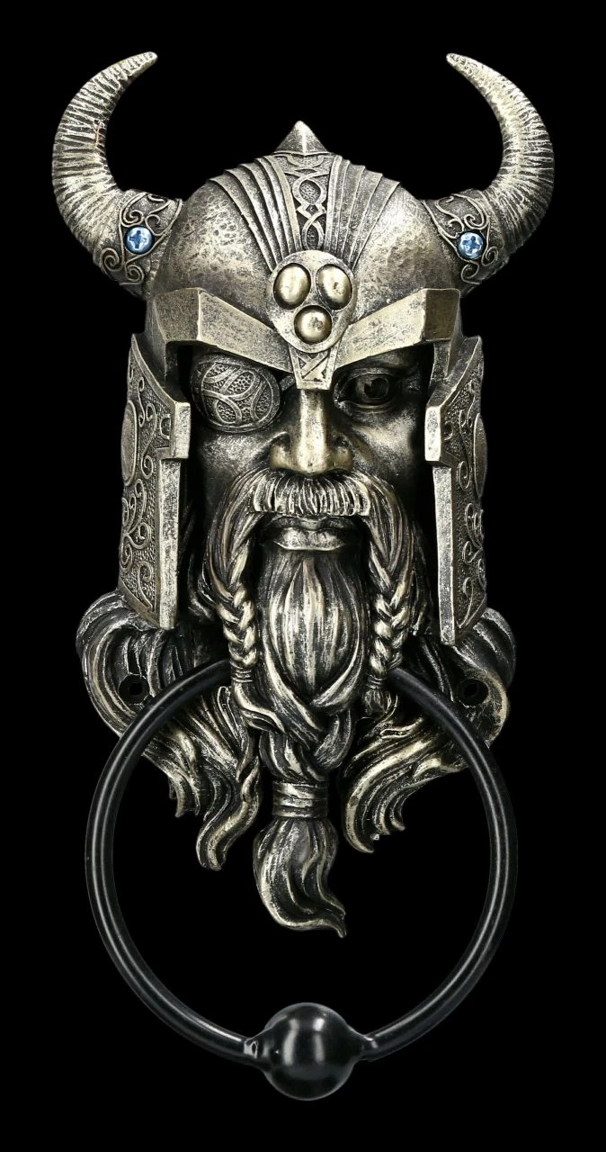 Etwas Mut und Selbstvertrauen gehört schon dazu, wenn man es wagt, unter dem beobachtenden Blick des Gottes Odin den Türklopfer zu bewegen. Der fantastische Türklopfer mit dem germanischen Gott ist beeindruckend detailreich aus handbemaltem Kunststein (Polyresin) und Metall gefertigt. Falls Sie ihn nicht an Ihrer Haustür anbringen können, so bewacht er mit seiner Höhe von 23 cm, der Breite von 11,5 cm und der Tiefe von 4 cm auch perfekt eine Tür zu Ihrem sehr persönlichen Bereich in Ihrem Zuhause.