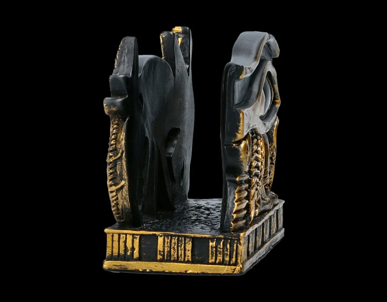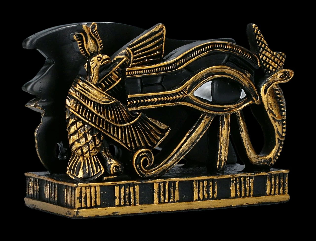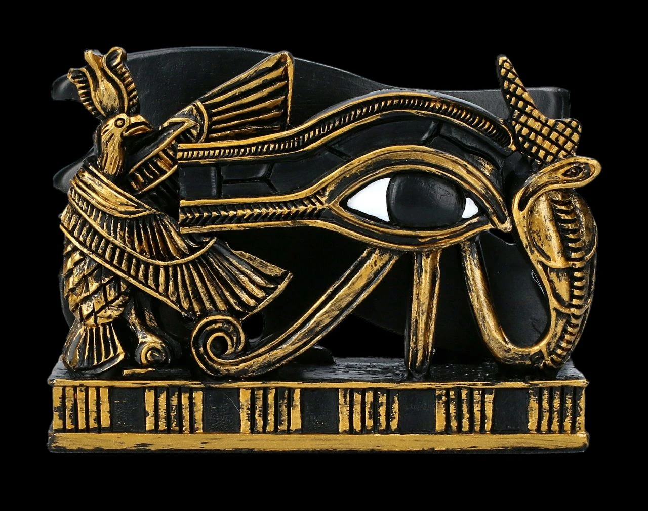 Auf einer Seite ist bei diesem faszinierenden Visitenkartenhalter das linke von Thot geheilte Auge des Himmels- und Lichtgottes Horus dargestellt, während auf der anderen Seite als Auge des Ra die Sonne symbolisiert. Nicht nur Ägypten Fans werden von diesem großartigen, schwarz- und goldfarbenen Visitenkartenhalter aus handbemalten und detailreich aus Kunststein (Polyresin) gefertigtem Visitenkartenhalter begeistert sein. Zwischen den beiden Augen ist ausreichend Platz für die stilvolle Unterbringung Ihre Visitenkarten. Der repräsentative, 7 cm hohe, 9,5 cm breite und 4,5 cm tiefe Visitenkartenhalter ist ein effektvoller Blickfang auf jedem Schreibtisch.