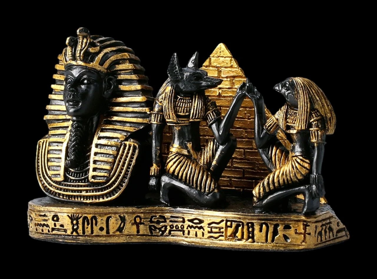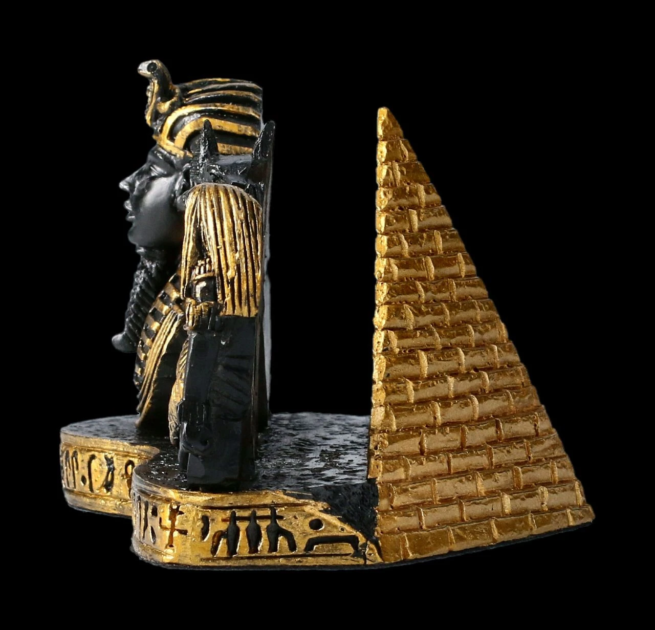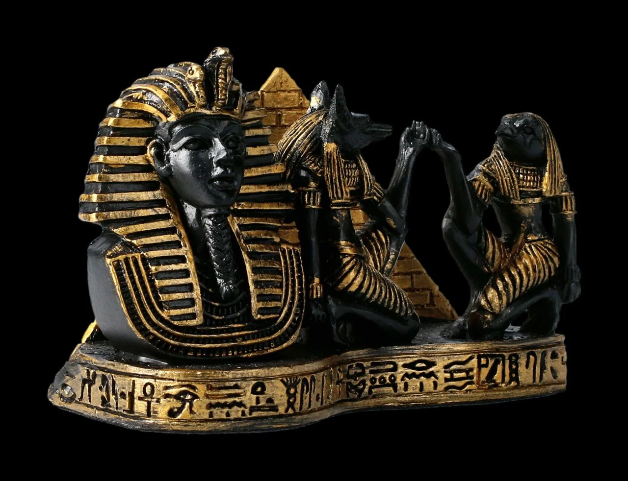 Nicht nur Ägypten Fans werden von diesem großartigen, schwarz- und goldfarbenen Visitenkartenhalter aus detailreich gefertigtem und fein handbemaltem Kunststein (Polyresin) begeistert sein. Vor einer goldfarbenen Pyramide steht auf einem mit ägyptischen Zeichen versehenen Sockel die schön geformten Büste des Tutanchamun und daneben, einander zugewandt, die Figuren des Schakalgottes Anubis und des falkenköpfigen Gottes Horus. Zwischen der Pyramide und den Figuren ist genügend Platz für Ihre Visitenkarten. Der repräsentable, 6,5 cm hohe, 9,5 cm breite und 7,5 cm tiefe Visitenkartenhalter ist ein stilvoller Blickfang auf jedem Schreibtisch.