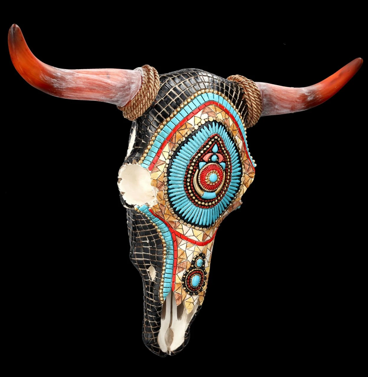 Rot geflammte Hörner und ein wunderbar buntes Western Mosaik in indianischem Muster und Farben zieren diesen prächtigen Bison-Schädel. Der mit dem Western-Mosaik handbemalte Totenkopf Bison wurde sorgfältig aus Kunststein (Polyresin) gefertigt. Er ist 27 cm hoch, 33 cm breit und 9 cm tief und ist zum Hängen. Er ist eine imposante Wanddeko, die sofort alle Blicke auf sich ziehen wird und ein fantastisches Geschenk für alle Western-Fans.