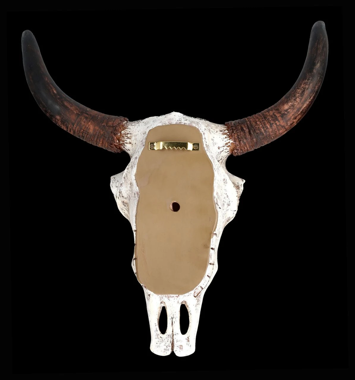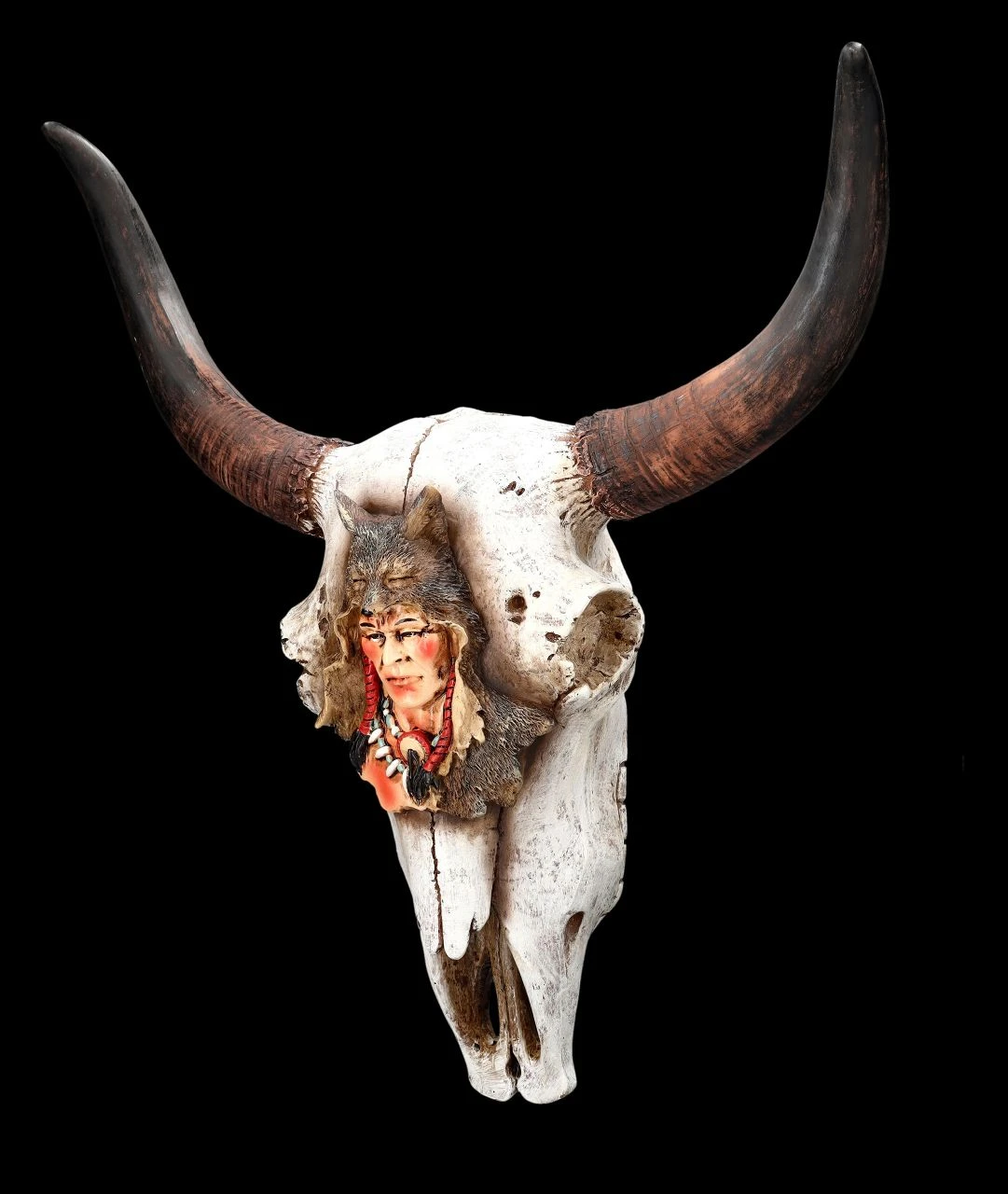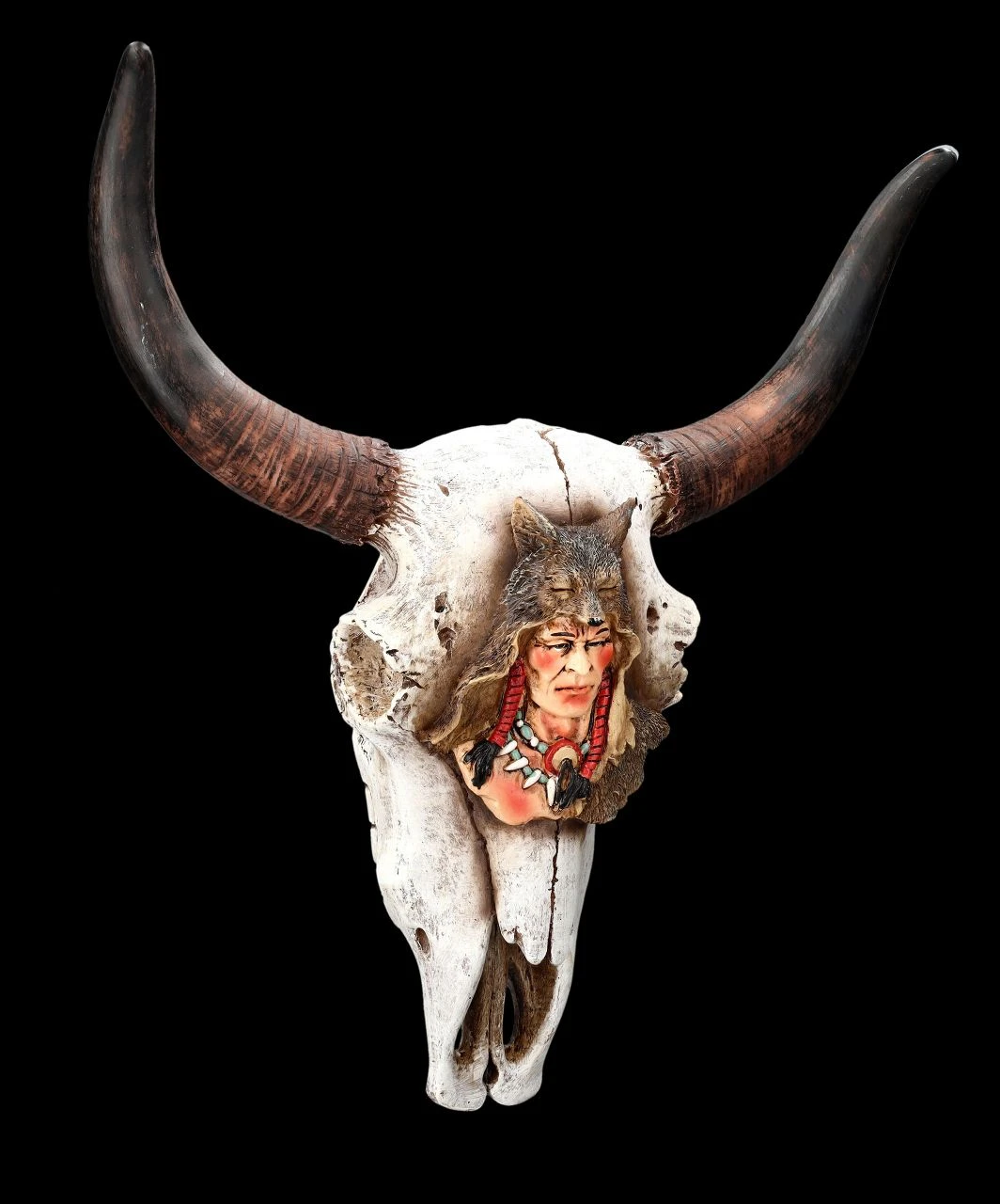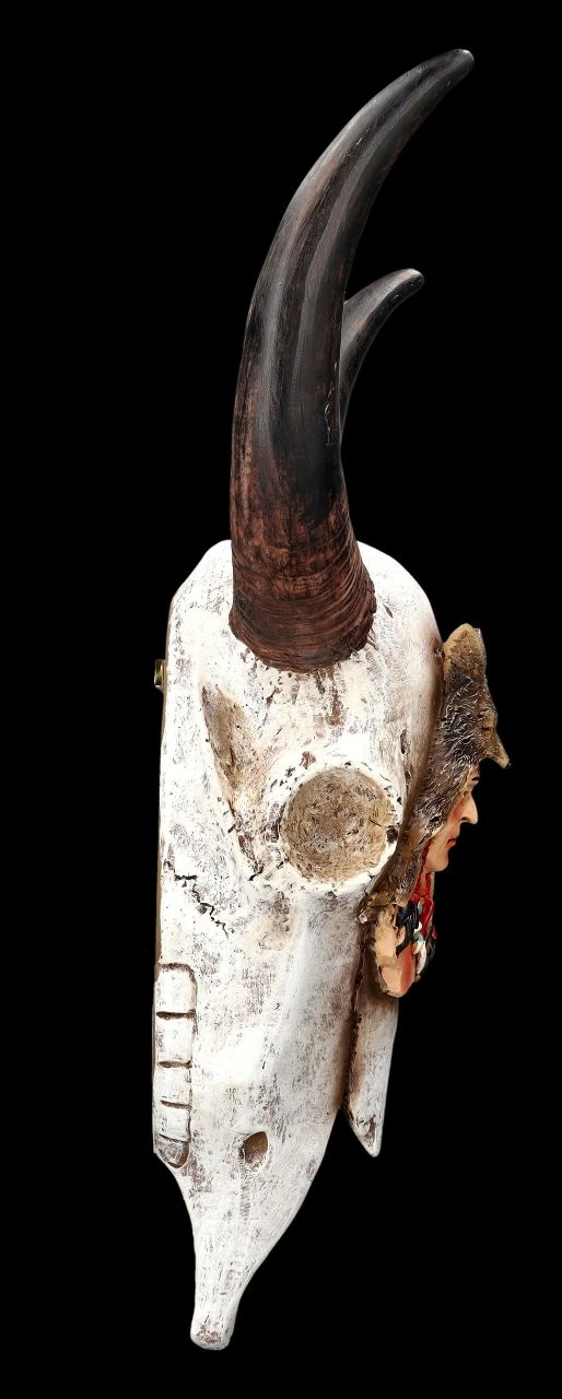 Braun-schwarz geflammte Hörner und ein imposanter Indiianer-Häuptling zieren diesen prächtigen Kuh-Schädel. Der 35 cm hohe, 31 cm breite und 10 cm tiefe Kuh-Totenkopf mit dem Indianer Relief.wurde sorgfältig aus Kunststein (Polyresin) gefertigt und aufwändig handbemalt. Eine imposante Wanddeko zum Hängen, die auch in jedem Westernsaloon sofort alle Blicke auf sich ziehen wird. Für alle Western-Fans ist diese Wanddeko aber auch ein fantasievolles Geschenk.